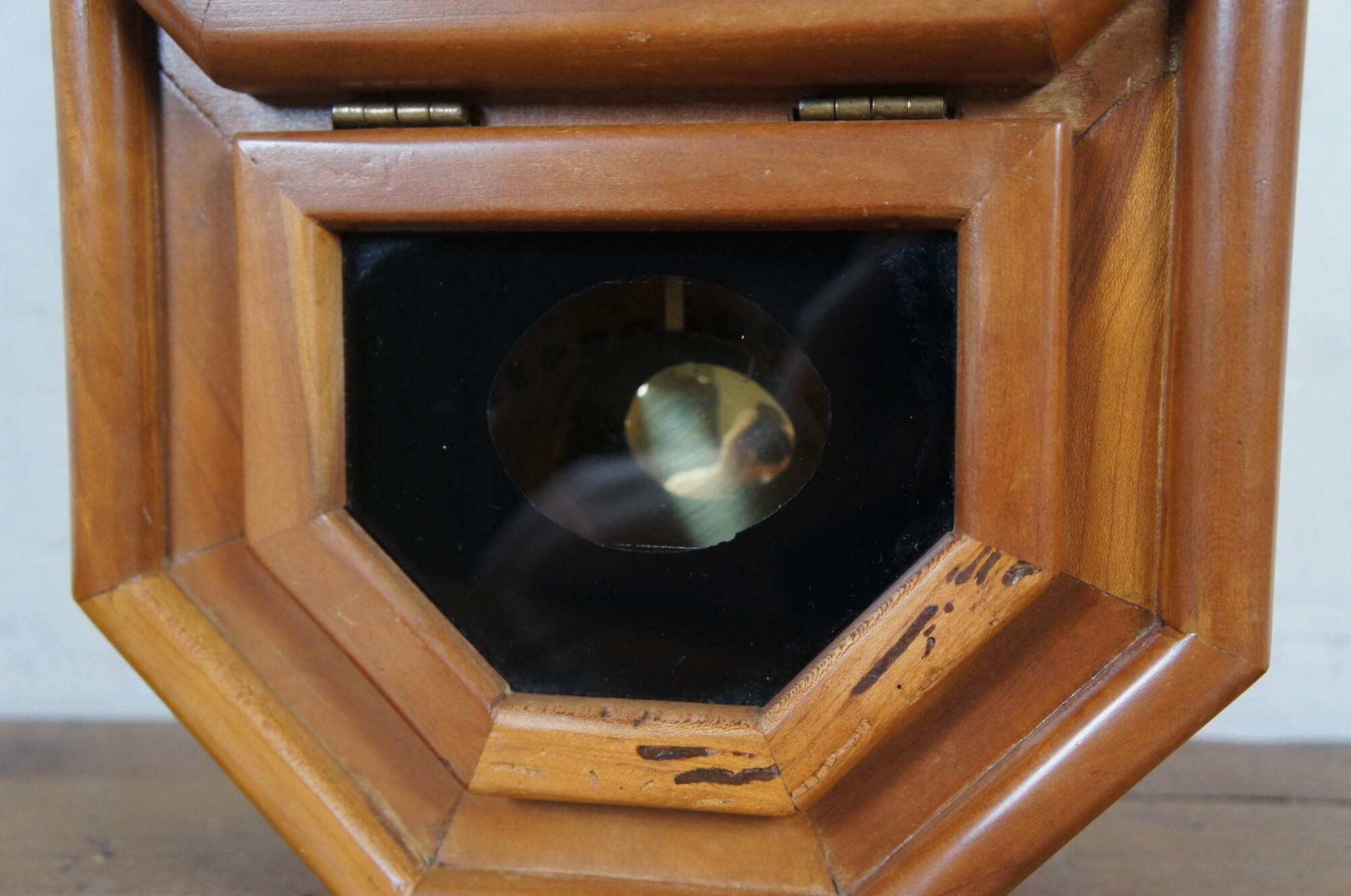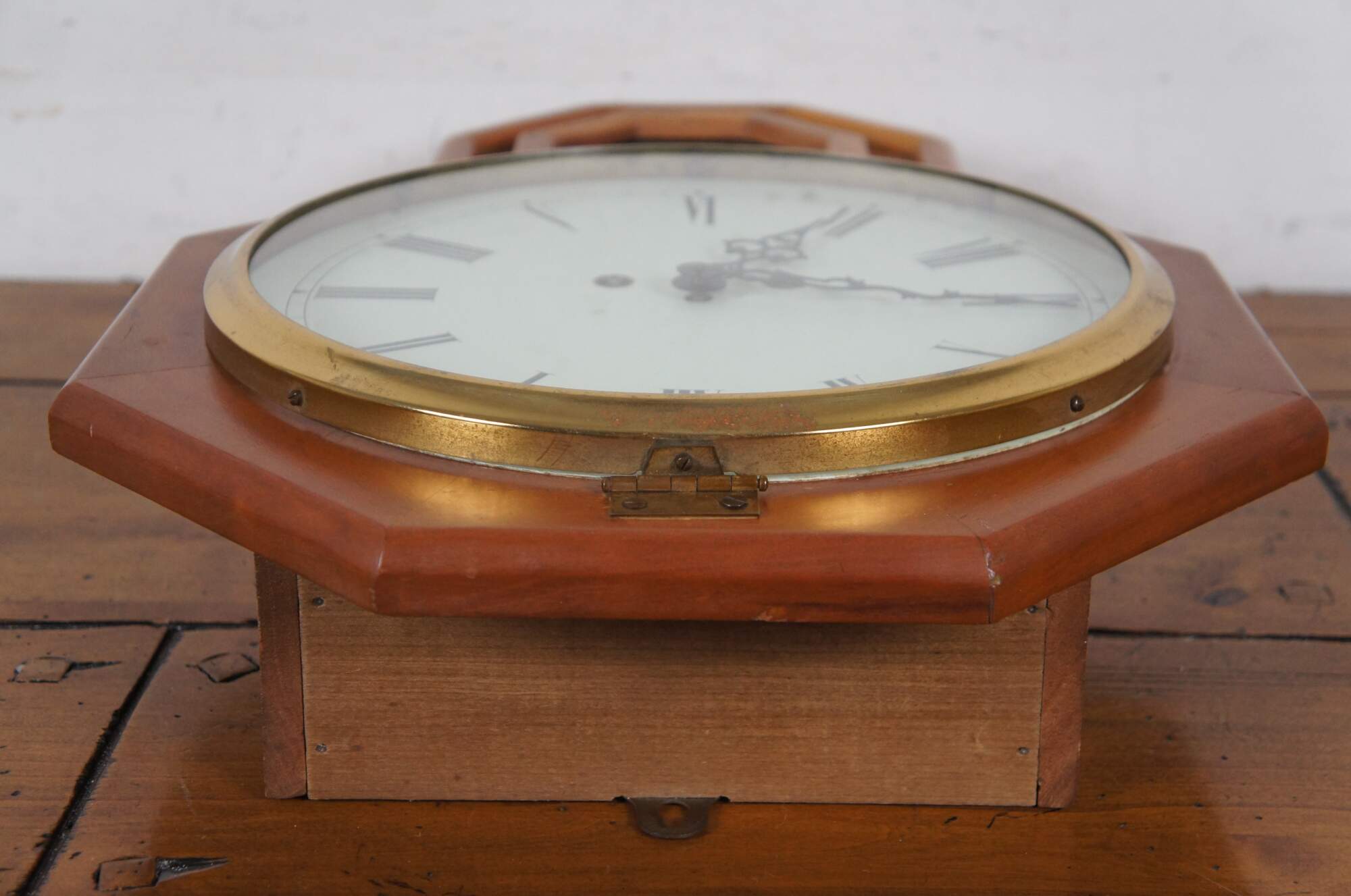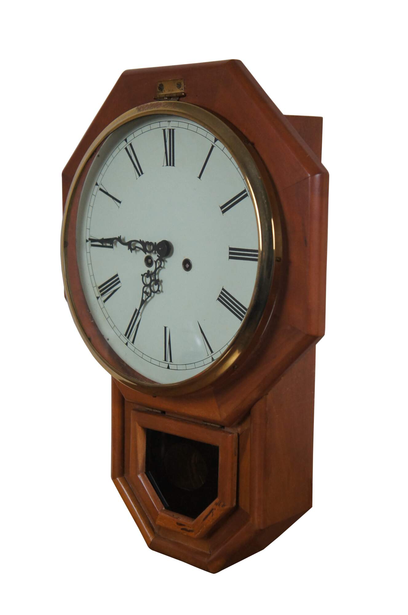 Early to mid 20th century German Mason & Sullivan 8 day, key wound, chiming, school house regulator wall clock. Octagonal wood case with pentagonal drop for the pendulum. Brass pendulum peeks through black, reverse painted window. White painted metal face with black Roman numerals and scrolled/ornate black hands; brass frame. Movement marked number 69 - Mason & Sullivan Co - No (0) Jewels - Made in West Germany - Unadjusted - 141-070. Paper label behind pendulum reads "Reproduction Clocks - Steeples, Regulators, Pillar & Scroll, Banjo - Allen Thompson - Yellowstone Road Xenia, Ohio 45365.