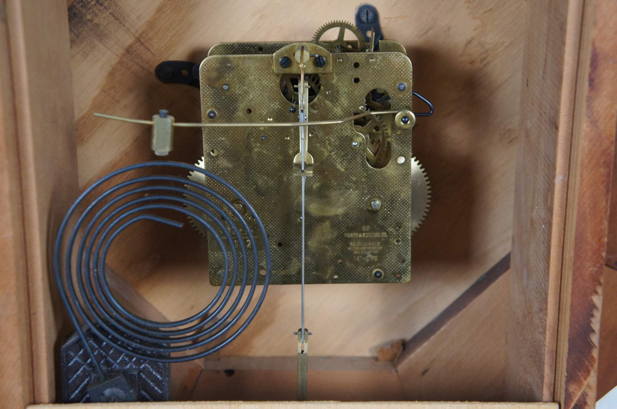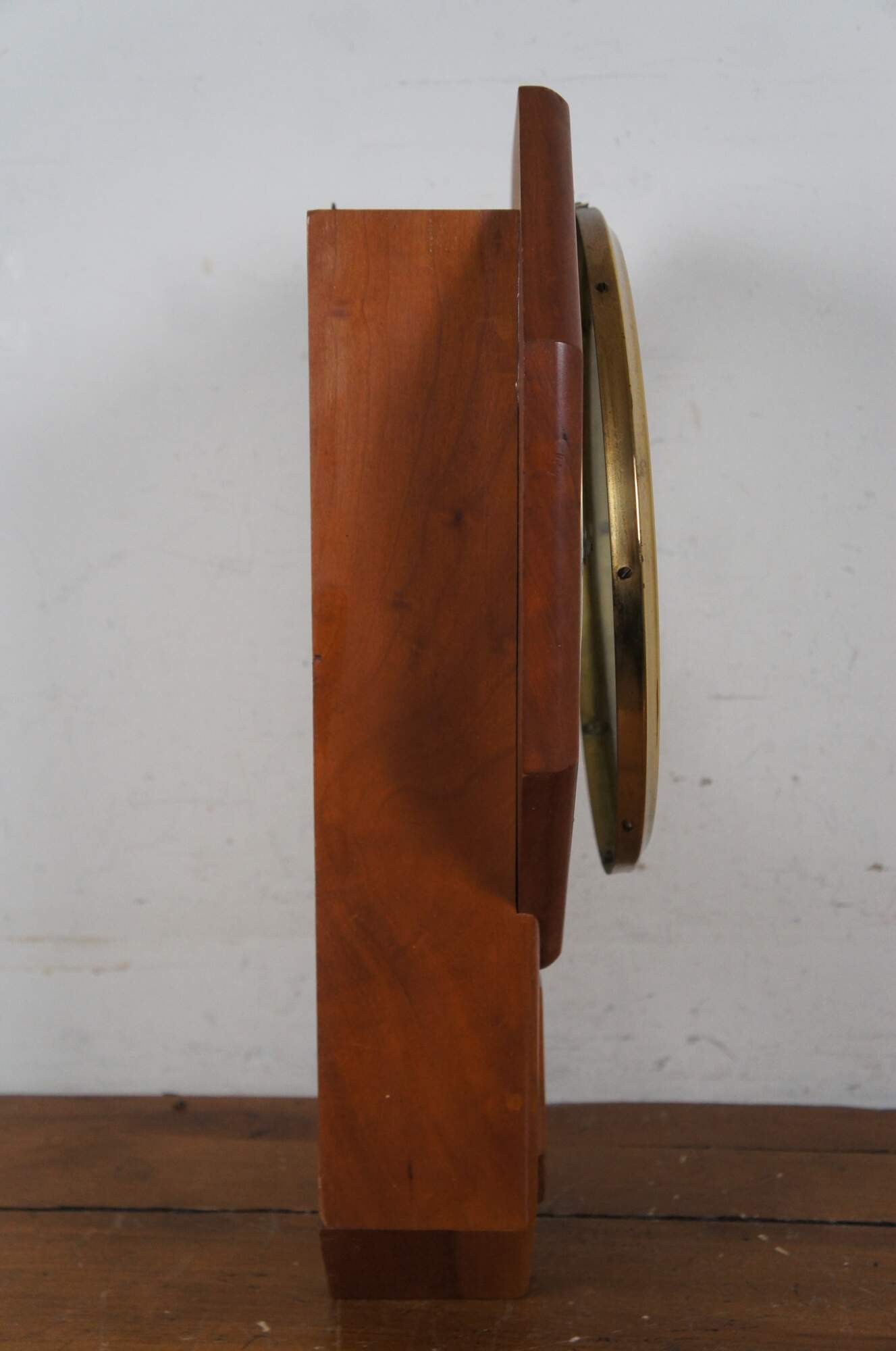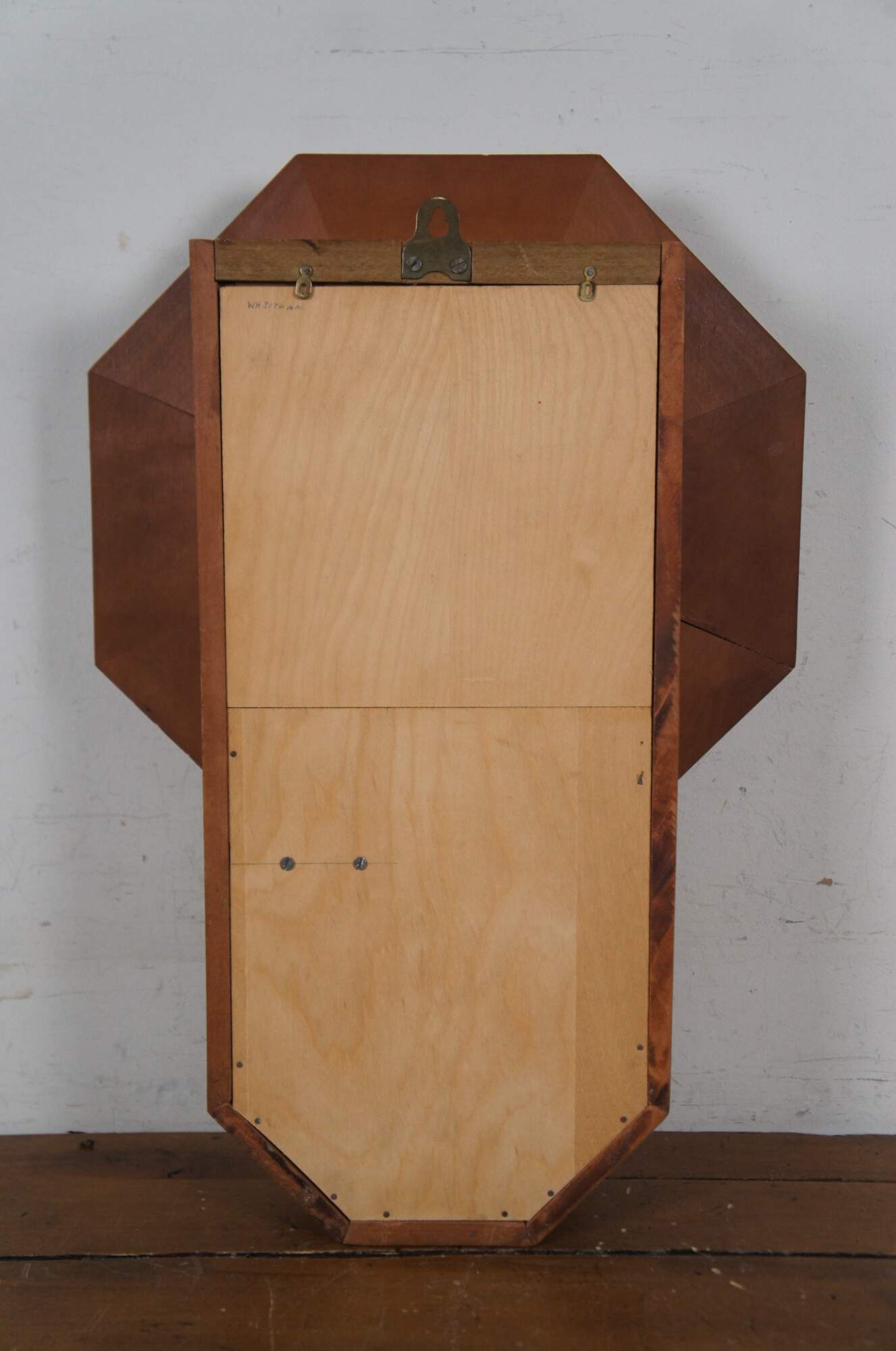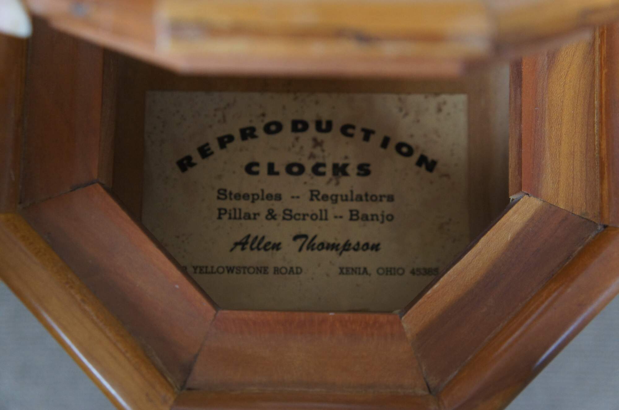 Early to mid 20th century German Mason & Sullivan 8 day, key wound, chiming, school house regulator wall clock. Octagonal wood case with pentagonal drop for the pendulum. Brass pendulum peeks through black, reverse painted window. White painted metal face with black Roman numerals and scrolled/ornate black hands; brass frame. Movement marked number 69 - Mason & Sullivan Co - No (0) Jewels - Made in West Germany - Unadjusted - 141-070. Paper label behind pendulum reads "Reproduction Clocks - Steeples, Regulators, Pillar & Scroll, Banjo - Allen Thompson - Yellowstone Road Xenia, Ohio 45365.