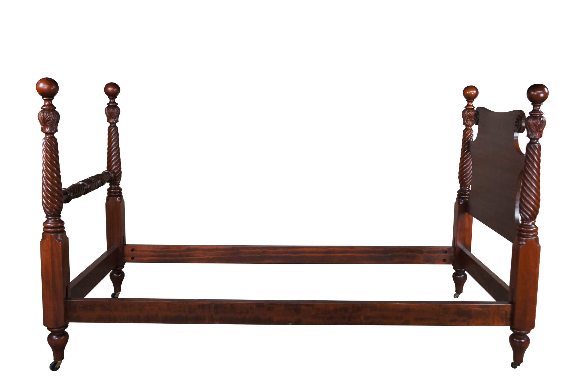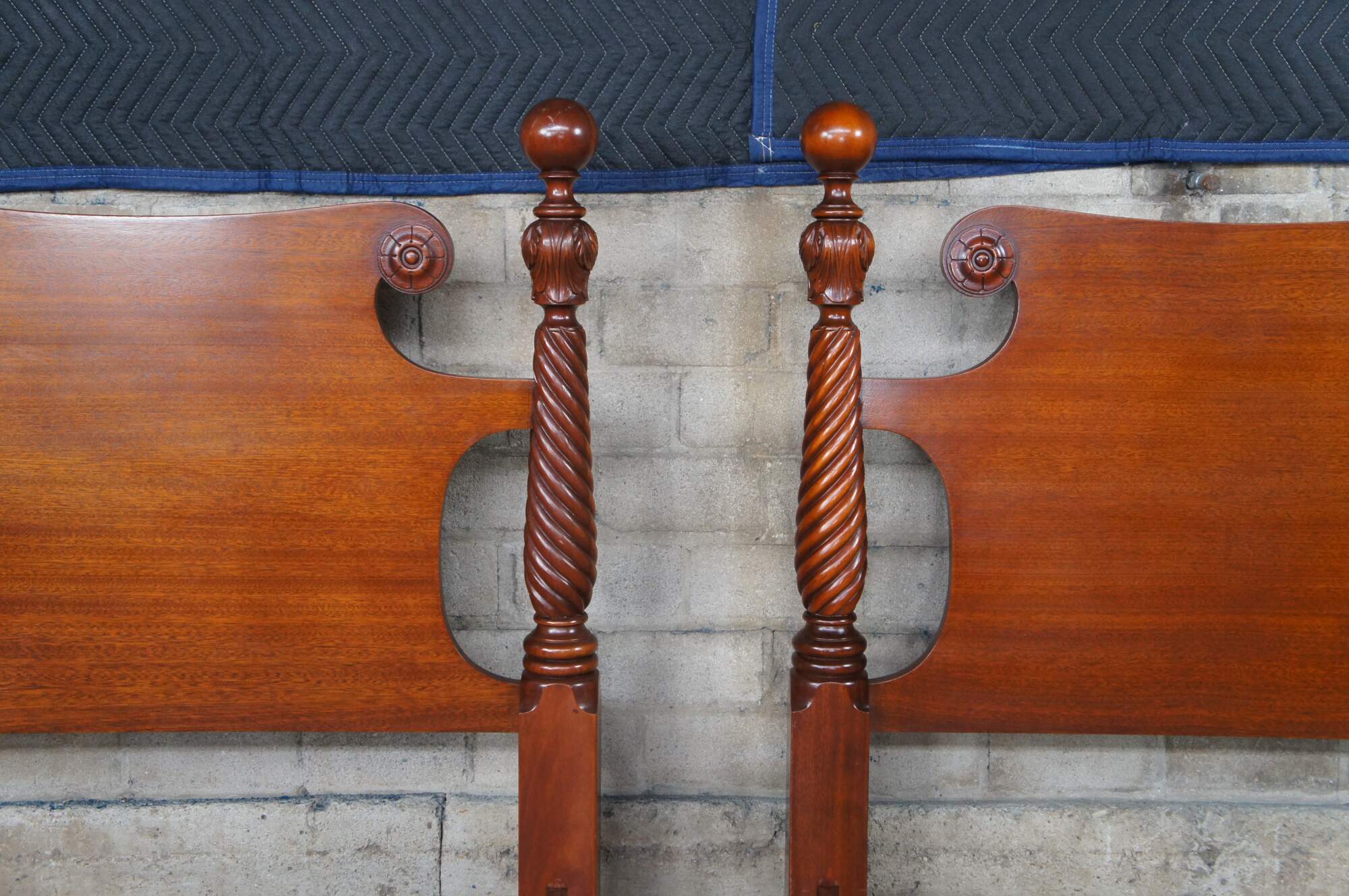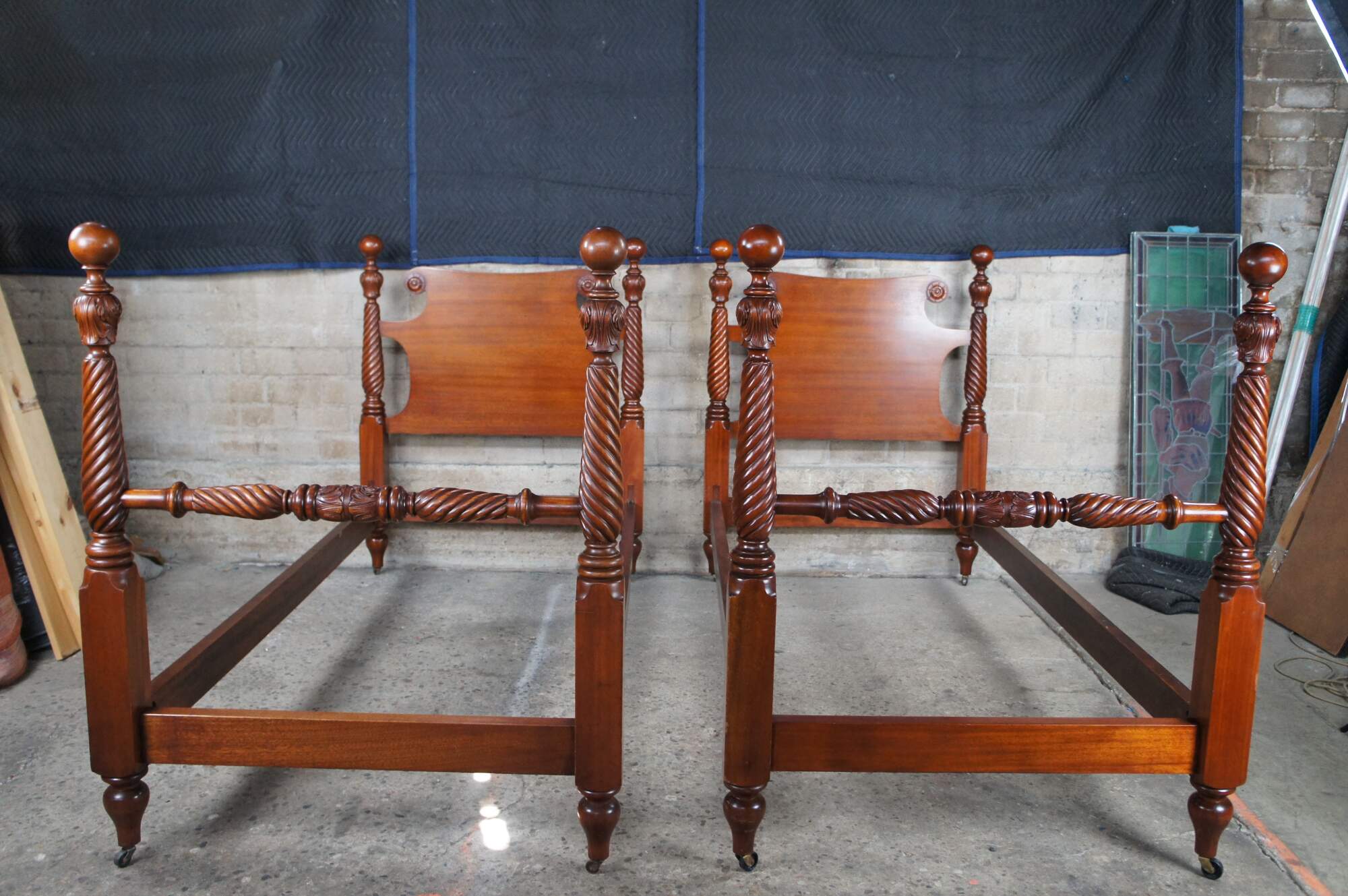 Pair of early 20th century twin size Cannonball beds. Features a solid mahogany frame with barley twisted, ribbed and acanthus carved posts. The beautiful Federal shaped headboards are accented by carved medallions. Each post is supported by a turned turnip foot leading to a caster.