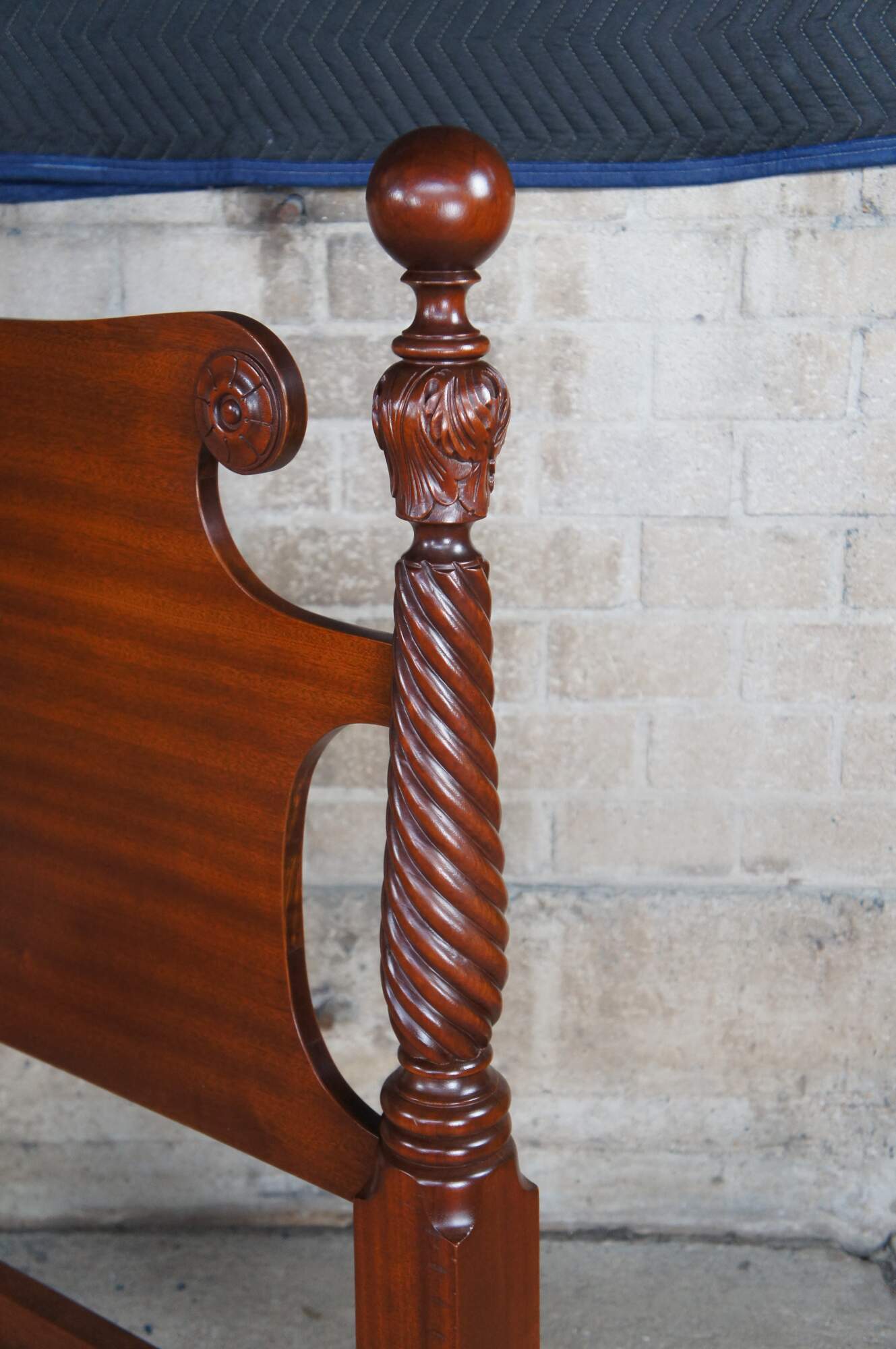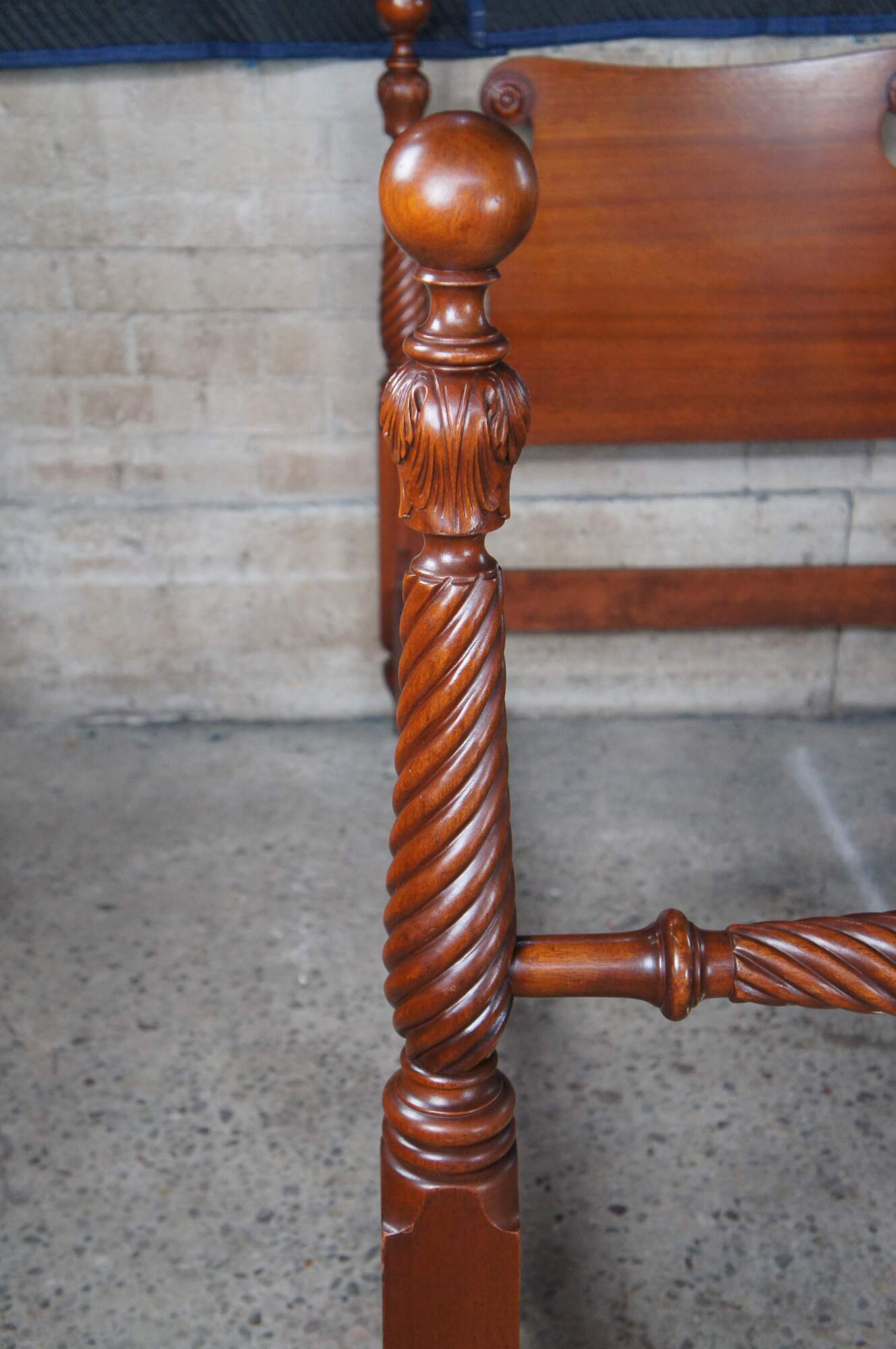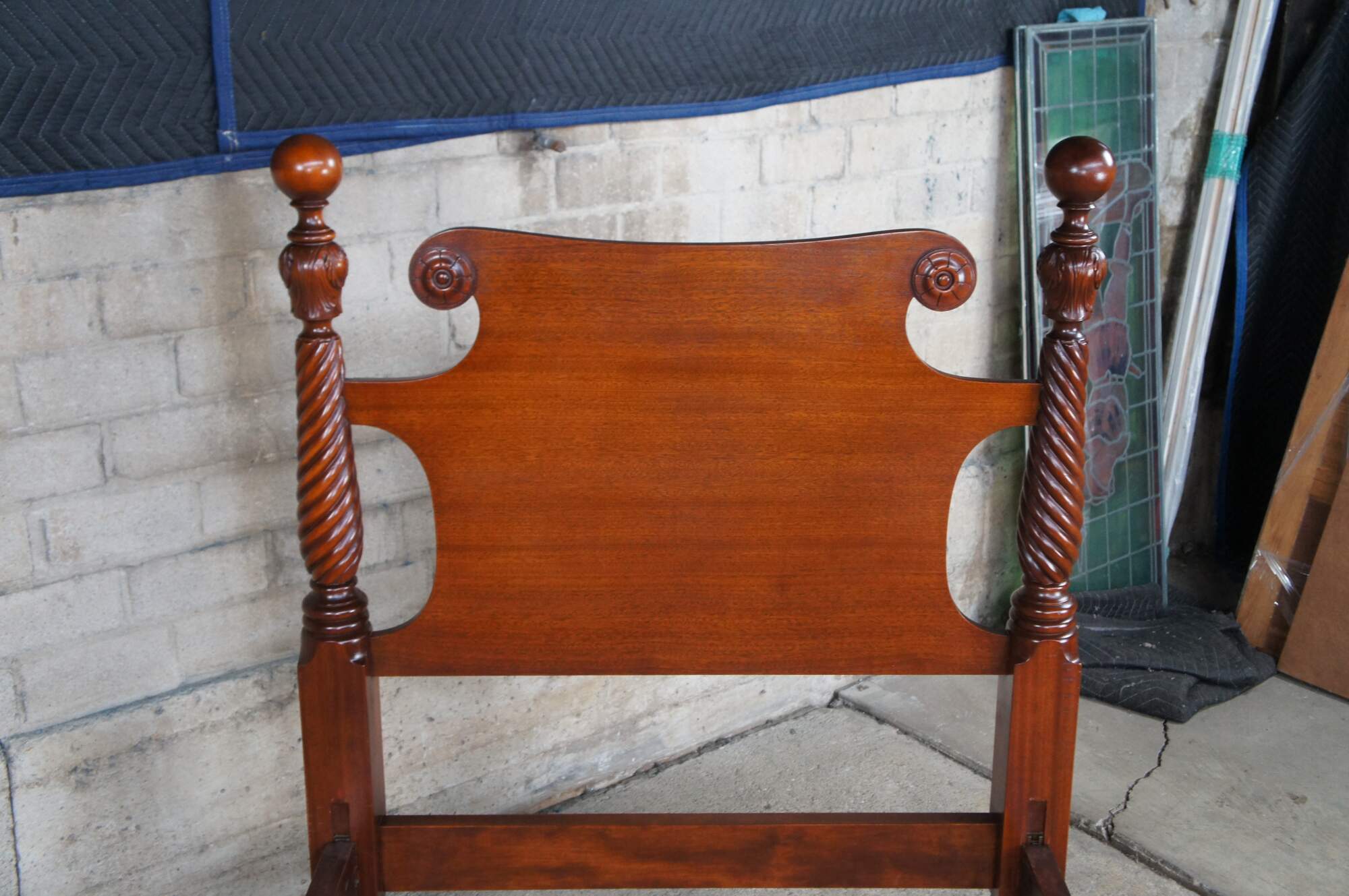 Pair of early 20th century twin size Cannonball beds. Features a solid mahogany frame with barley twisted, ribbed and acanthus carved posts. The beautiful Federal shaped headboards are accented by carved medallions. Each post is supported by a turned turnip foot leading to a caster.