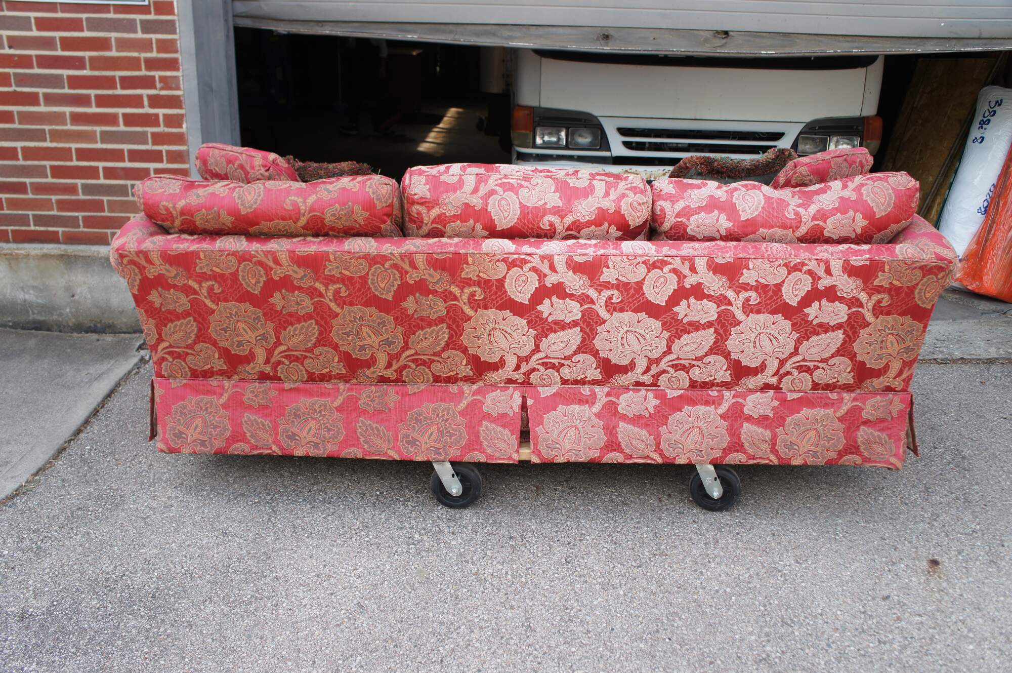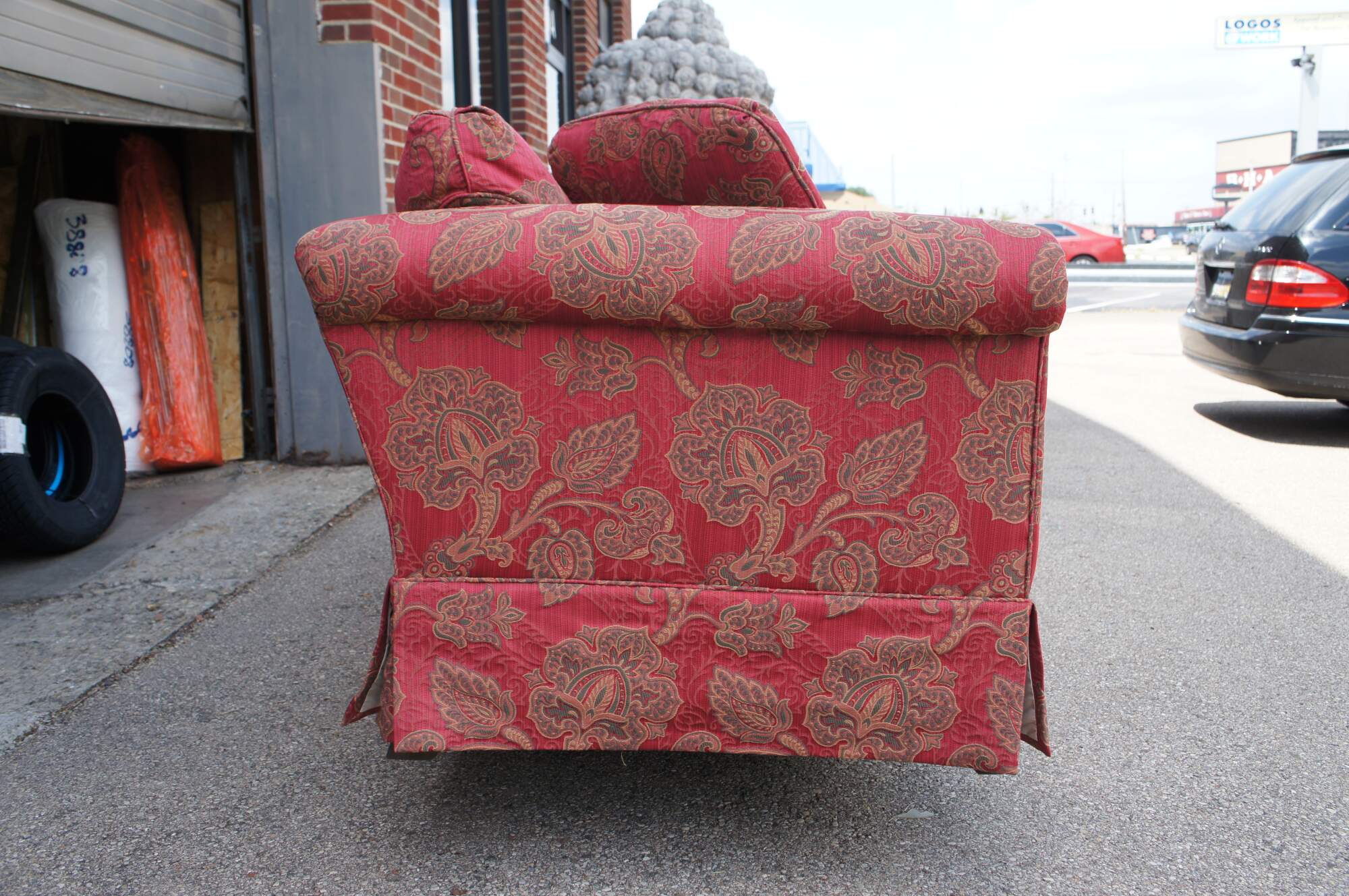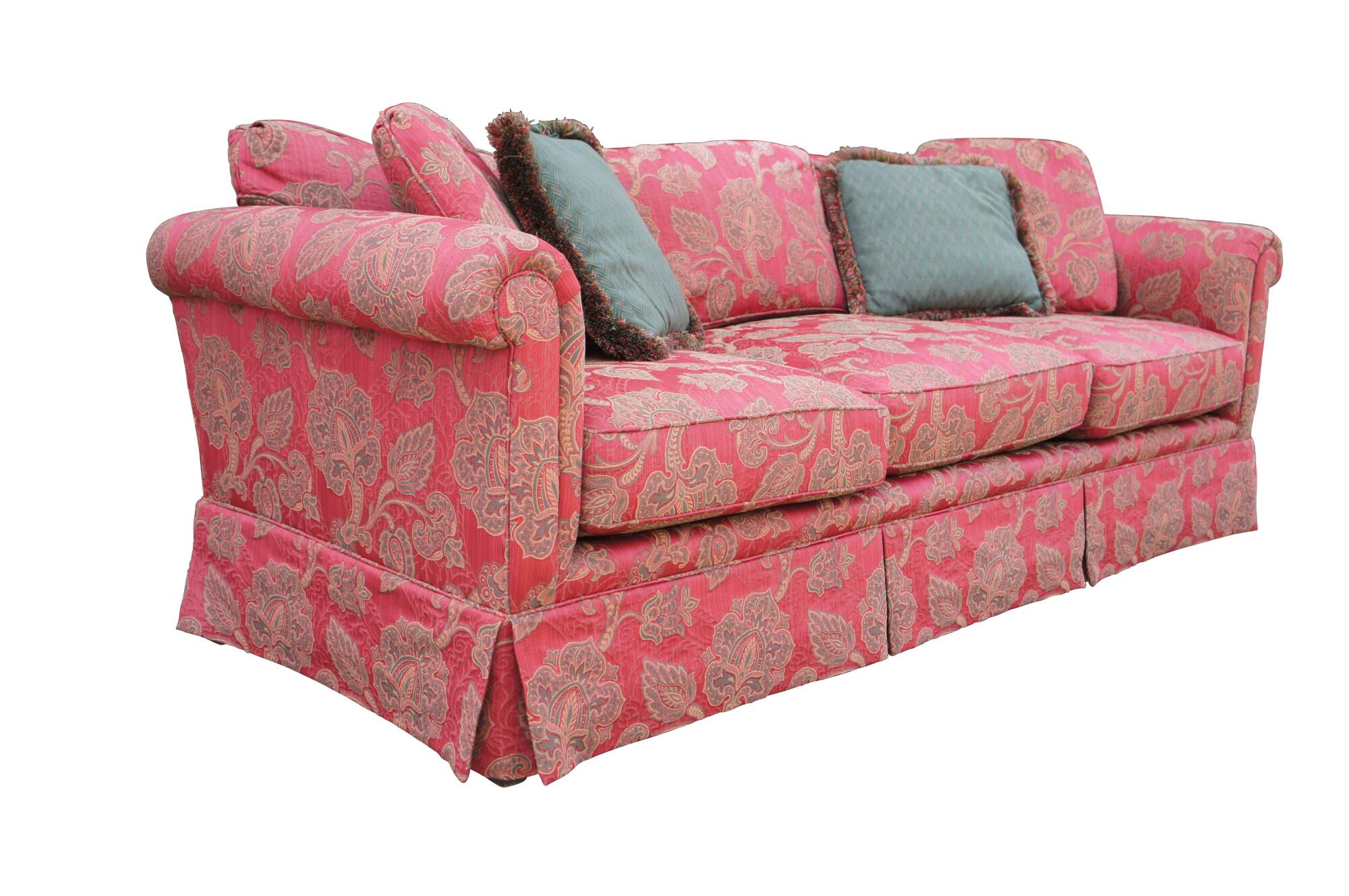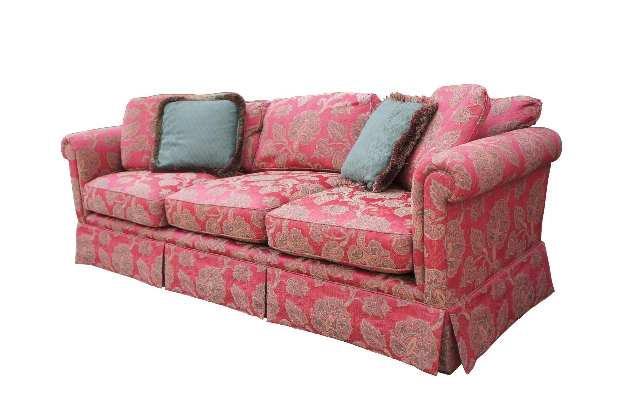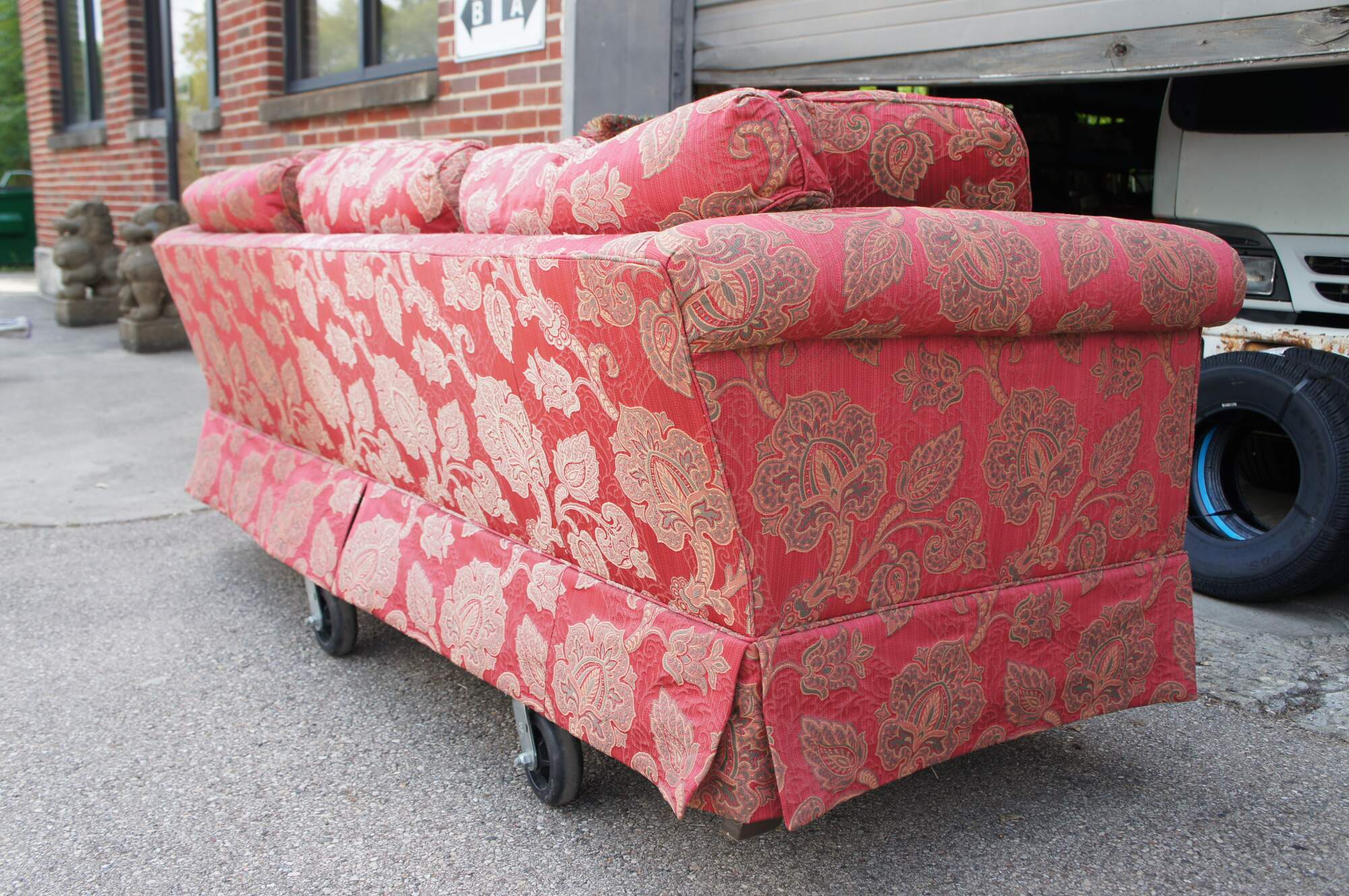 Vintage Baker Furniture three seat sofa or couch featuring red paisley upholstered fabric with rolled arms and skirted base. Includes two green lumbar throw pillows.
