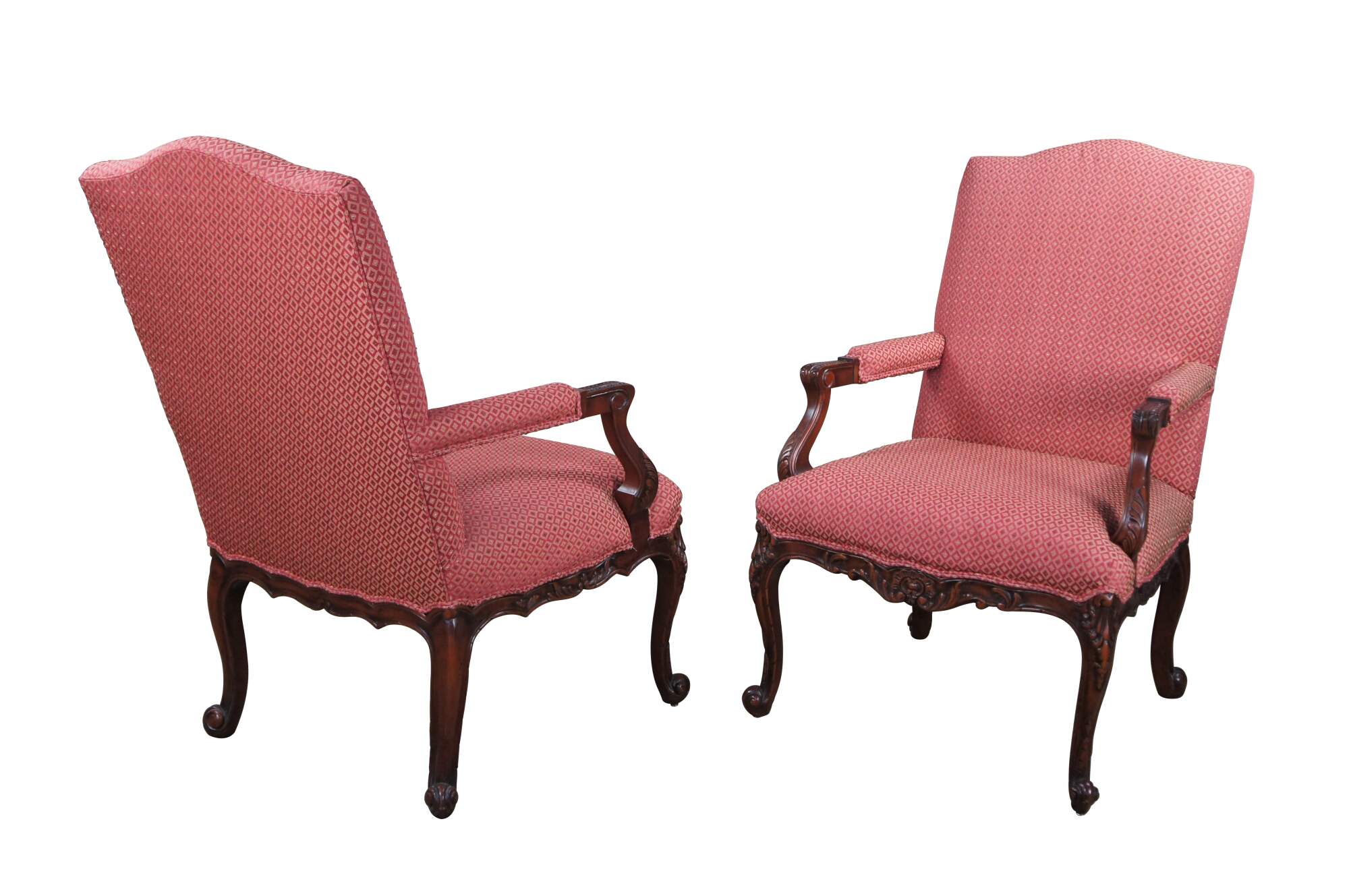 Pair of Baker Furniture library or lounge arm chairs, circa 1980s. Made of mahogany featuring French Louis XVI styling with domed / serpentine top, padded fauteuil arms, carved acanthus foliate motif and cabriole legs. Very comfortable.