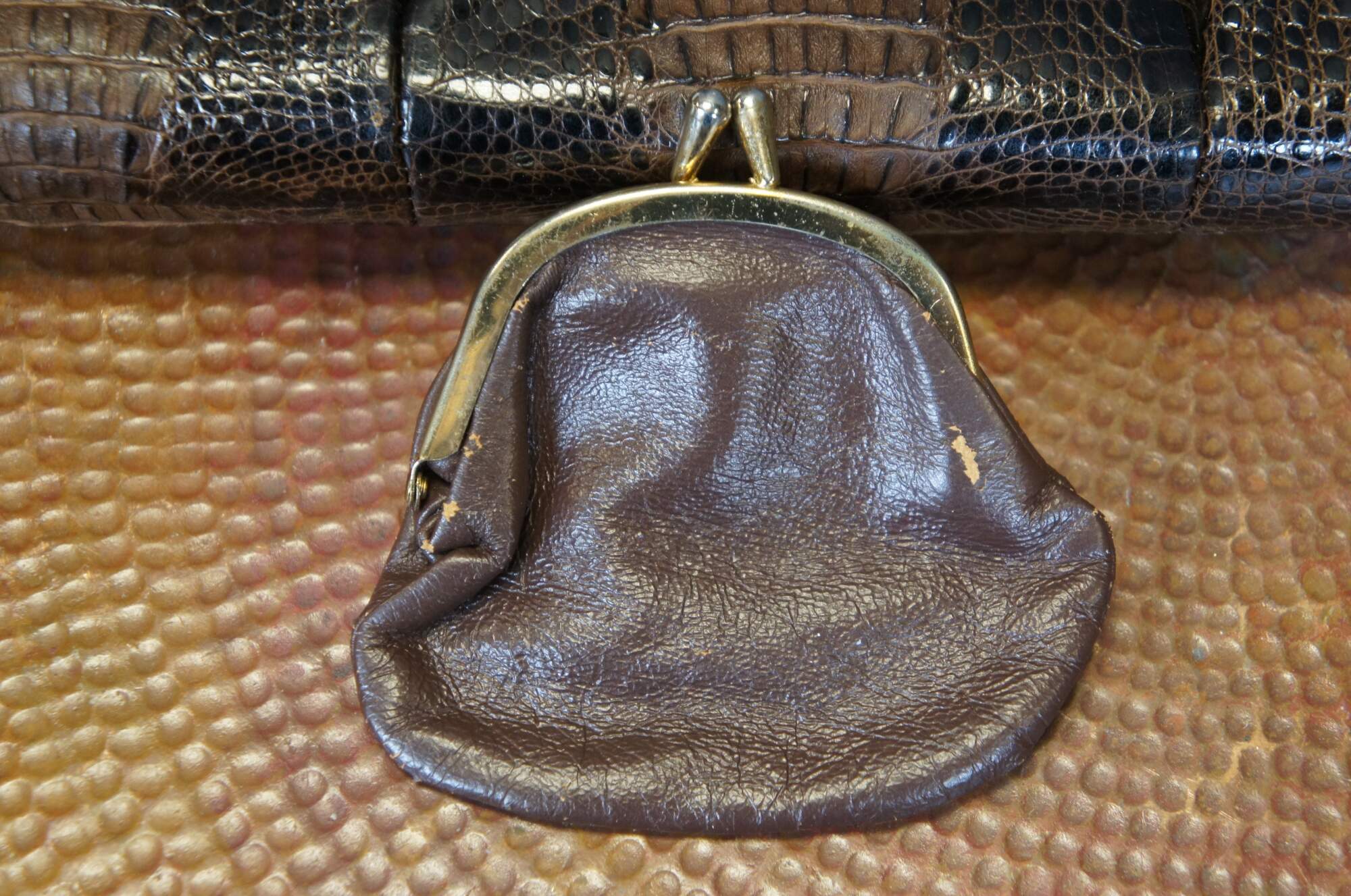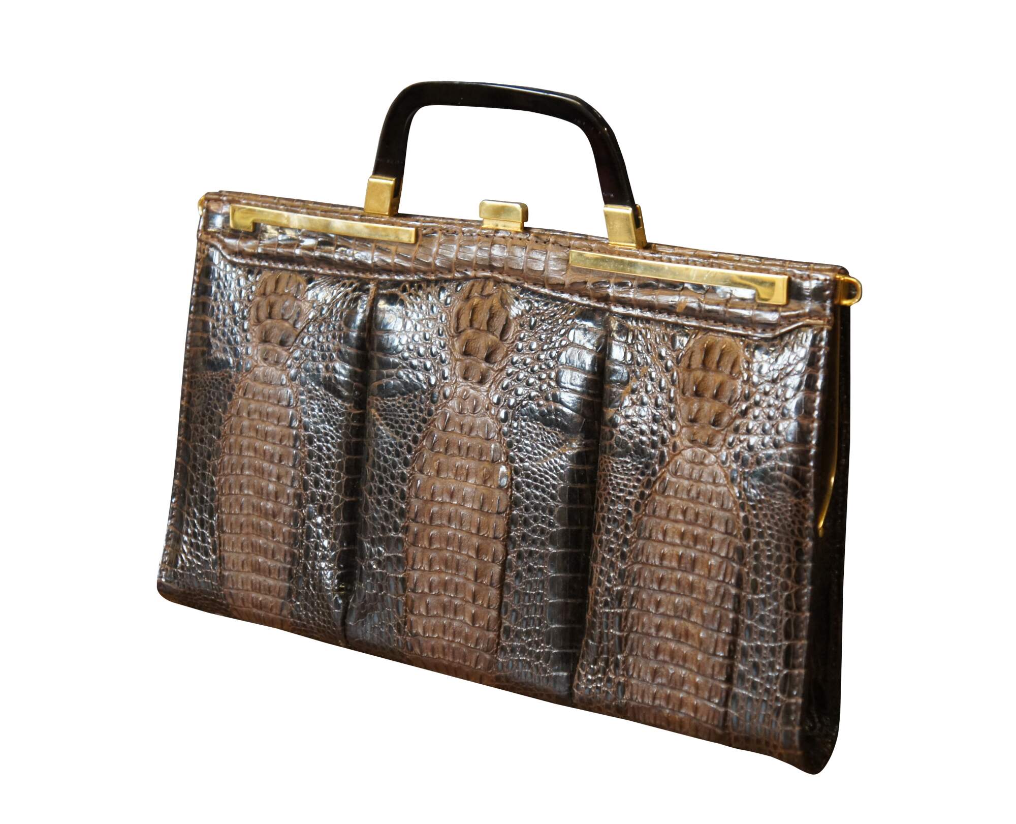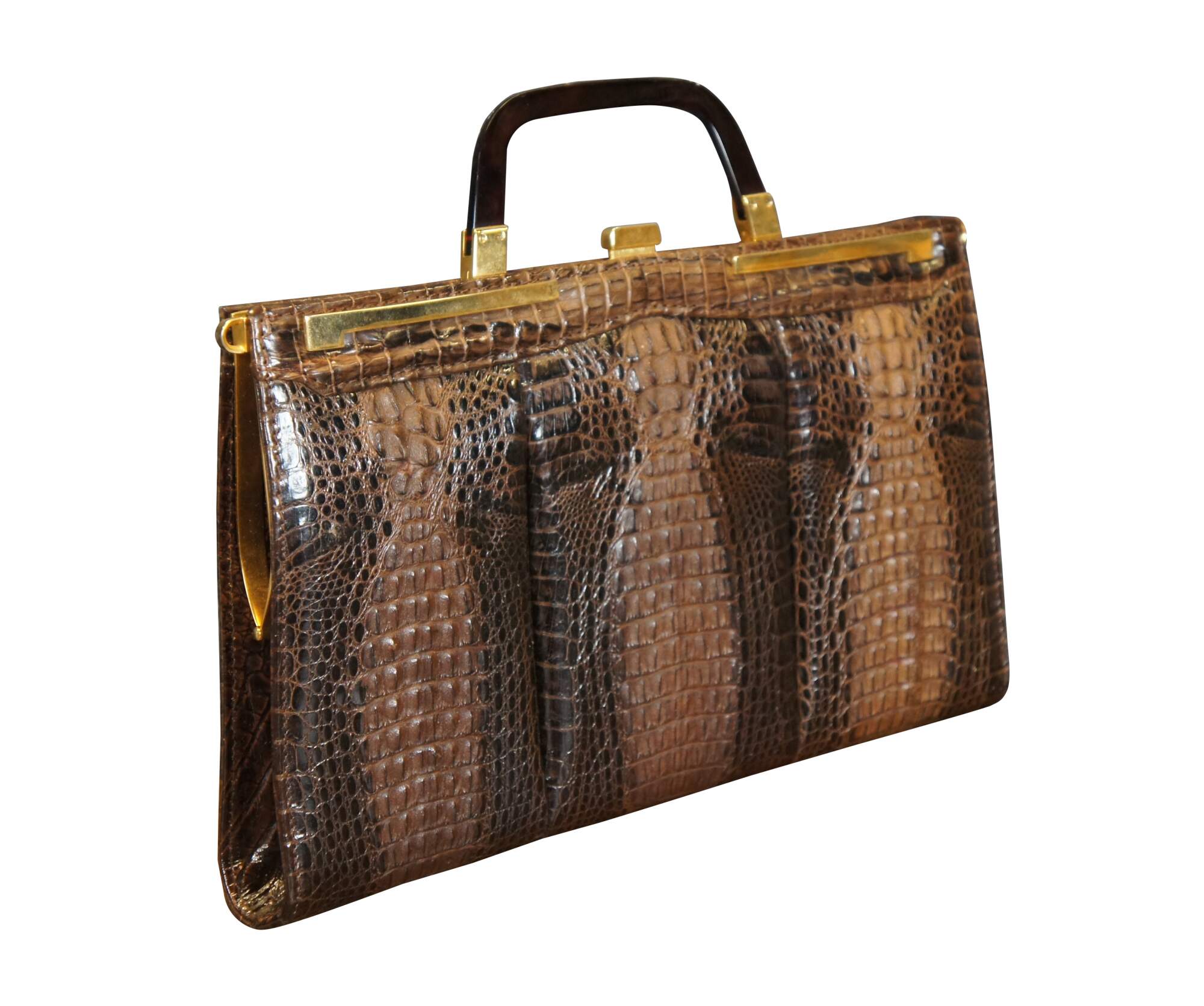 Mid century triple hornback brown alligator / crocodile skin / leather purse / hand bag. Rectangular form; gold tone hardware; single tortoiseshell bakelite / acrylic handle. Snap closure. Two interior compartments divided by zippered pocket; one interior slip pocket. Brown pleather interior. Matching brown pleather coin purse.