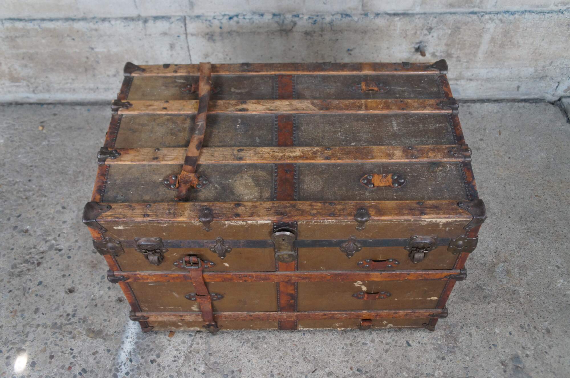 Victorian Era Flat Top Steamer Trunk or Chest by R&H Modern Trunks. Made from wood with a canvas wrap, leather accents and brass hardware. The side of the trunk is Monogrammed M.K.E. The other side reads Emrick Dayton, Ohio. Great for storage or use as a coffee table.