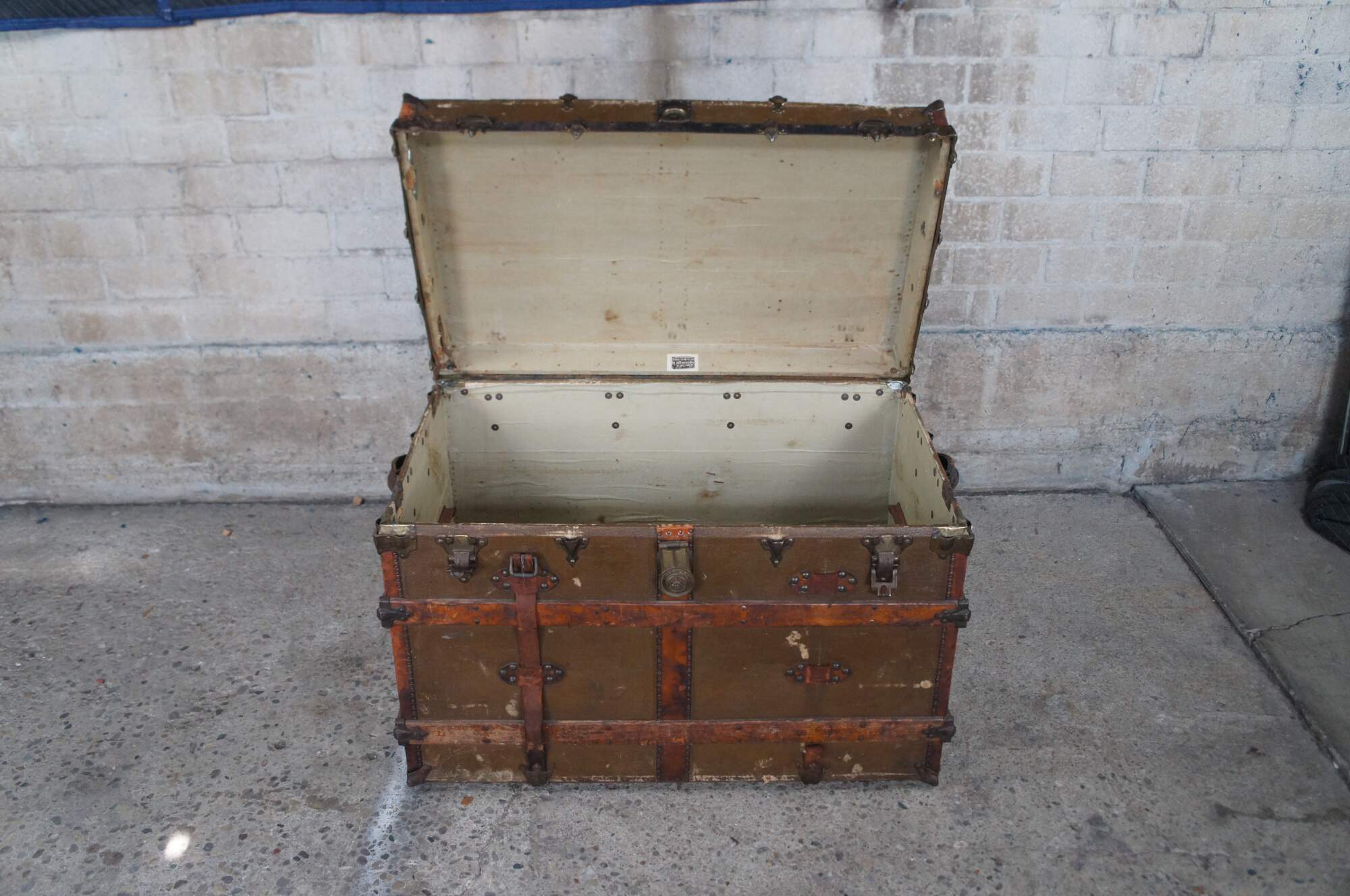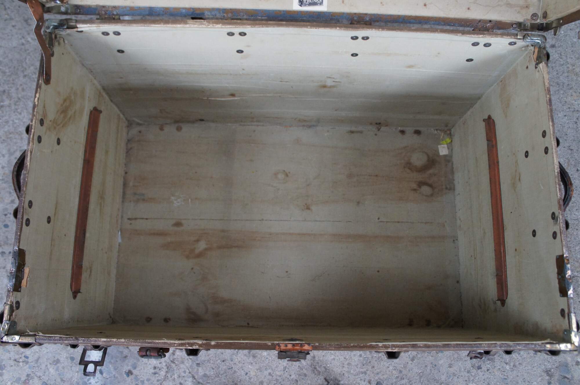 Steamer trunks, also known as cabin trunks or traveling trunks, were originally used as luggage for extended trips by steamship, train, or stagecoach or for taking to boarding school. Many were quite elaborate inside and out. Steamer trunks have a distinguishing curved or barrel top and can weigh as much as 100 pounds. Today, they are used as furniture or storage.