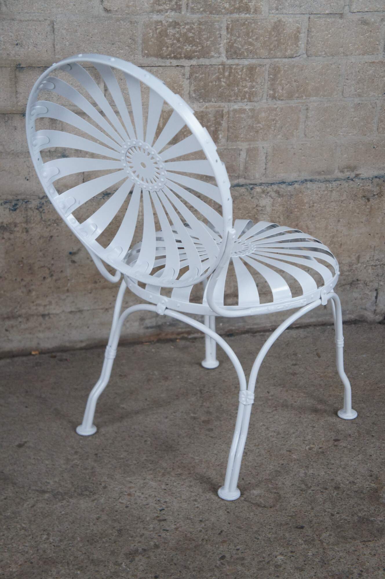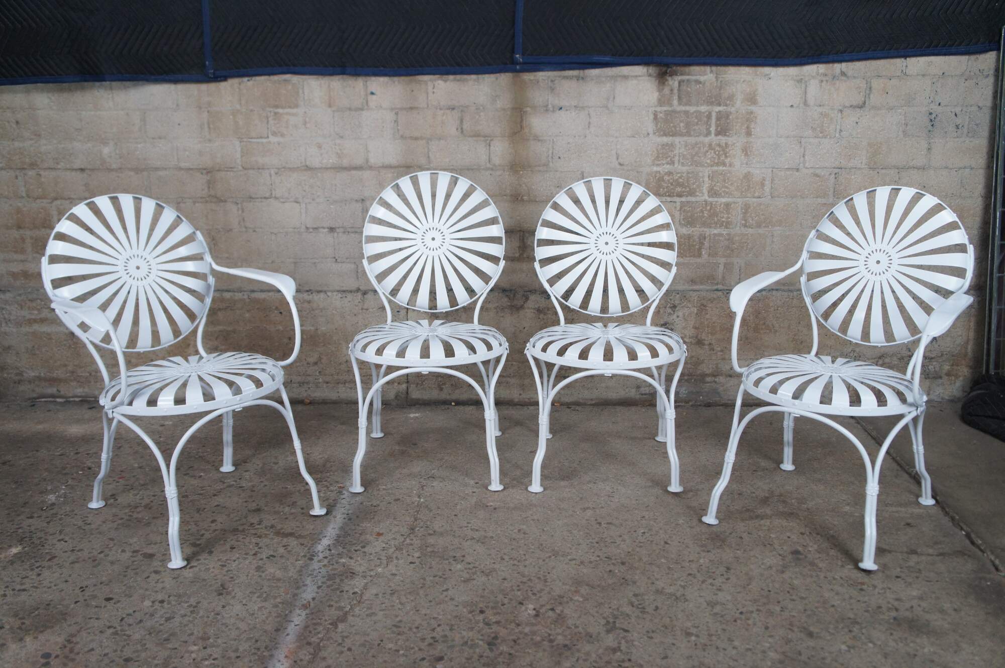 Beautiful Francois Carré Art Deco dining set, circa 1930s. Features four chairs with ametal frame with sunburst design. Table is round with hole in the center for umbrella. Underside of table has latches for purses or bags to hang. Two arm chairs and two side chairs. Finished in white.