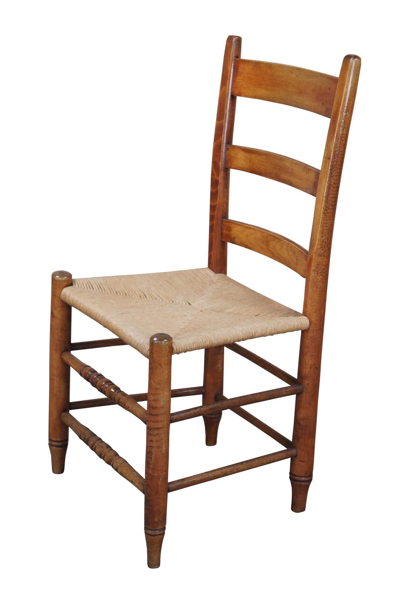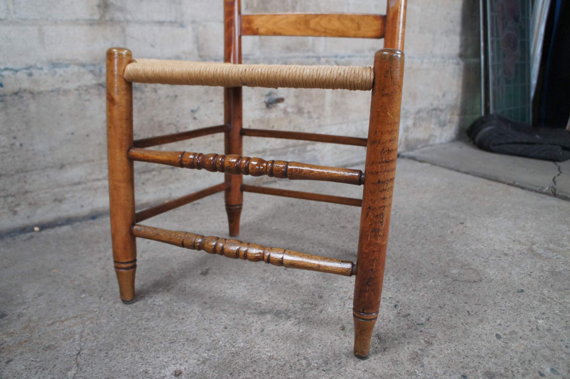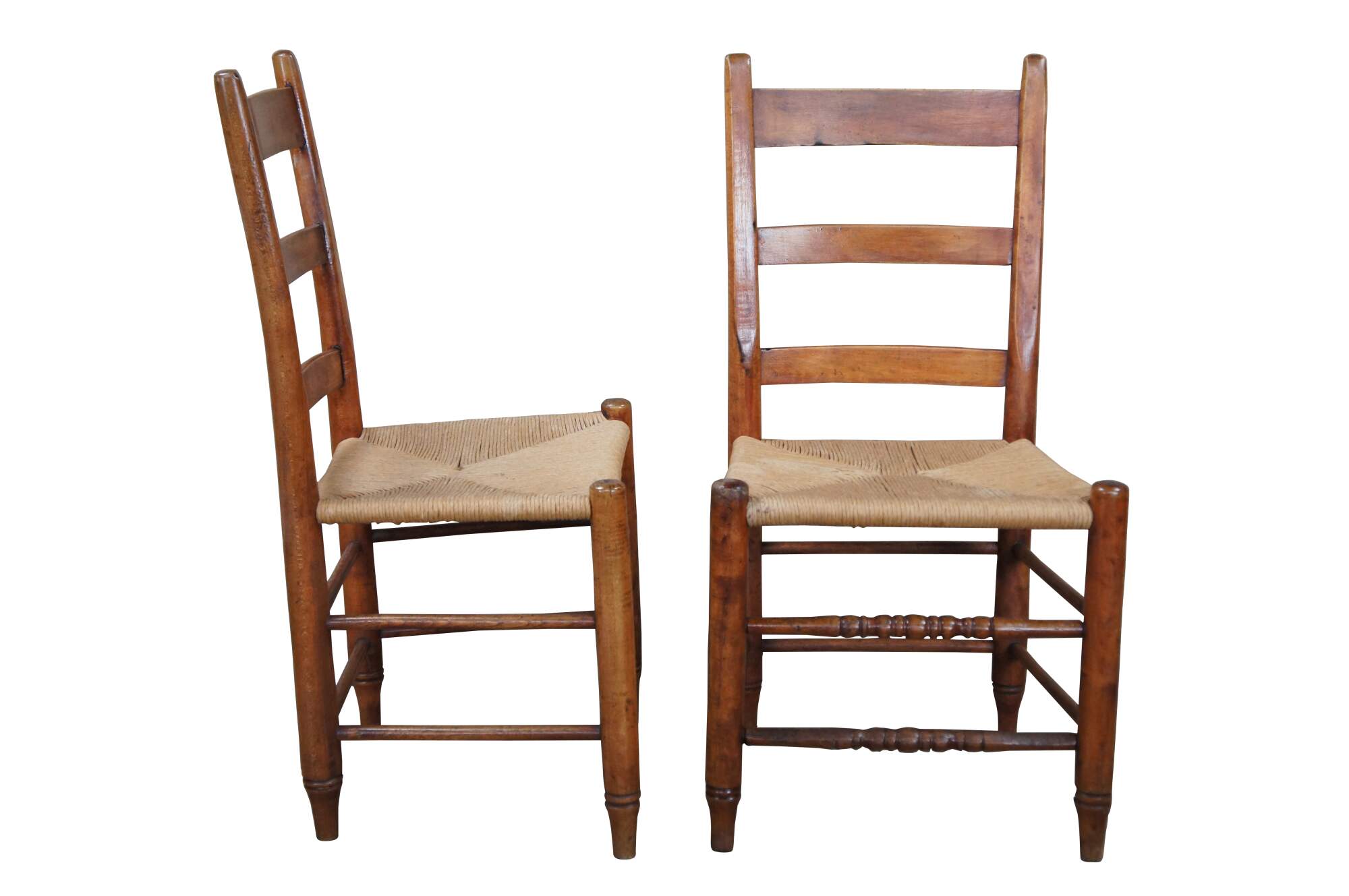Two primitive antique ladderback chairs. Made of maple featuring turned supports, with rush seat and ladder back.