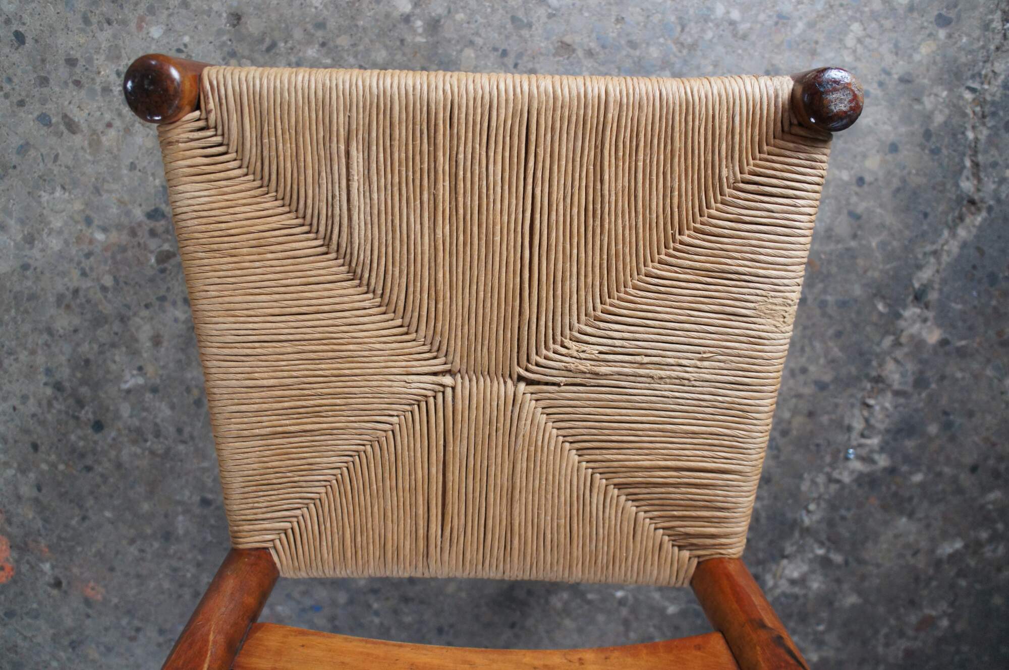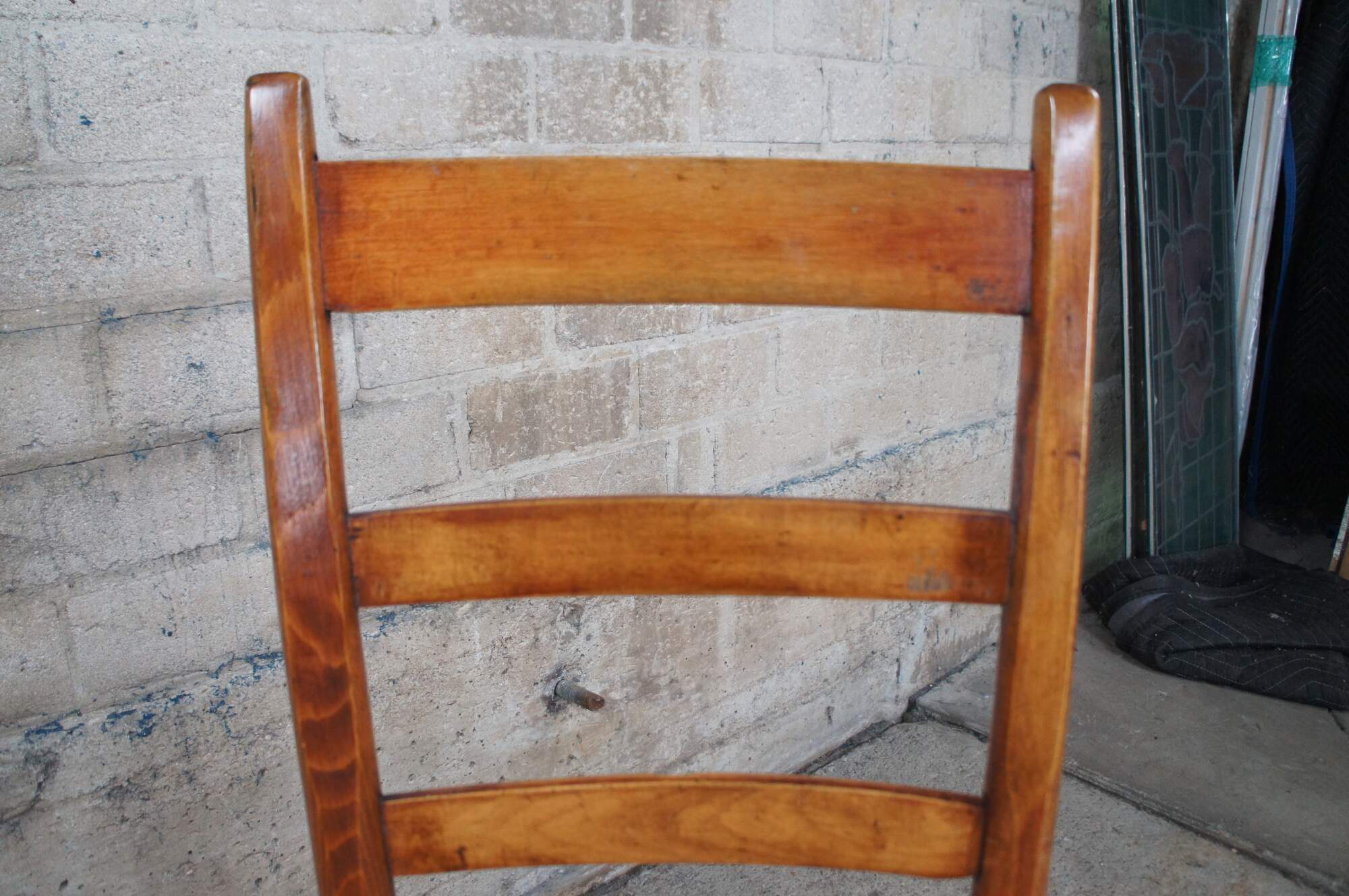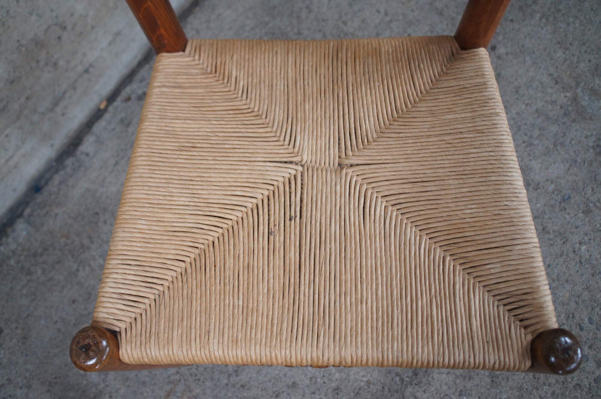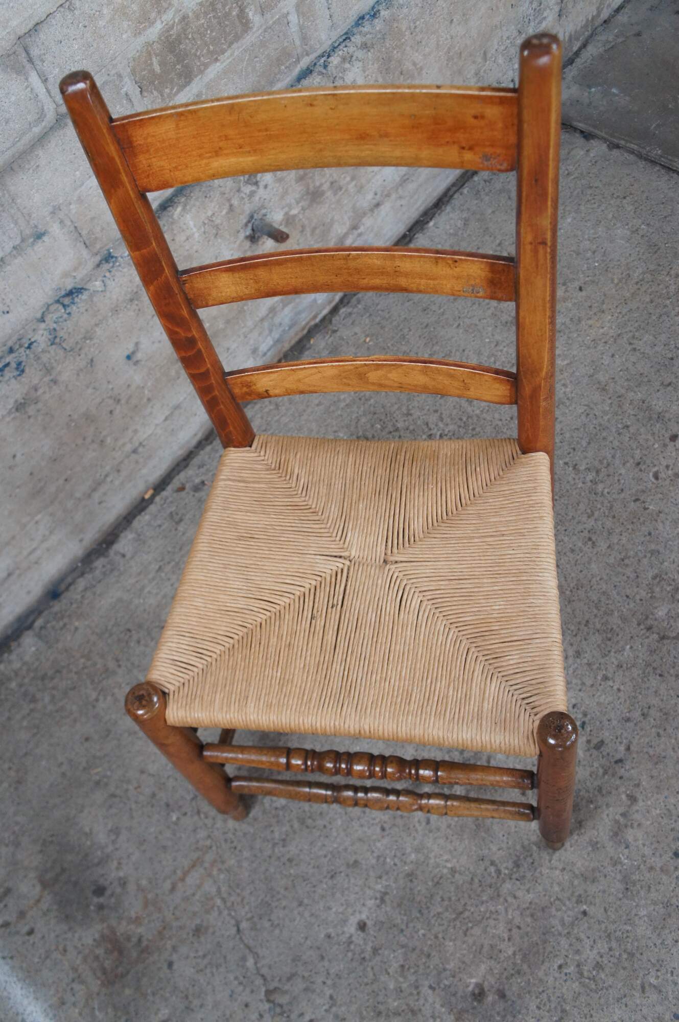 Two primitive antique ladderback chairs. Made of maple featuring turned supports, with rush seat and ladder back.