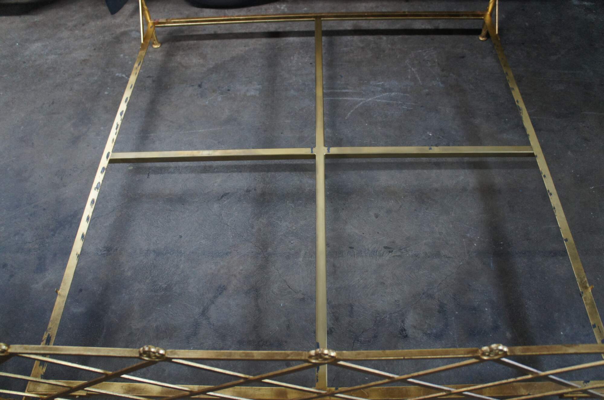 Good Vintage Condition; some light distressing and use related wear. Finish lost to the lower left side of the lattice along headboard. This will be blocked by pillows once matress is in place. Can be touched up with gold leaf paint
