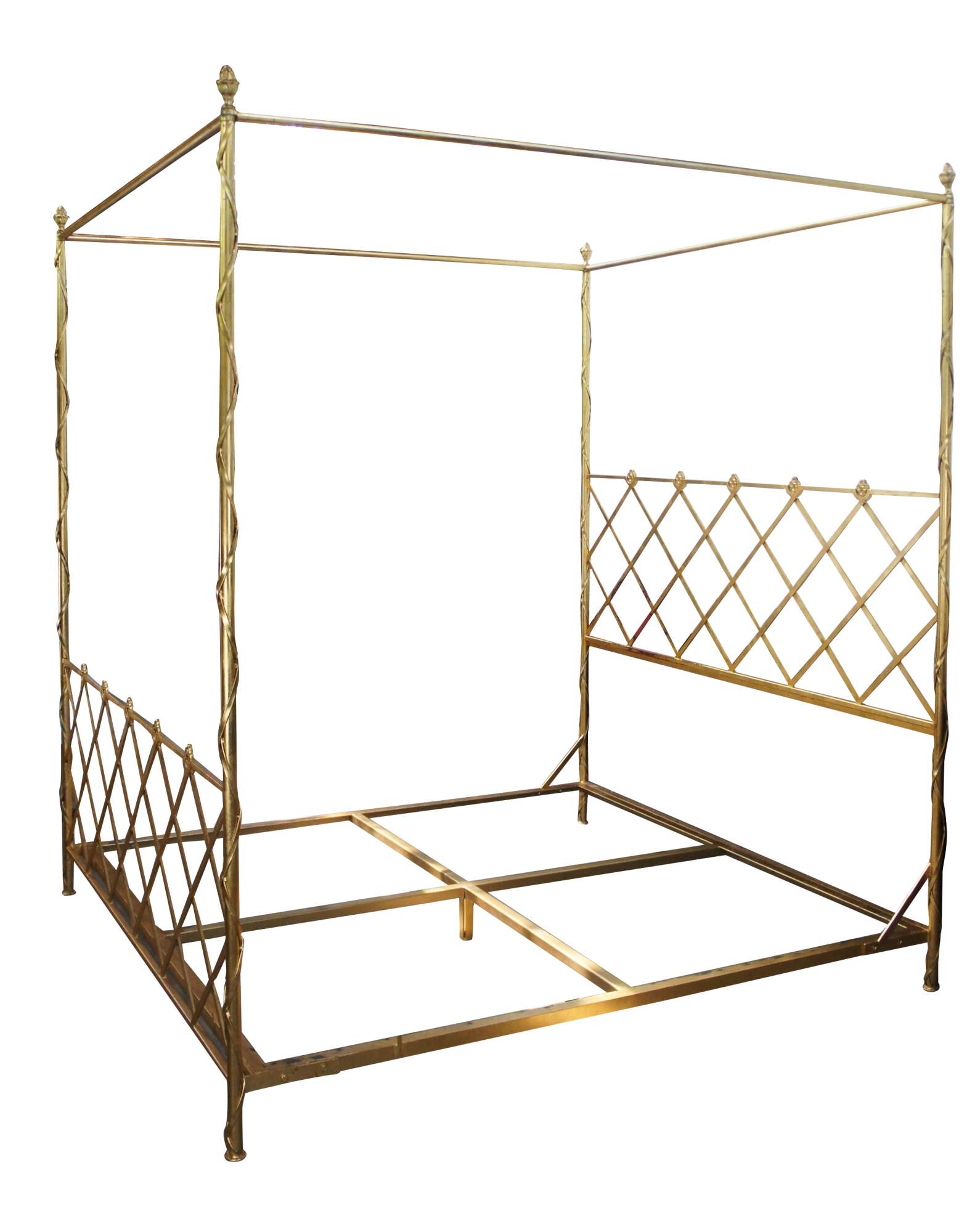 An impressive King size canopy bed. Drawing inspiration from Italian and French styling. Made from iron with a golf leaf finish. Features lattice medallion head and foot boards between neoclassical ribboned posts with acorn finials. The Canopy or Tester can be removed to be used as a poster bed.