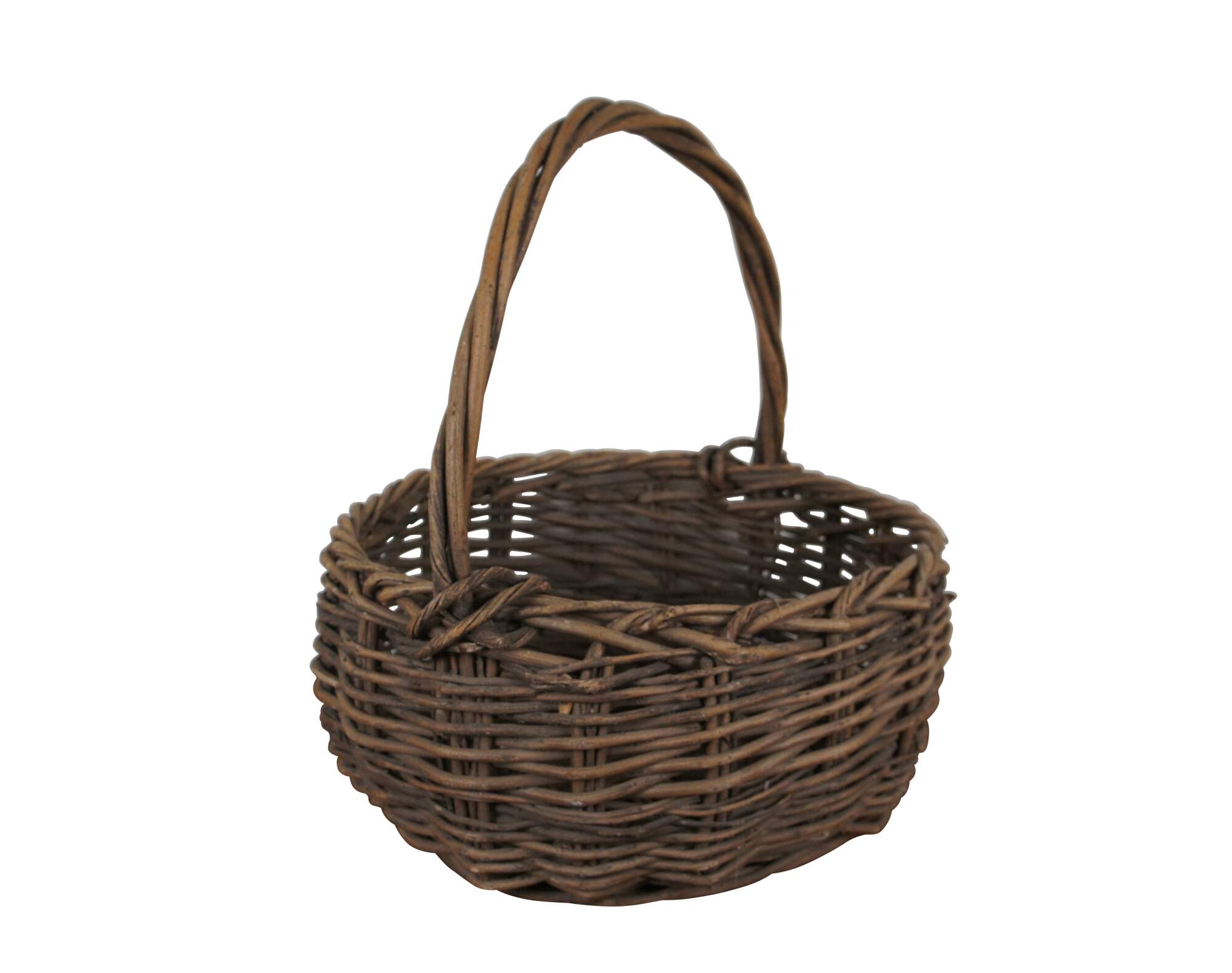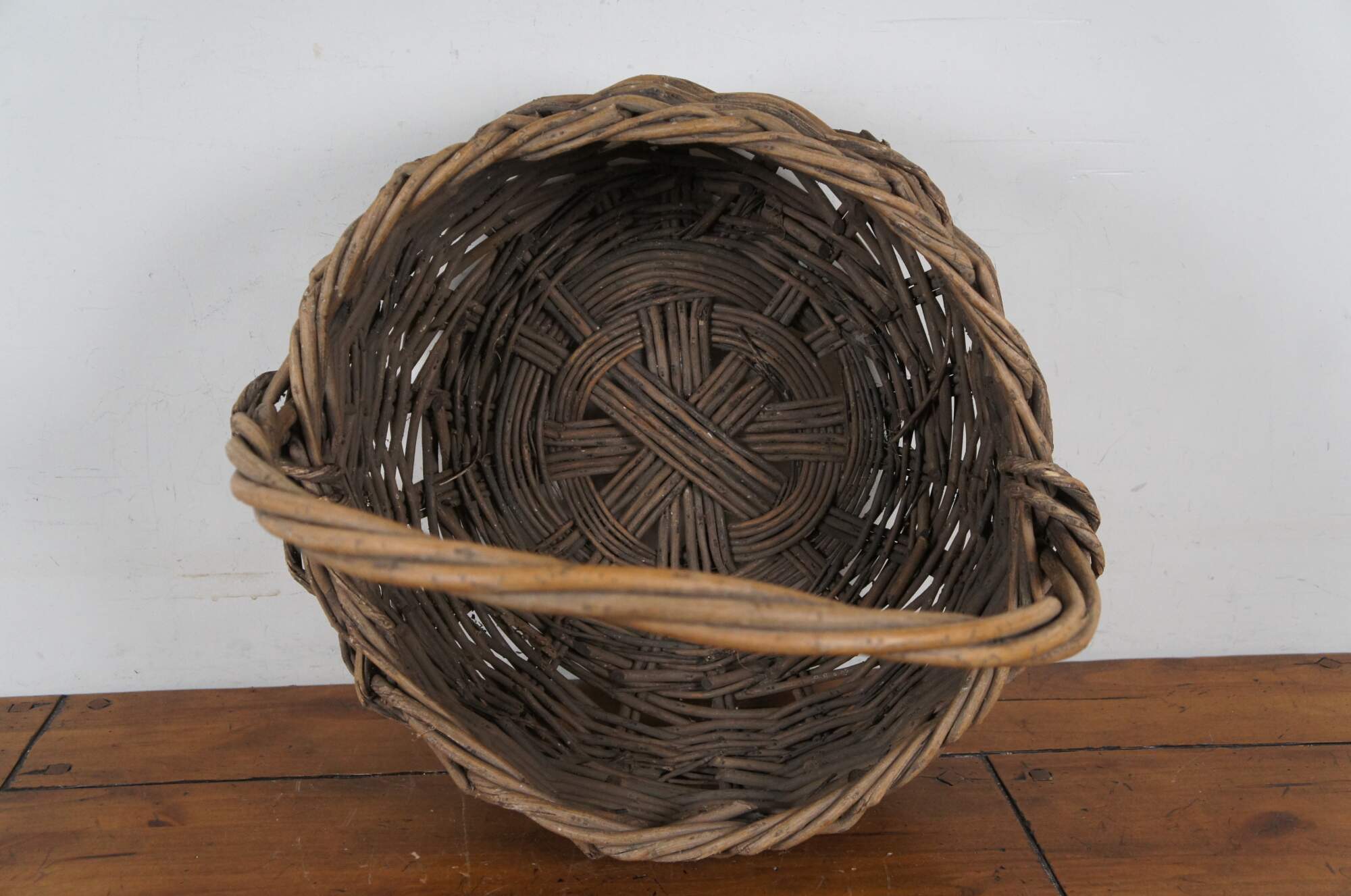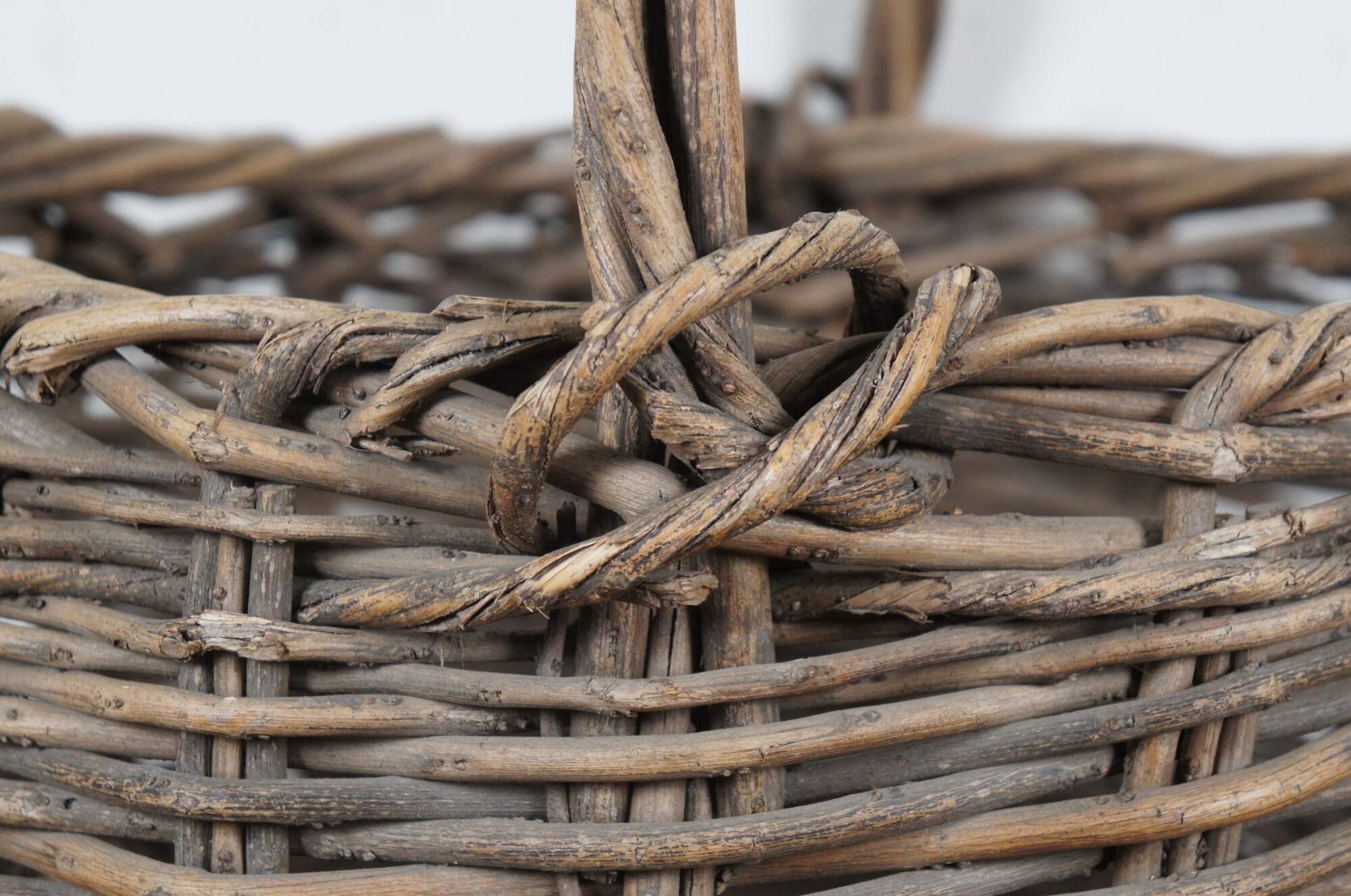 Large vintage woven grape vine harvest / market / shopping basket. Rustic country / farmhouse design with braided top edge and twisted handle.