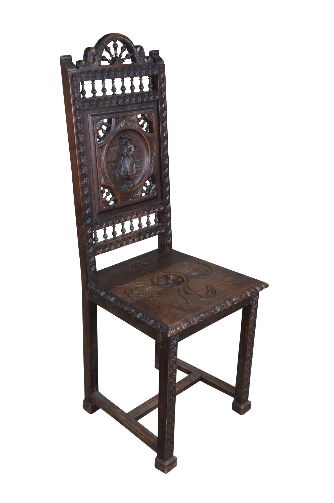 Exquisite Antique Brittany (Bretagne) French dining room chairs, circa last quarter 19th century. Bretagne, was once an independent kingdom called Lesser Britain. Brittany is still recognized as one of the six Celtic nations in the world today, as the Celtic language, Breton, is still spoken there and many Celtic traditions still survive today. Drawing on the ornate and symbolic nature of Celtic Art, each piece was heavily carved and told a story though its symbolic carvings.