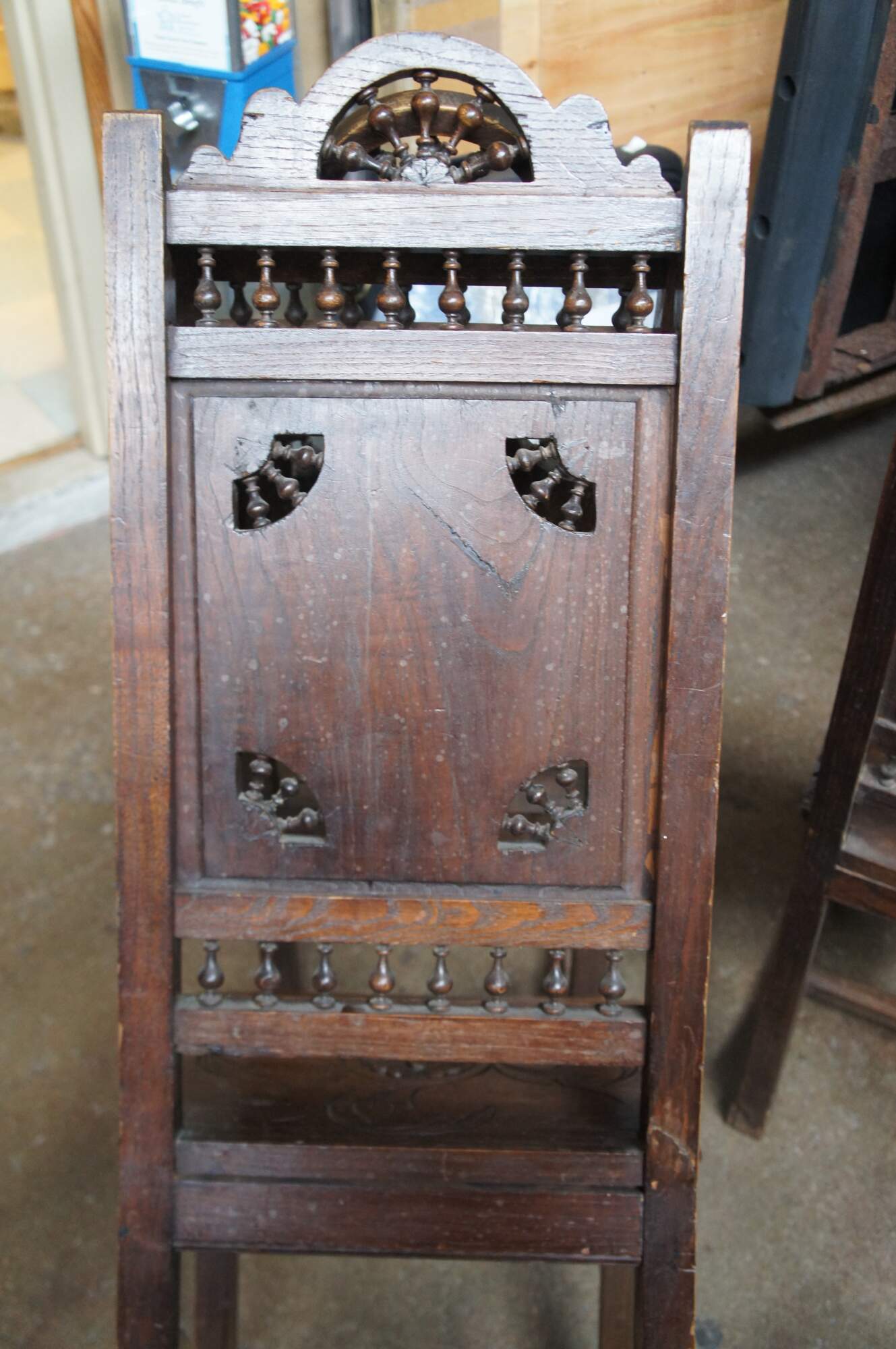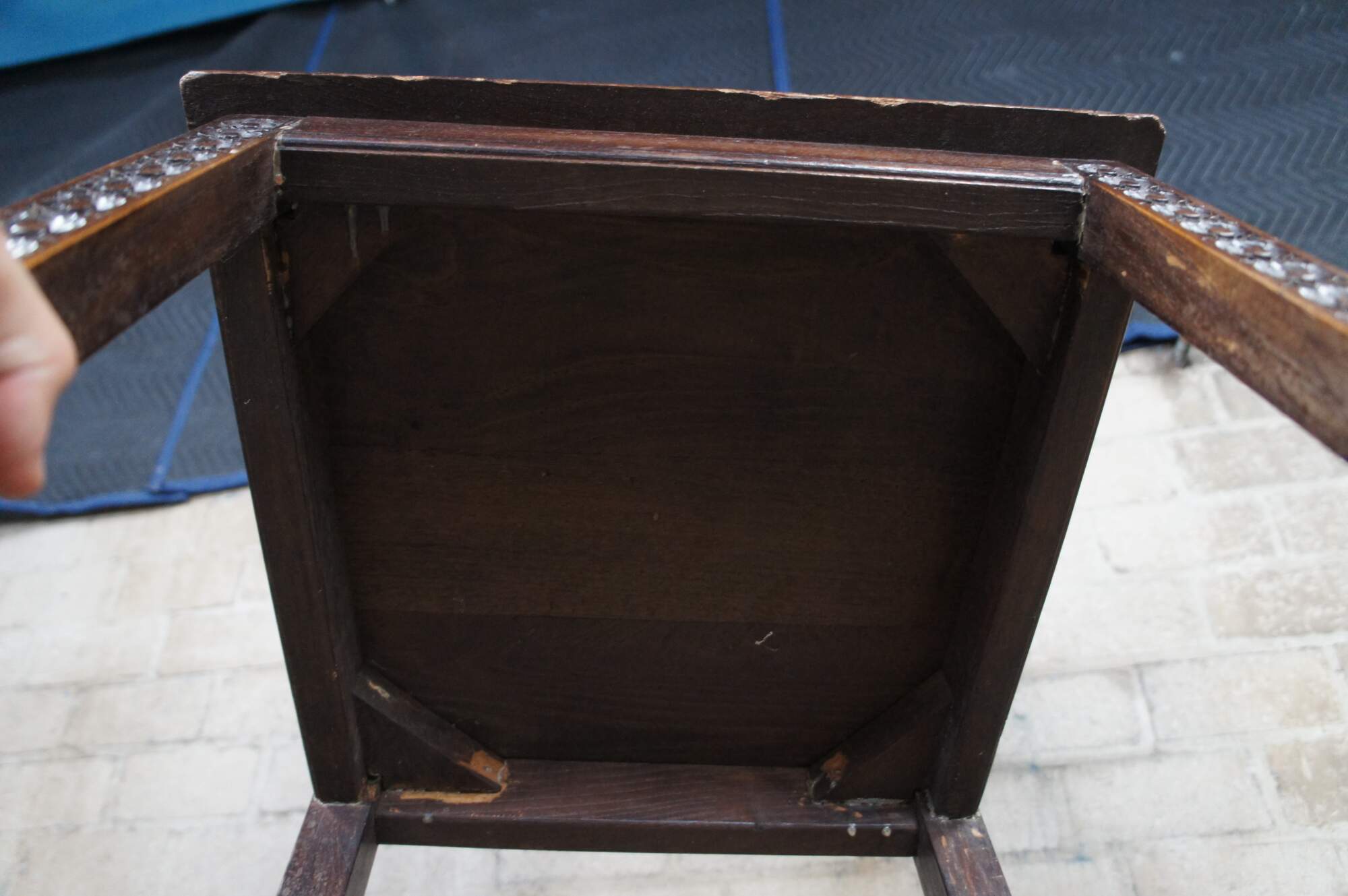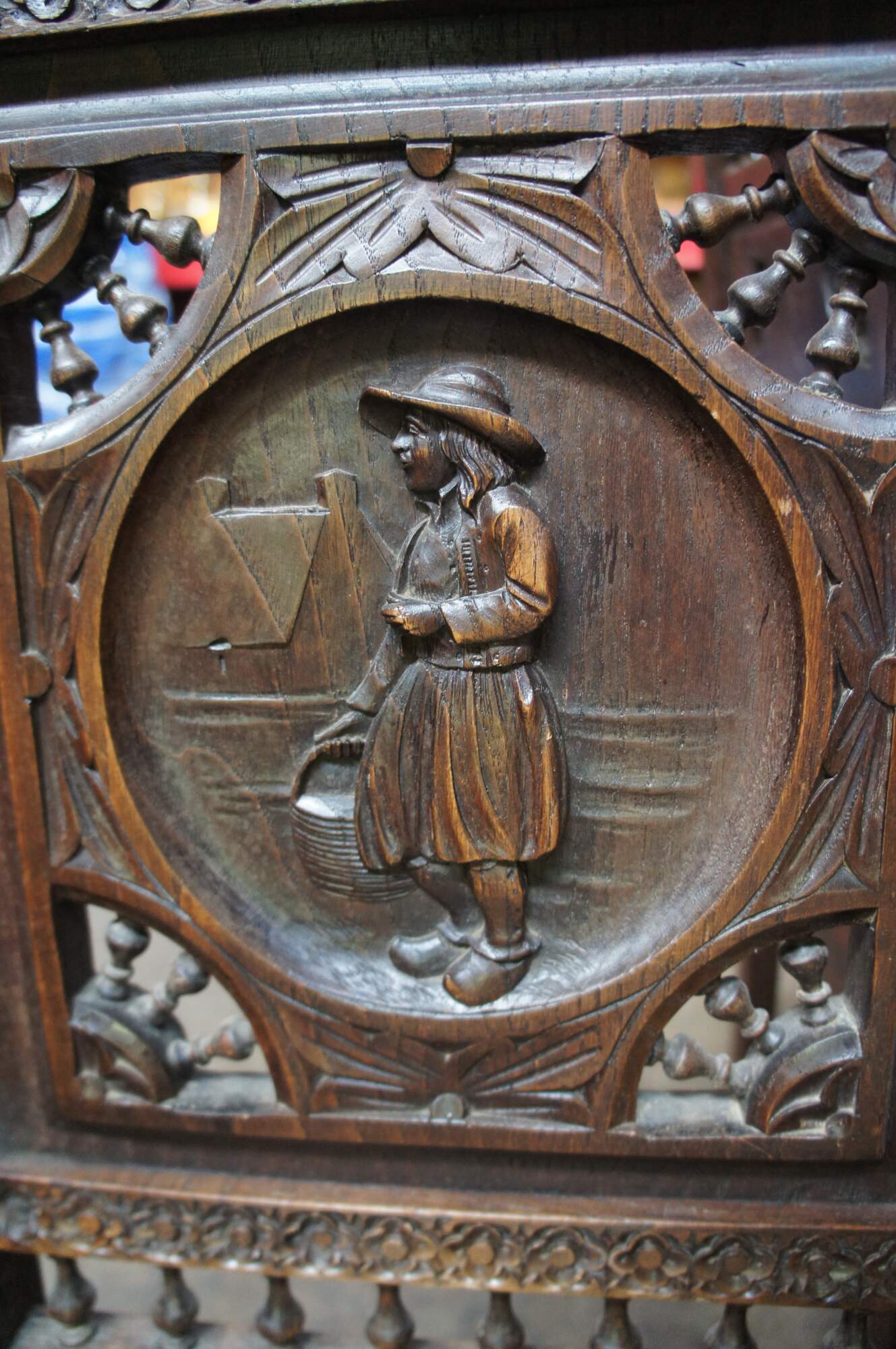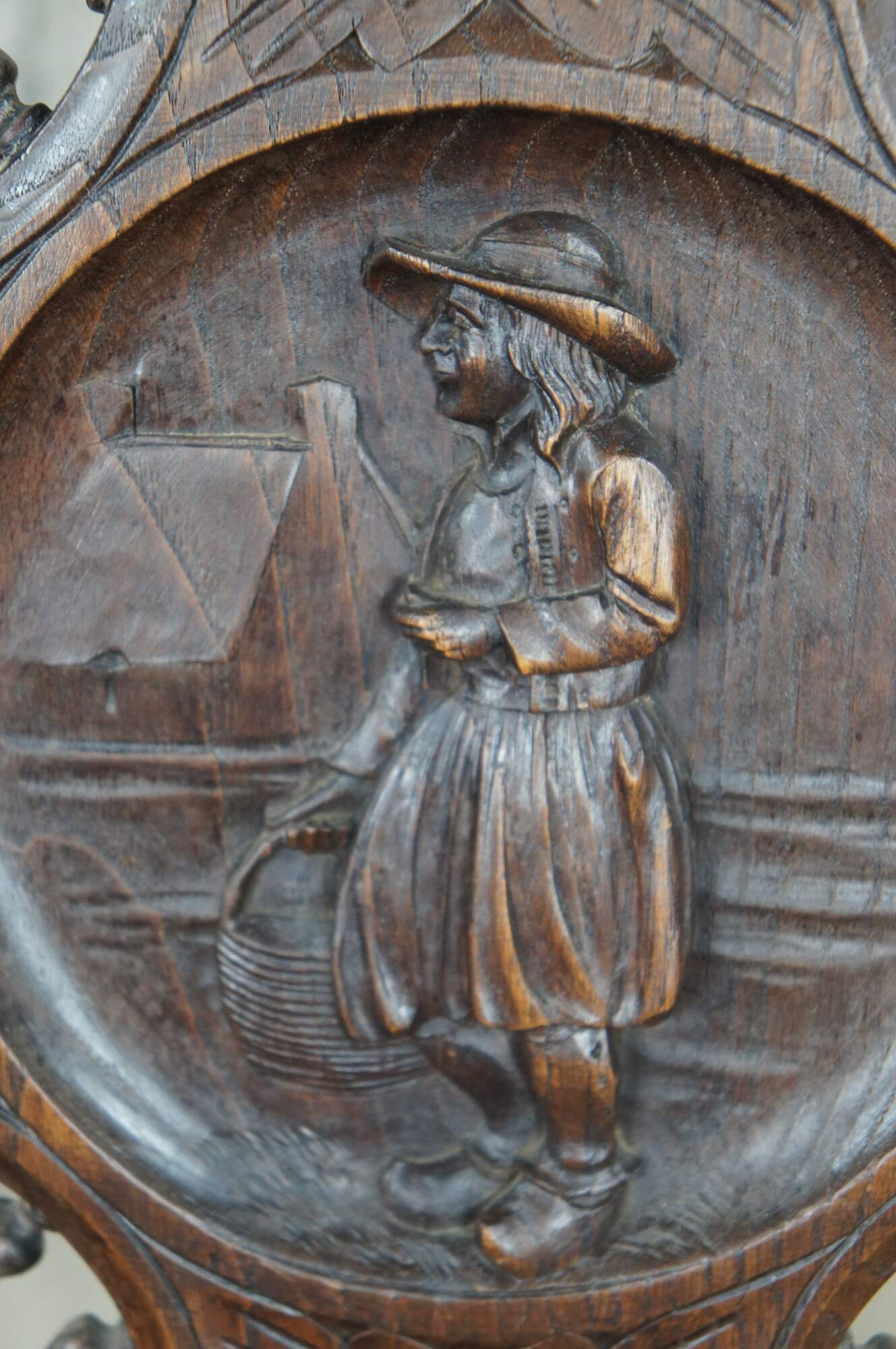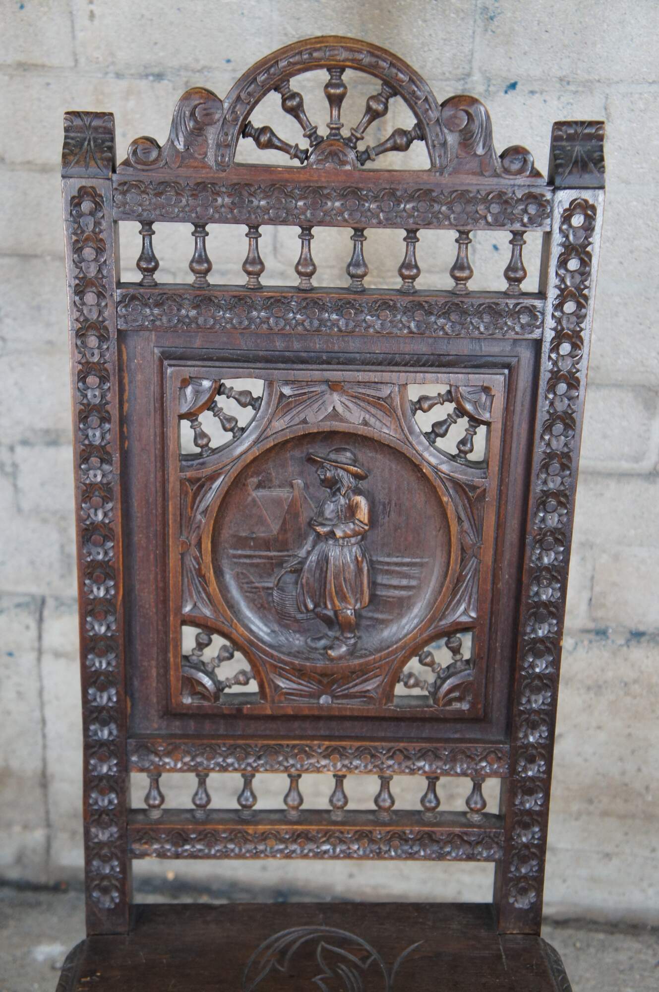 This beautiful set was hand crafted from chestnut featuring pierced nautical wheel like carvings, floret medallions and several scenes of men and women in traditional Celtic dress throughout. The various scenes showcase their strong work ethic, piety and enjoyment of life. Each chair seat showcases a central foliate medallion with windmill like "C" scroll leaves around it. The chairs are supported by square legs with block feet supported by H stretchers.