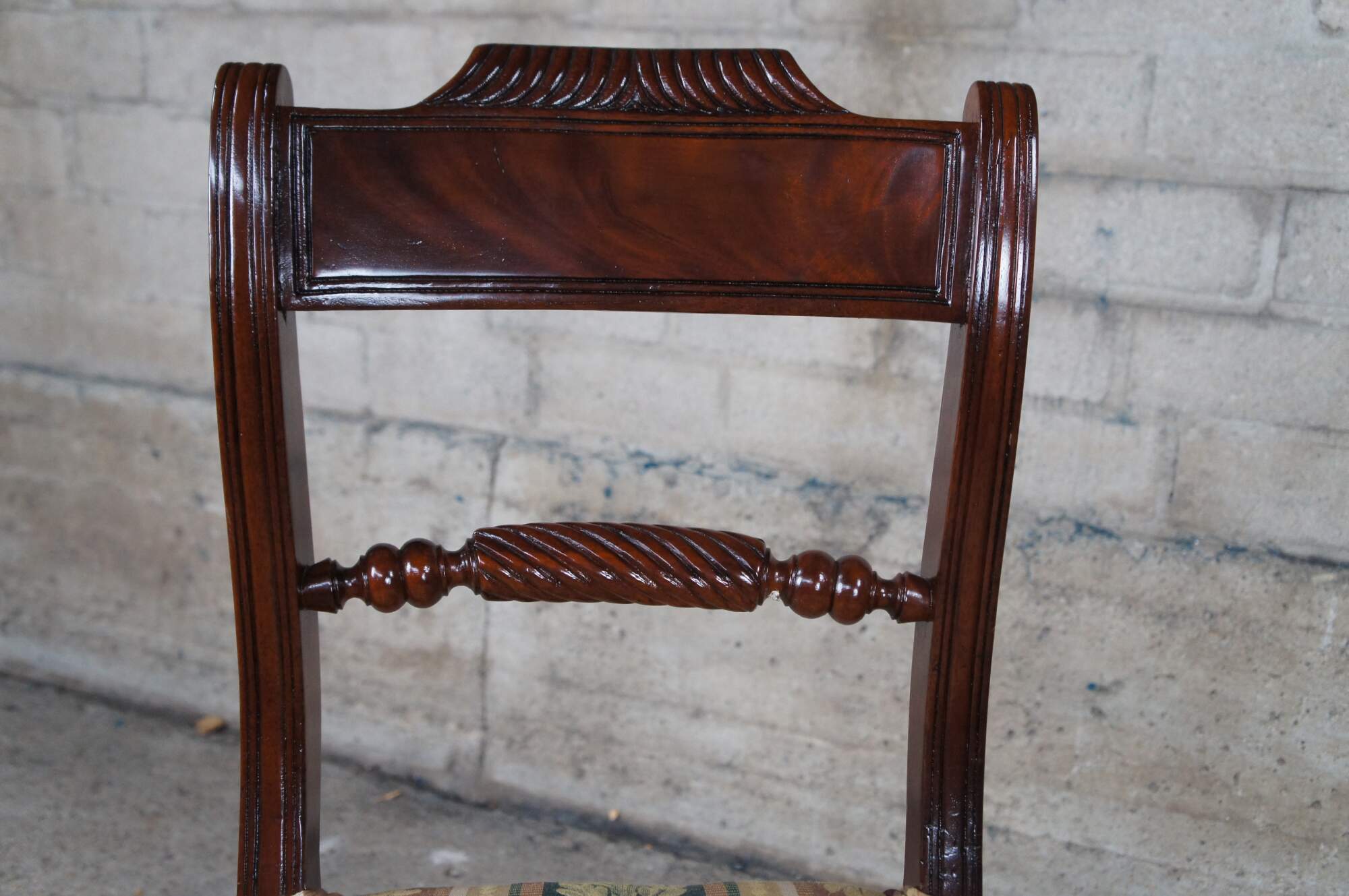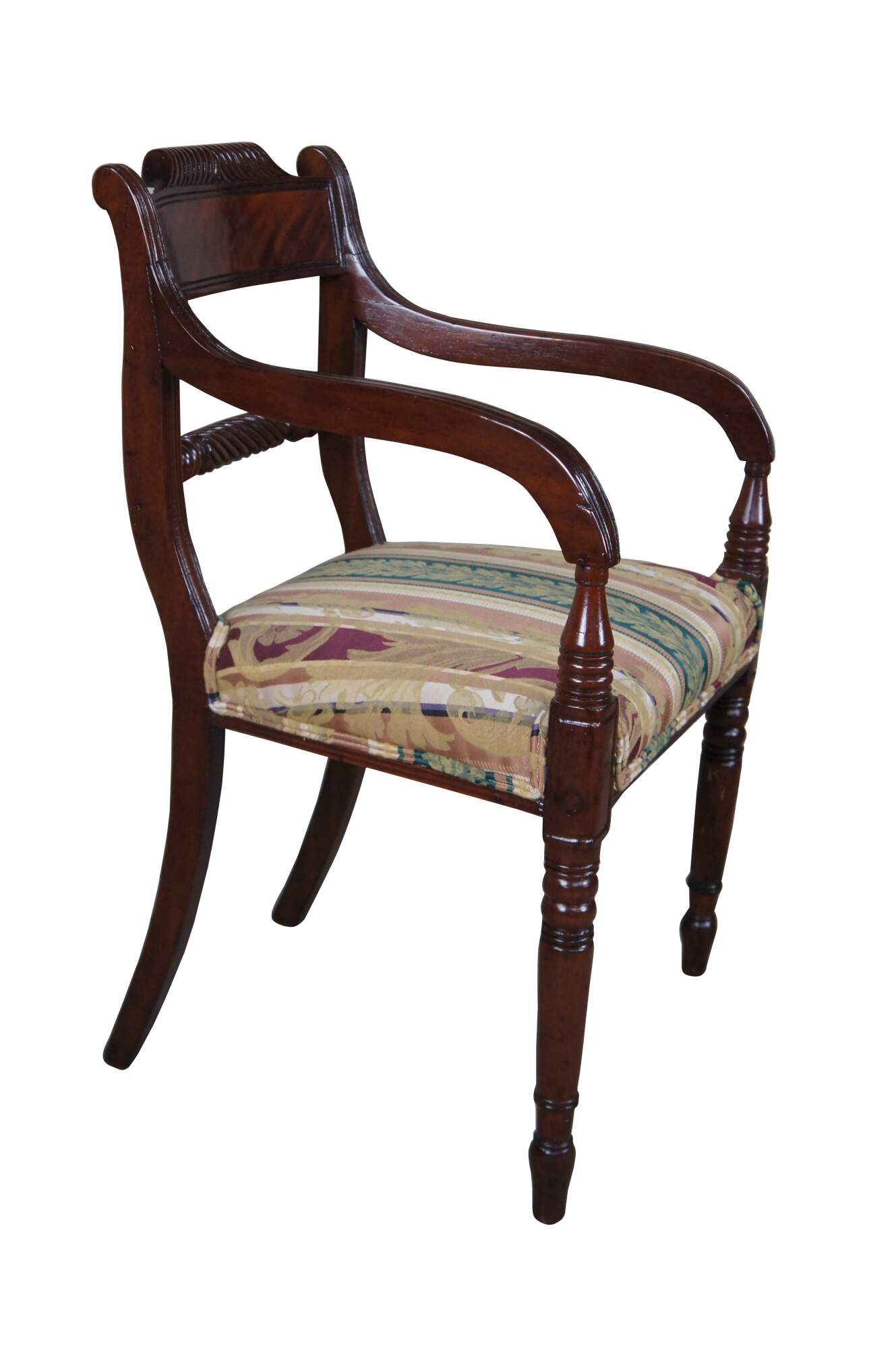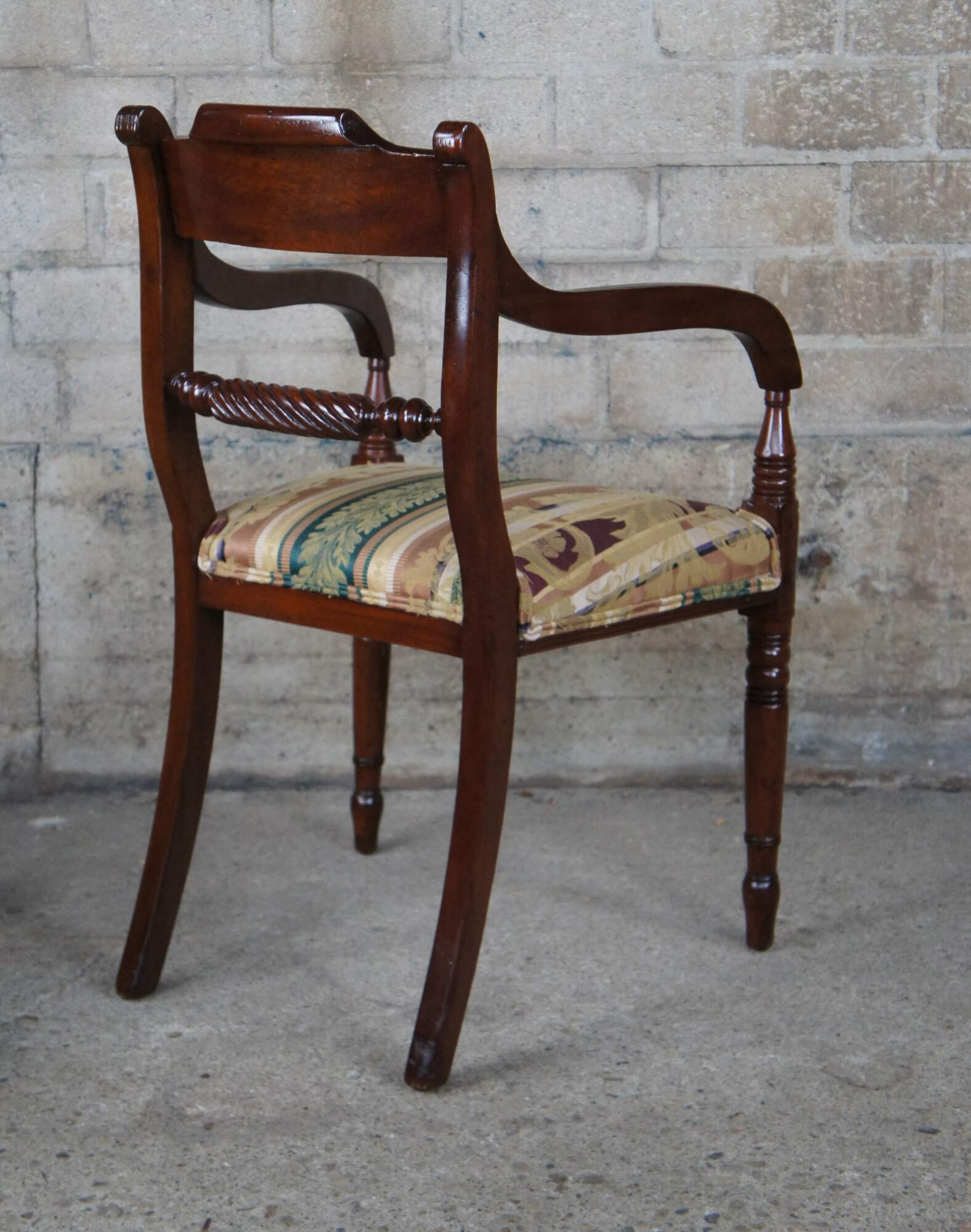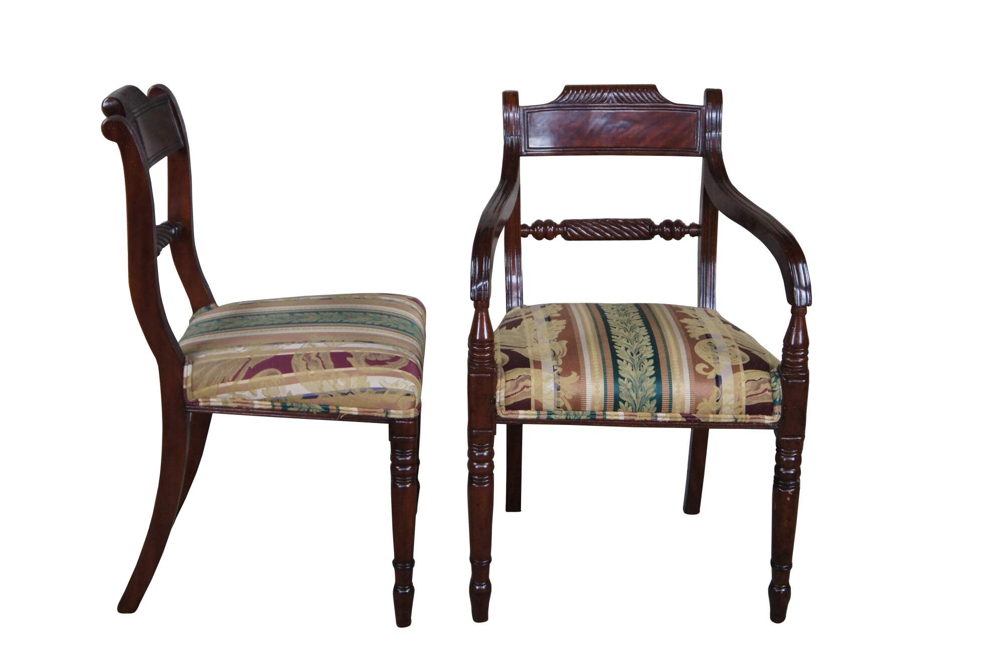 8 Antique English Regency Dining Chairs, C. 1820s. Features a mahogany frame with rope twisted back and stately acanthus leaf floral striped seat. Front legs are turned tapered and ribbed. Rear legs are squared with a saber shape. Includes two arm chairs showcasing fluted downswept arms.