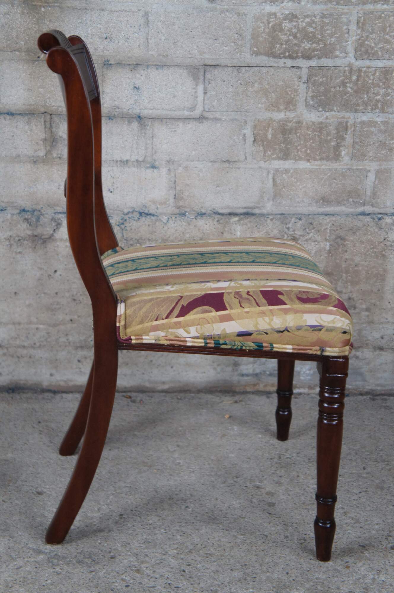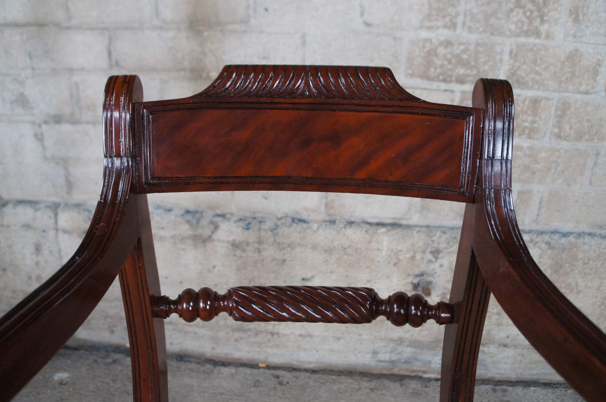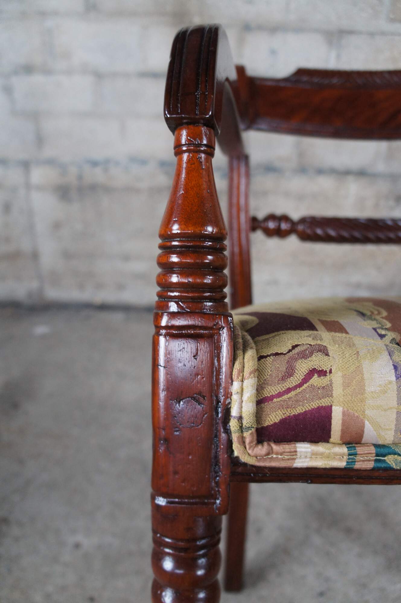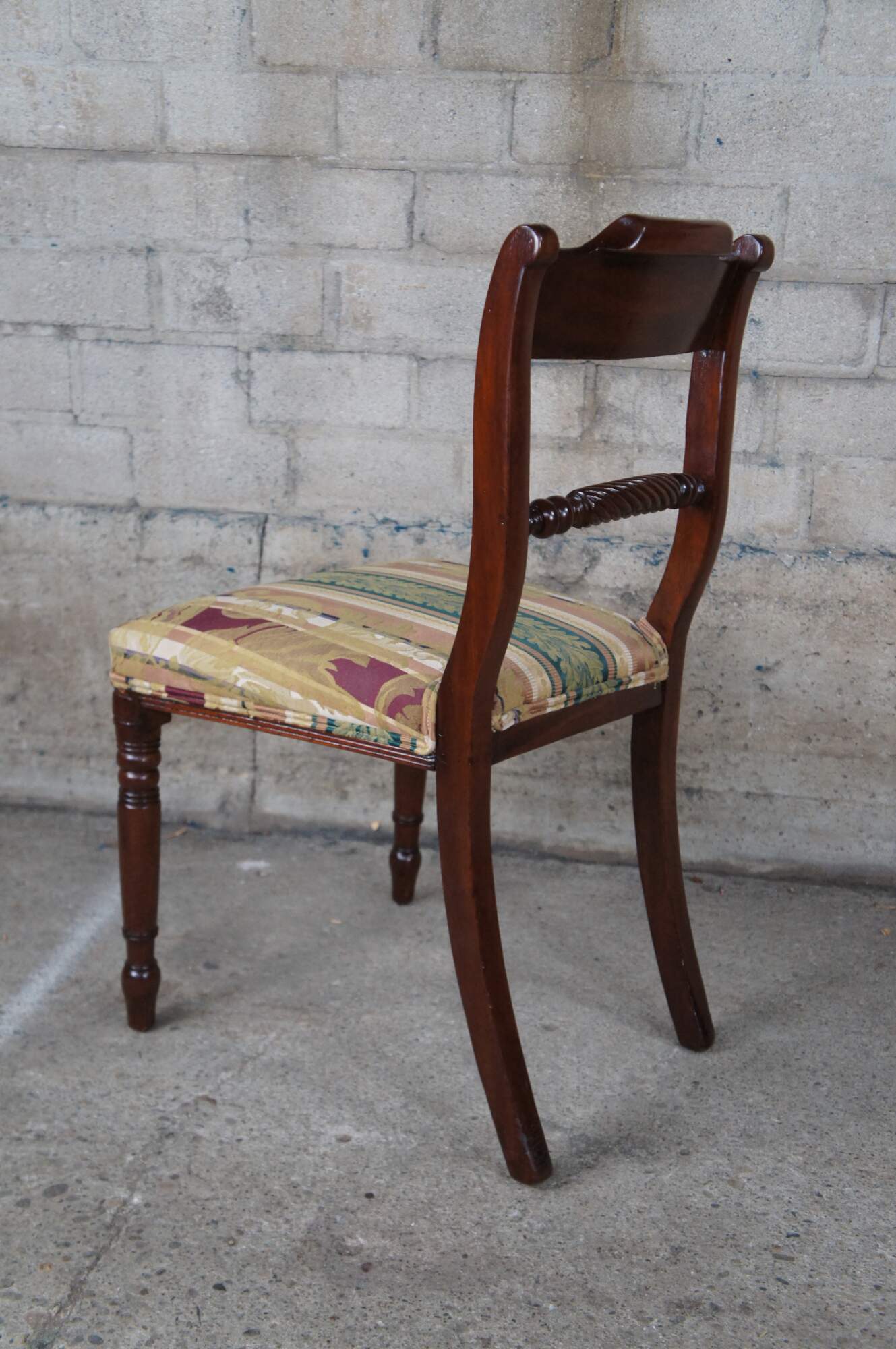 8 Antique English Regency Dining Chairs, C. 1820s. Features a mahogany frame with rope twisted back and stately acanthus leaf floral striped seat. Front legs are turned tapered and ribbed. Rear legs are squared with a saber shape. Includes two arm chairs showcasing fluted downswept arms.