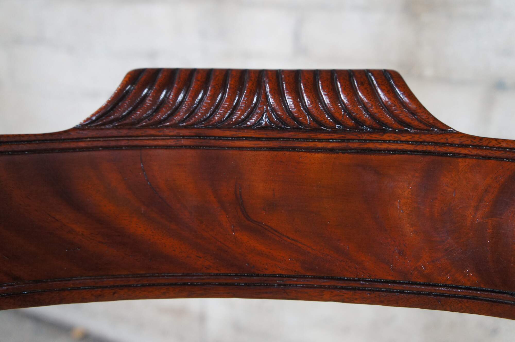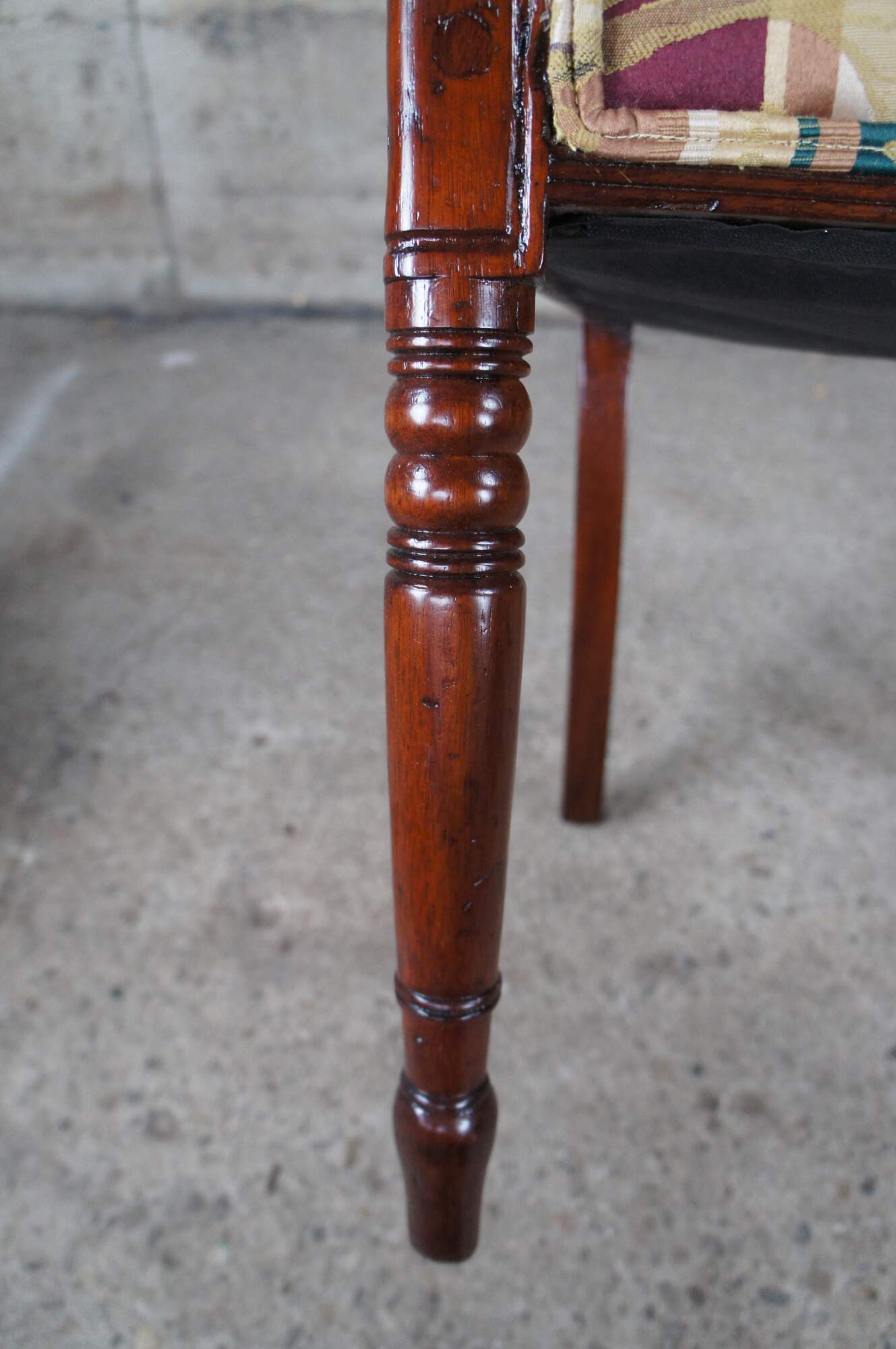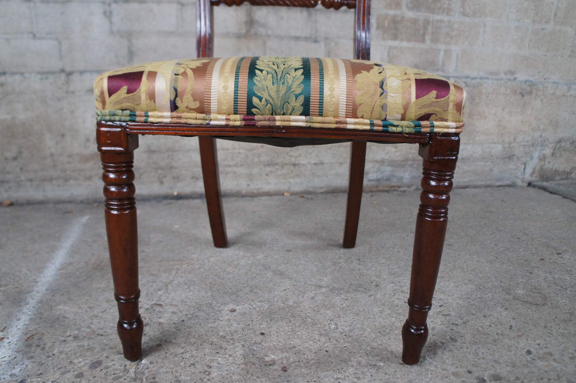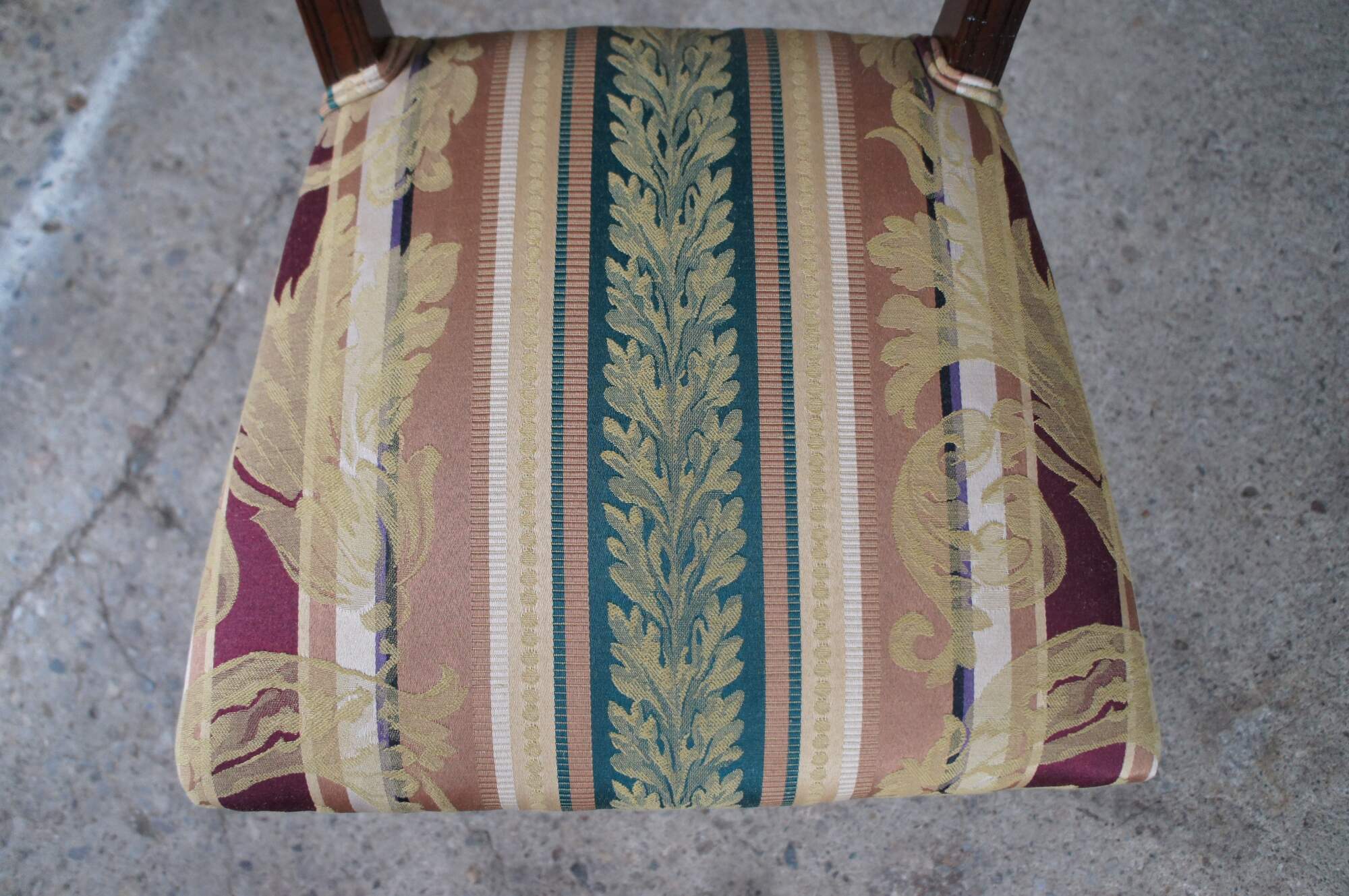 8 Antique English Regency Dining Chairs, C. 1820s. Features a mahogany frame with rope twisted back and stately acanthus leaf floral striped seat. Front legs are turned tapered and ribbed. Rear legs are squared with a saber shape. Includes two arm chairs showcasing fluted downswept arms.