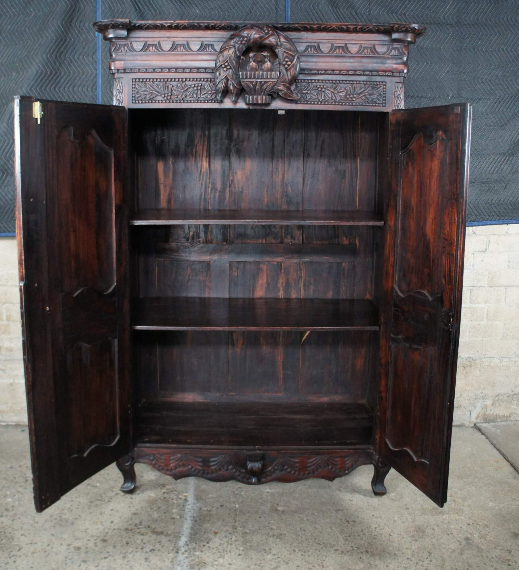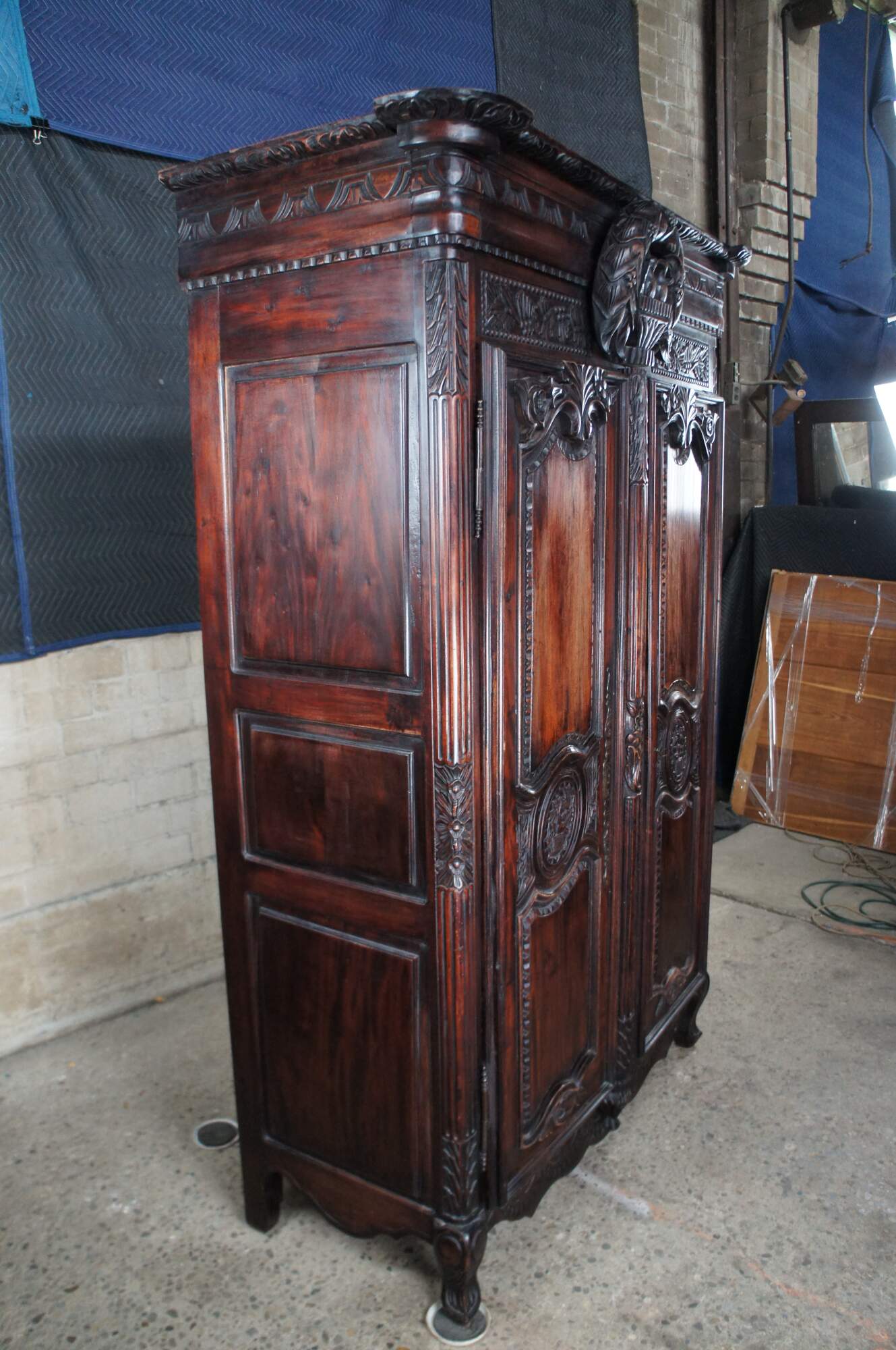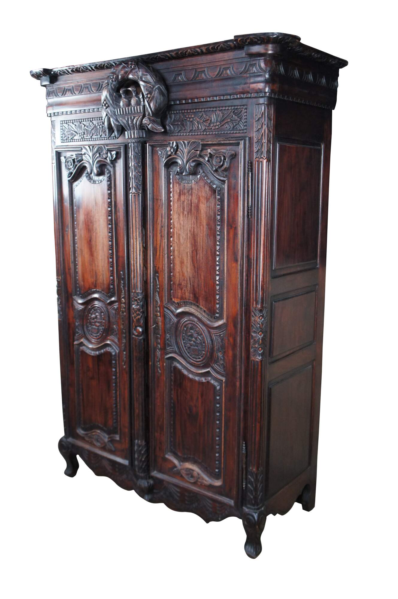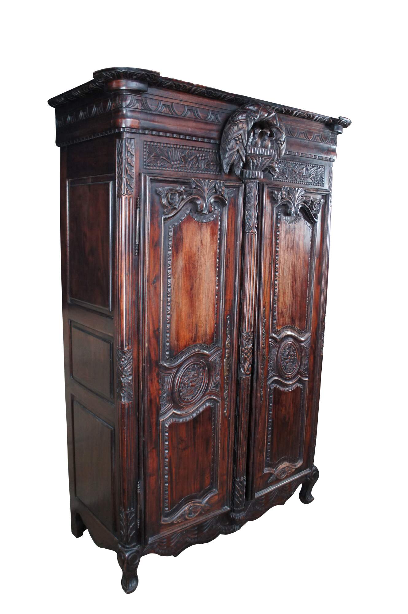 Vintage French Louis XV / Provincial style wedding armoire / wardrobe / linen press, circa last quarter 20th century. Made of mahogany featuring baroque styling with carved egg and dart crown over a floral bird theme wreath and paneled doors with foliage and fruit basket designs. The cabinet rest on cabriole legs. Interior has two removable shelves and a hanging bar.