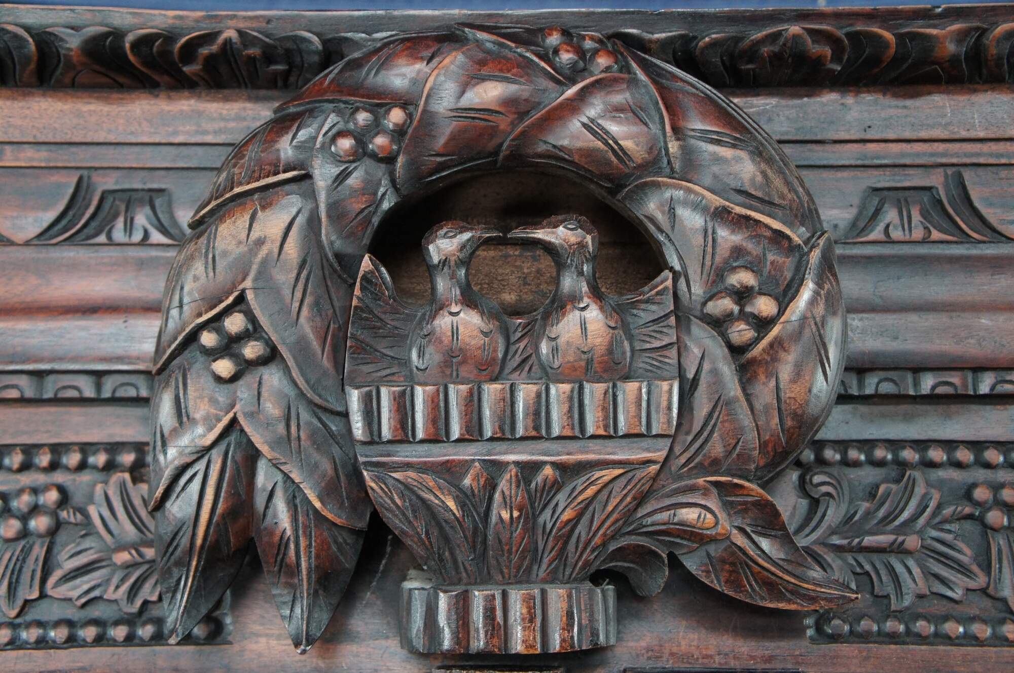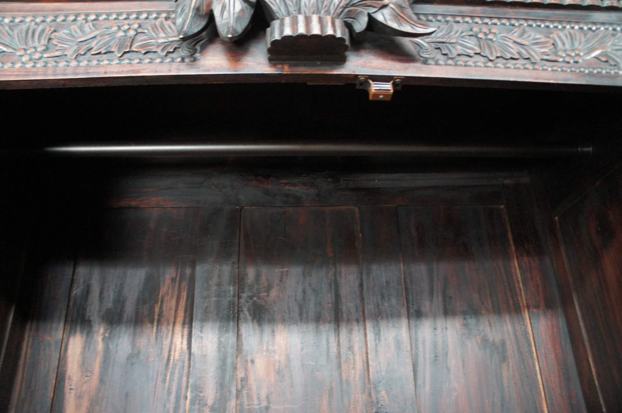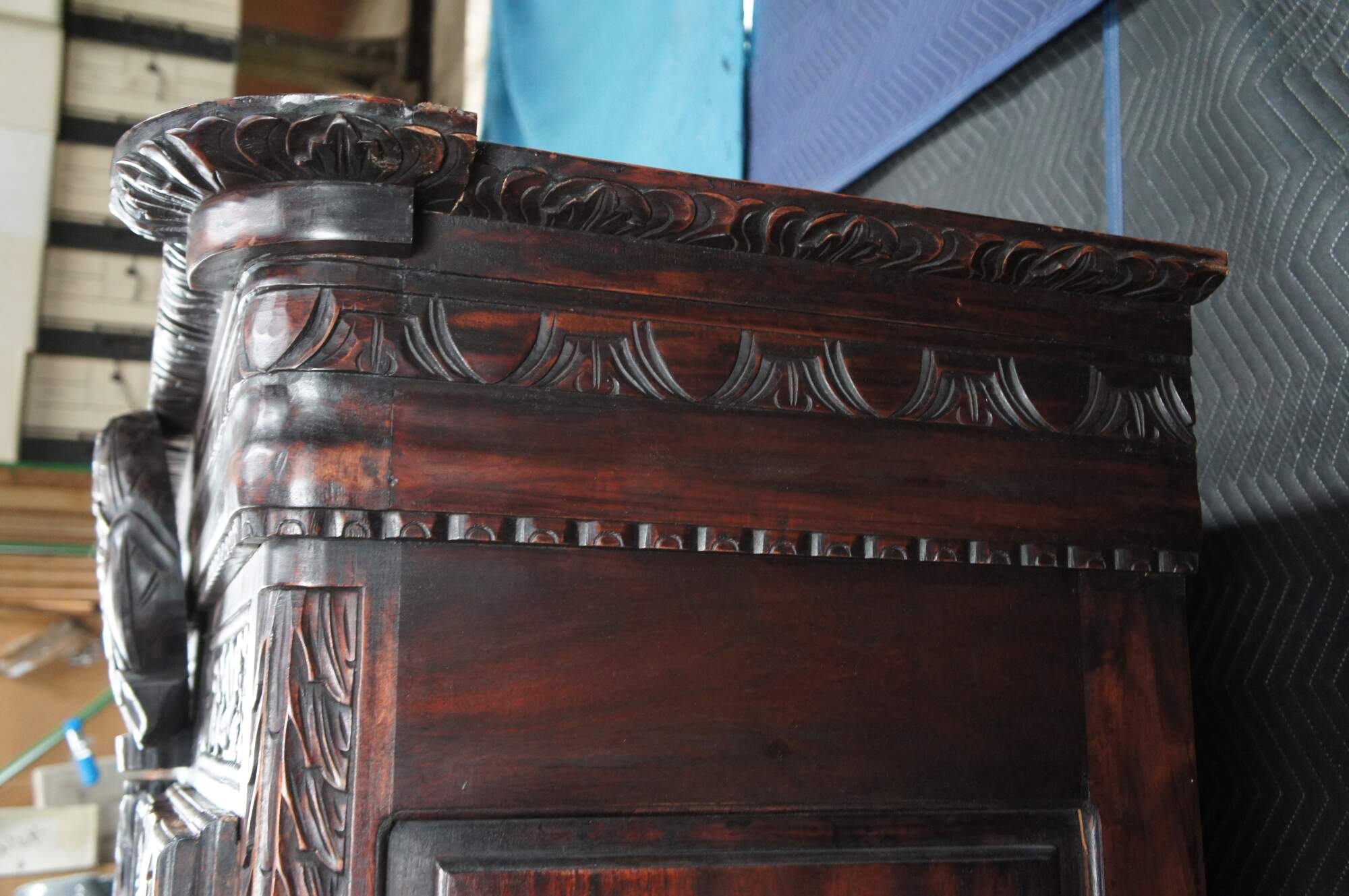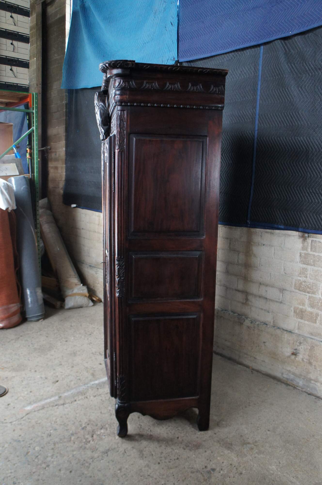 Vintage French Louis XV / Provincial style wedding armoire / wardrobe / linen press, circa last quarter 20th century. Made of mahogany featuring baroque styling with carved egg and dart crown over a floral bird theme wreath and paneled doors with foliage and fruit basket designs. The cabinet rest on cabriole legs. Interior has two removable shelves and a hanging bar.