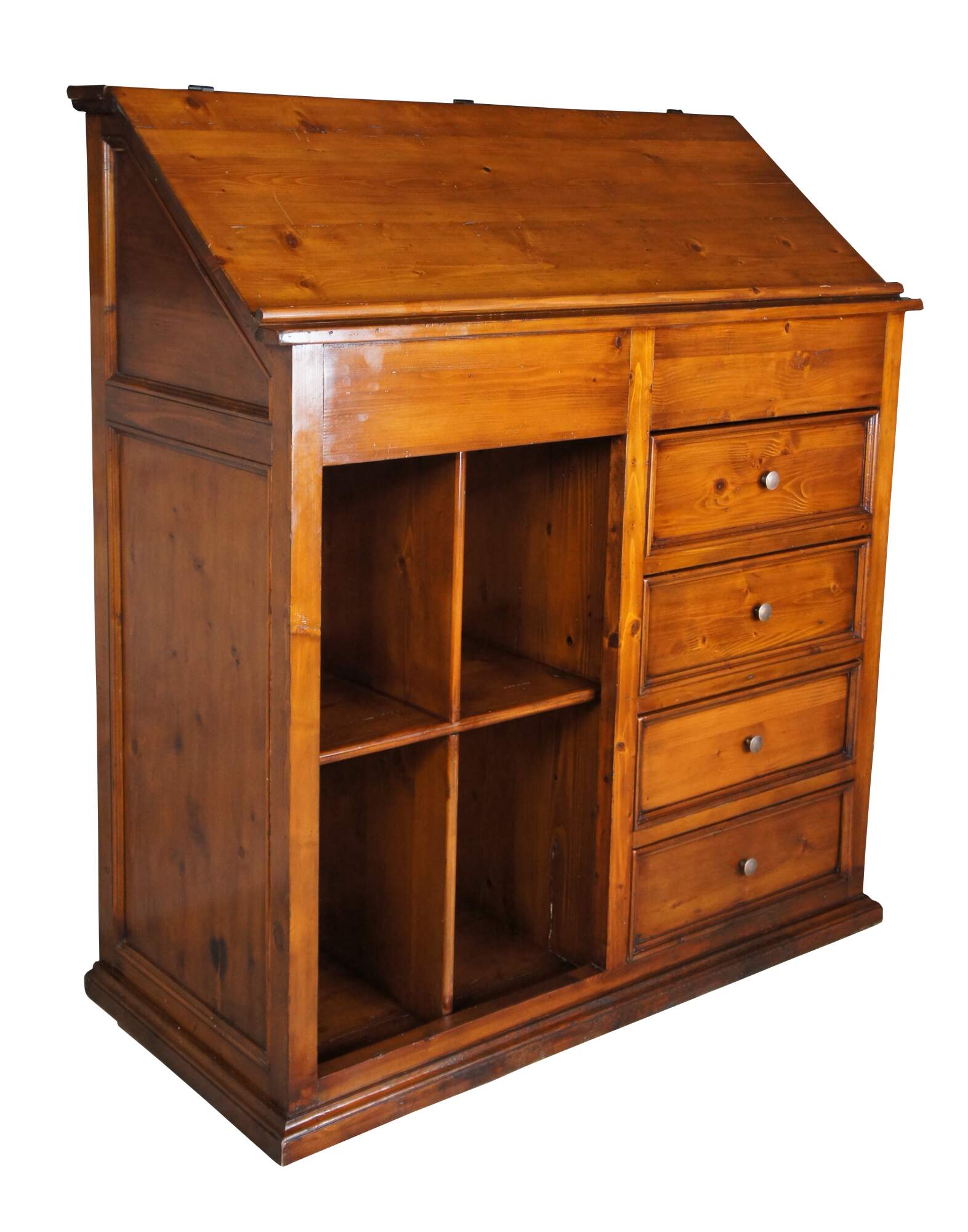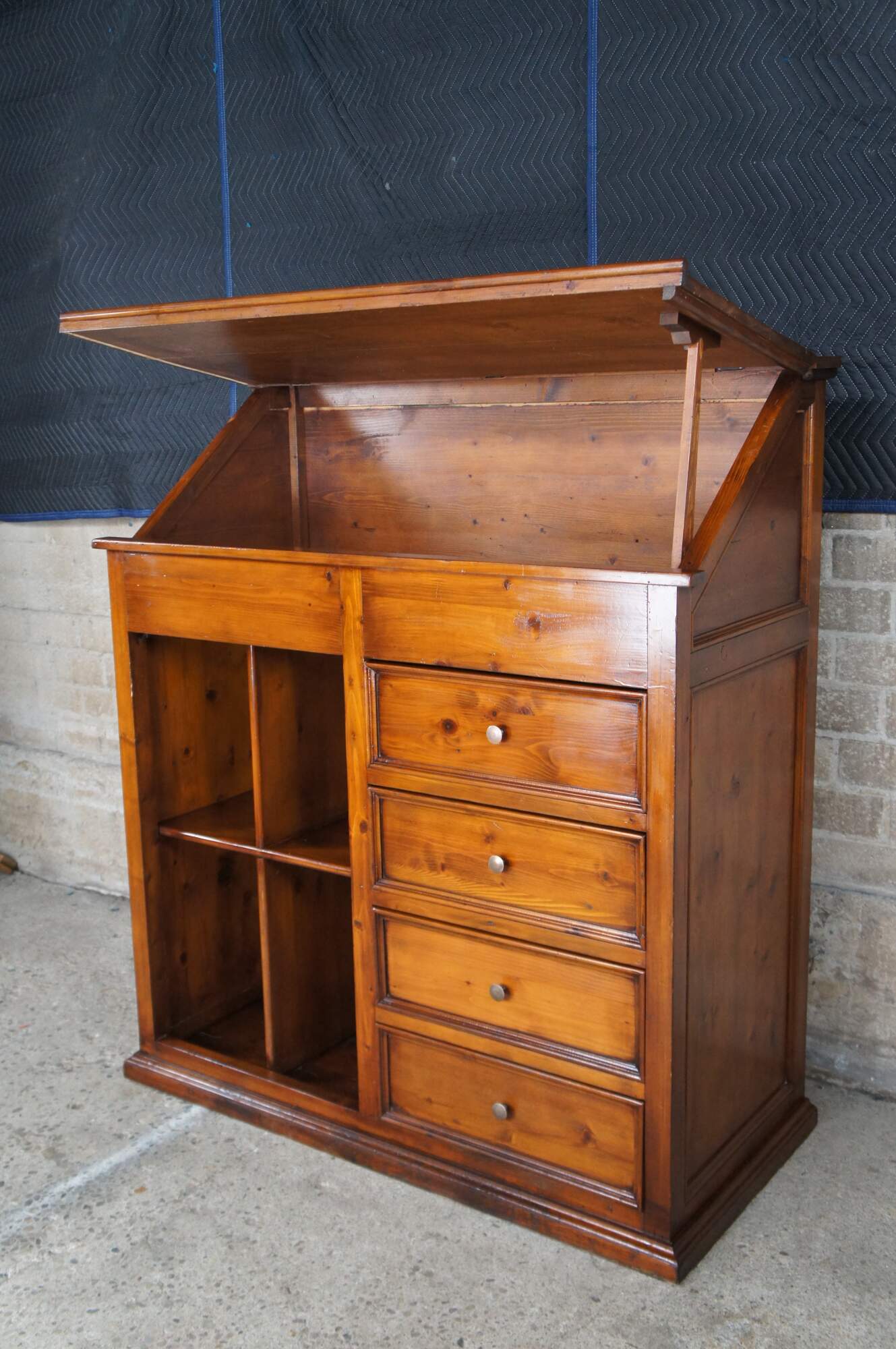Charming mid 20th century slant top desk, dresser or secretary. A fun cross between an old standing desk and chifferobe. Features a large slant top that can be used for work or display. The lid opens and is held in place via a latch allowing for stowing of supplies, garments or collectibles. The lower side of the desk has four drawers along the right with metal hardware and partitioned cubbies to the left. A versatile design that can be used in your office, studio or even bedroom.