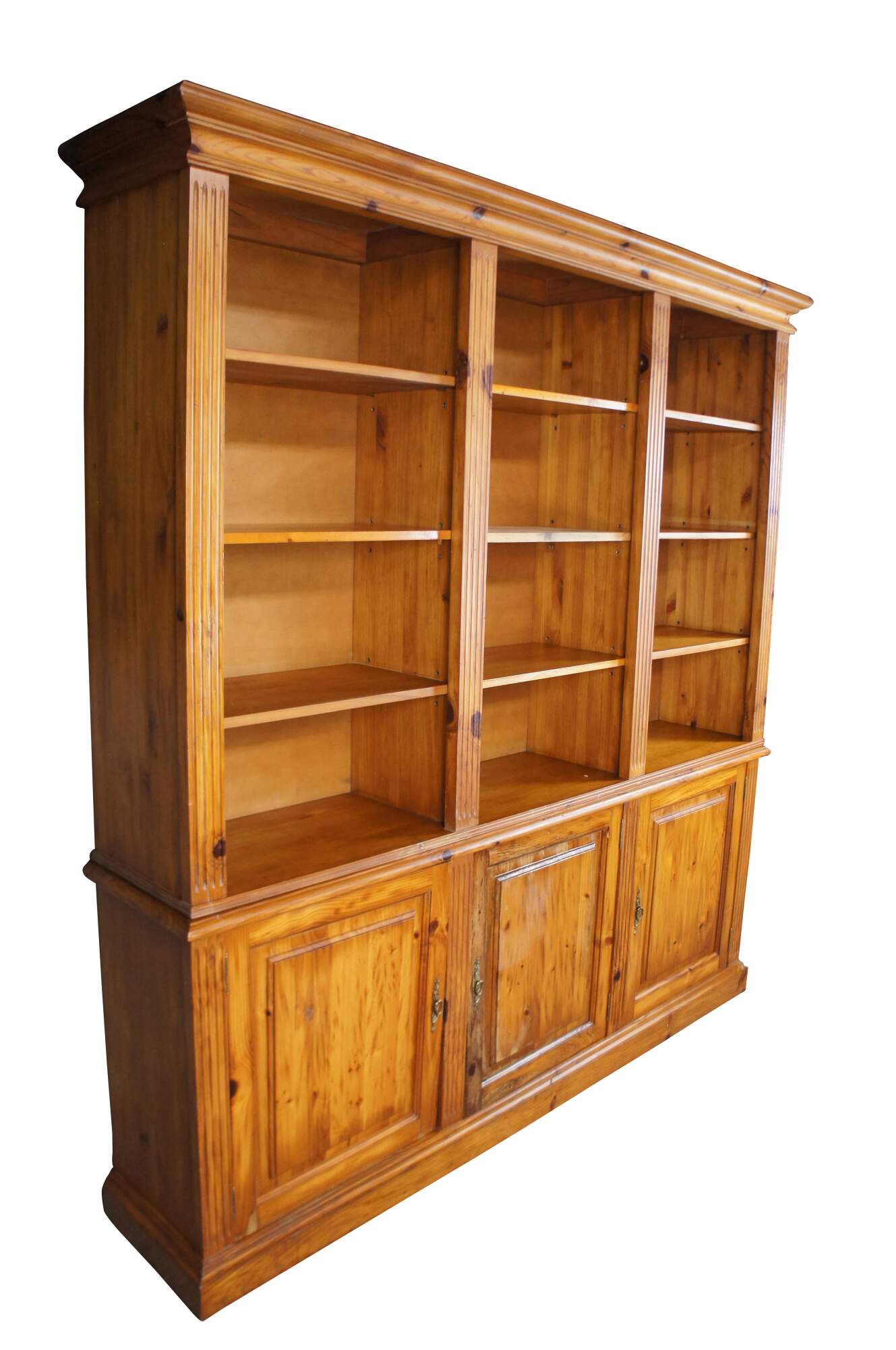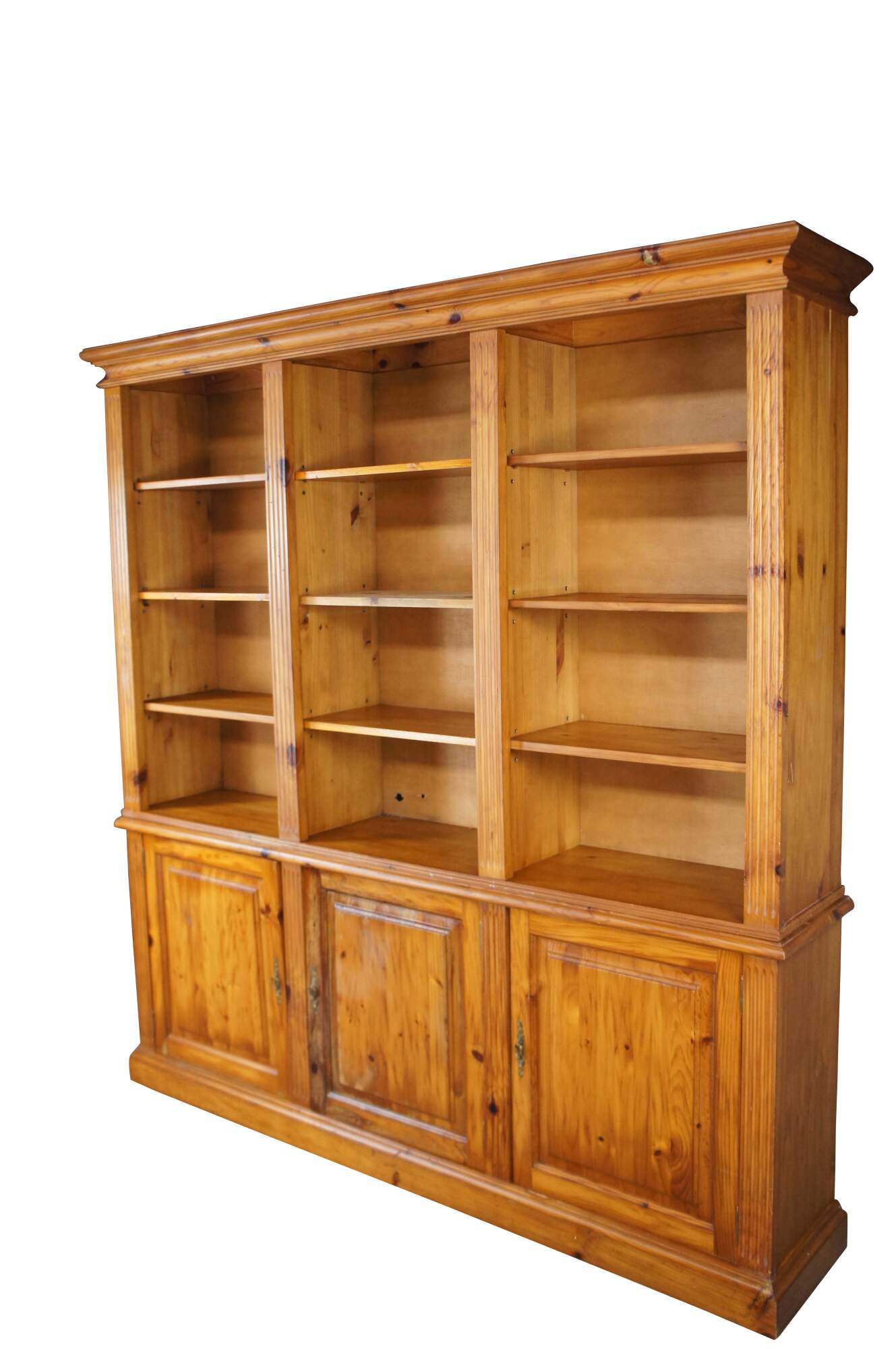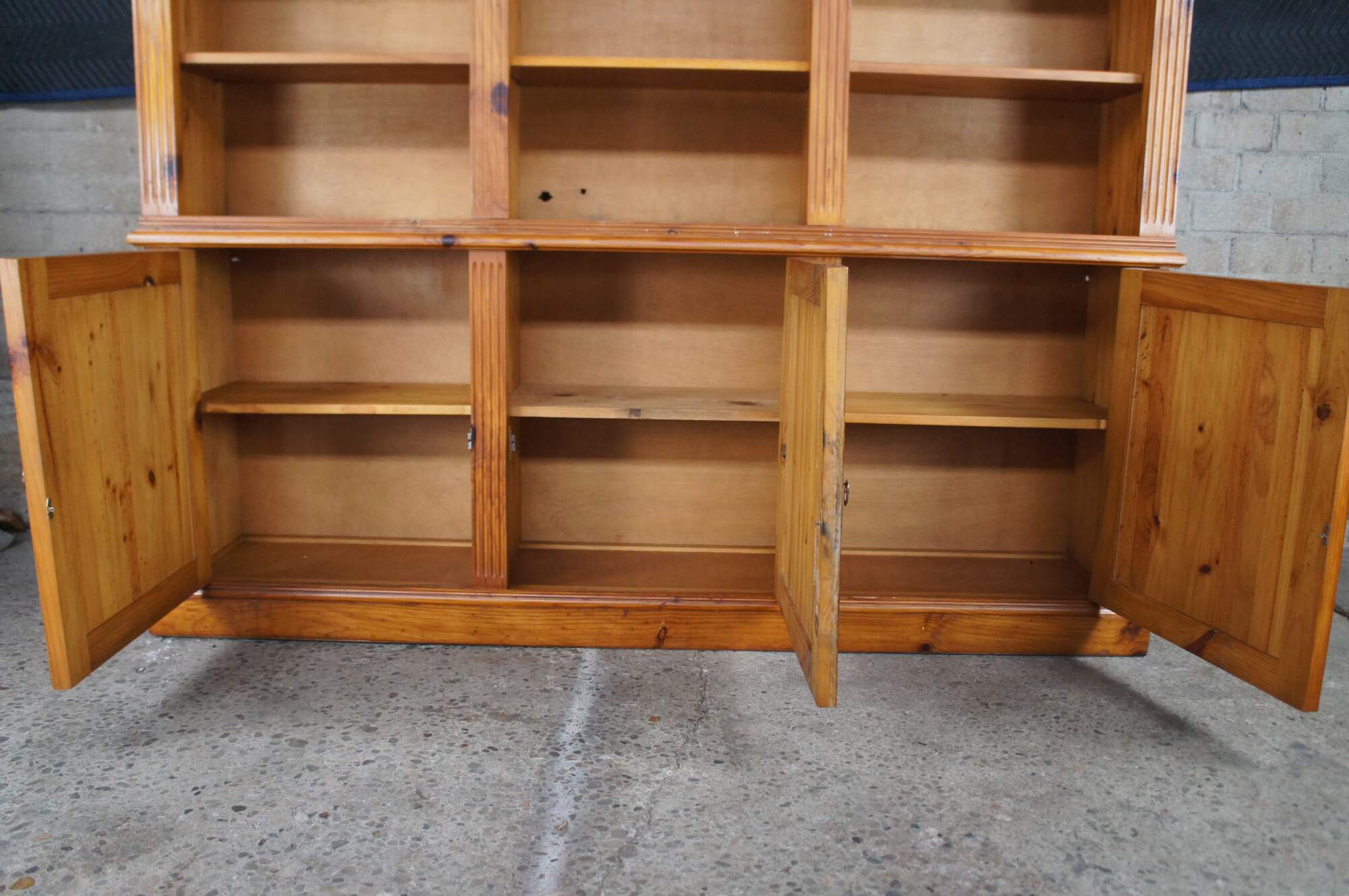 A lovely European pine Bookcase by Alberto Carvers of Spain, circa 1960s. Features a solid pine construction with nine adjustable shelves flanked by fluted columns. The two piece cabinet is supported by a three door base with an interior shelf in each compartment. A charming piece for any Great Room, Library or study.