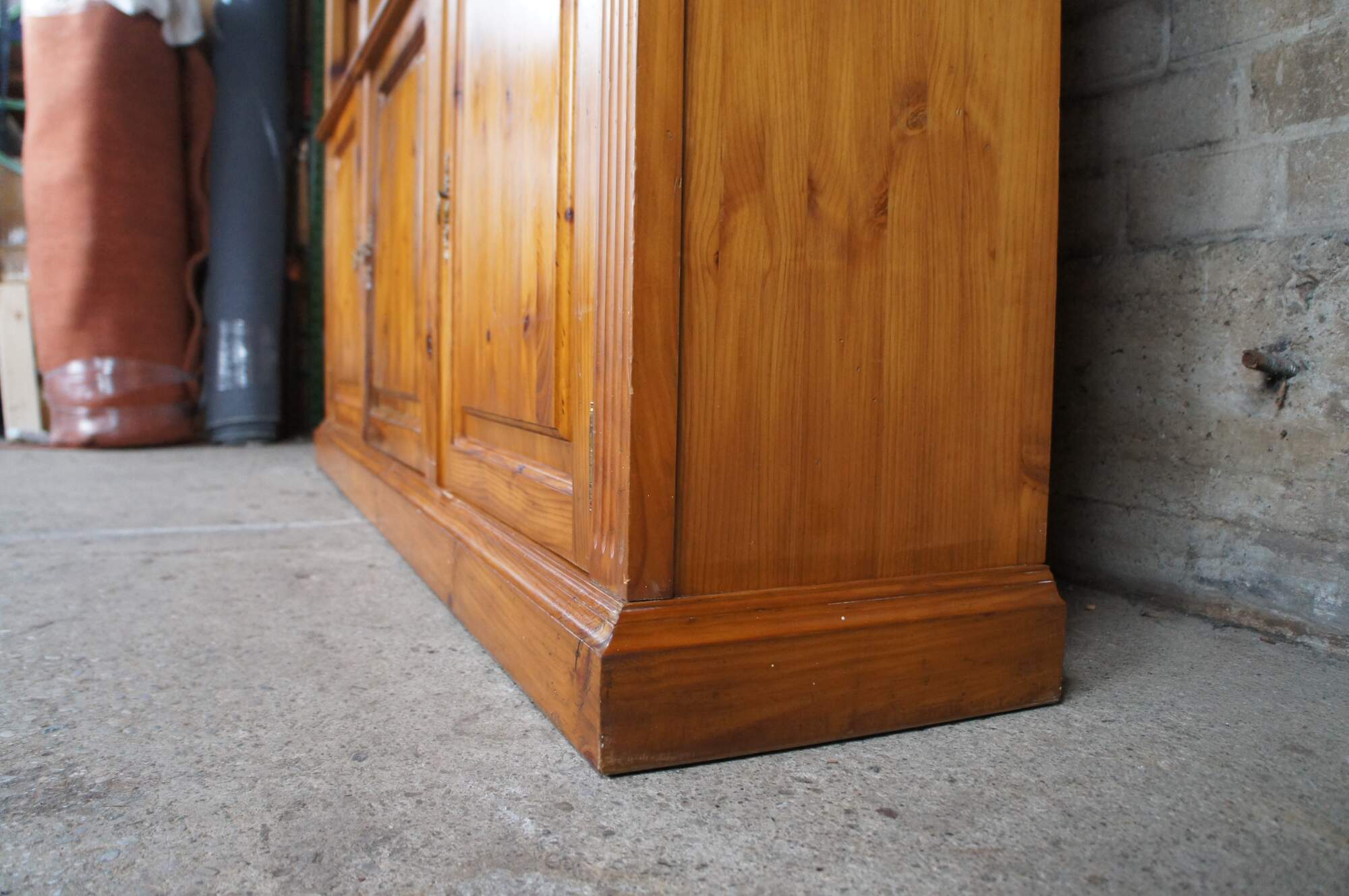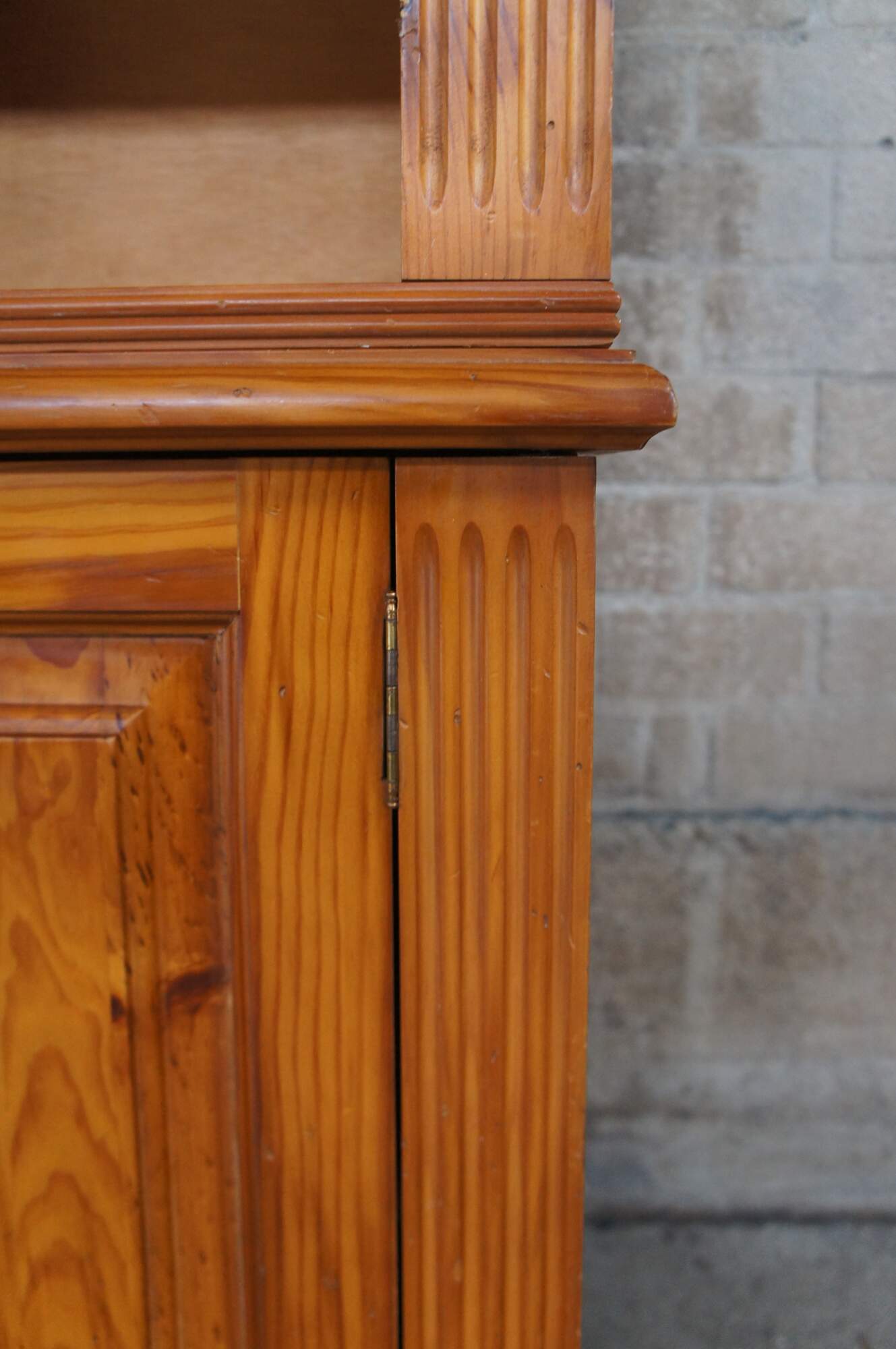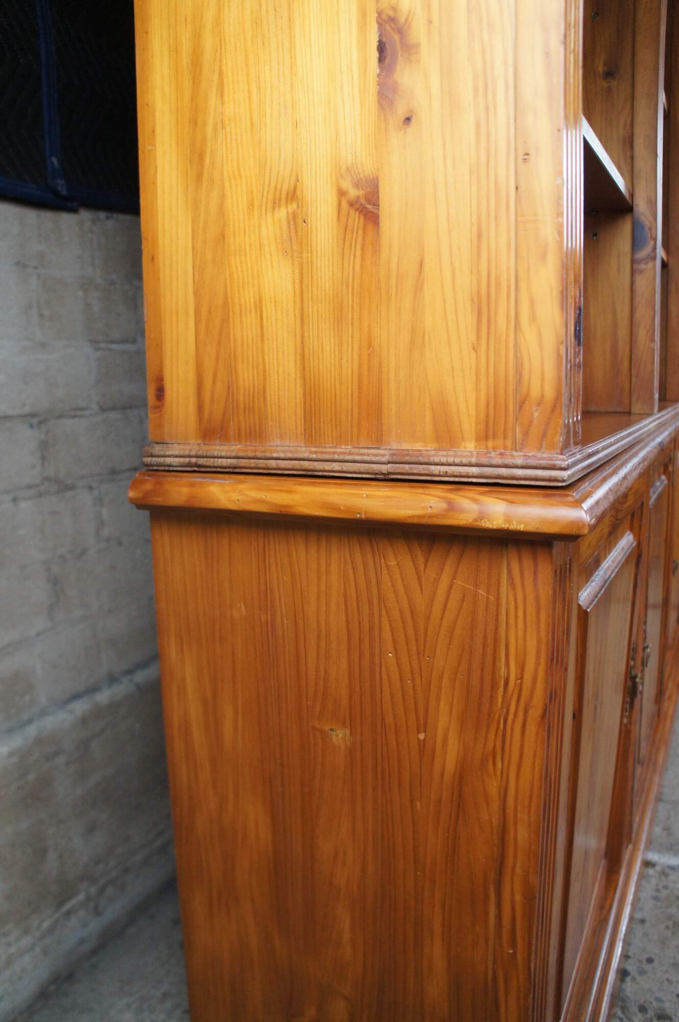 A lovely European pine Bookcase by Alberto Carvers of Spain, circa 1960s. Features a solid pine construction with nine adjustable shelves flanked by fluted columns. The two piece cabinet is supported by a three door base with an interior shelf in each compartment. A charming piece for any Great Room, Library or study.