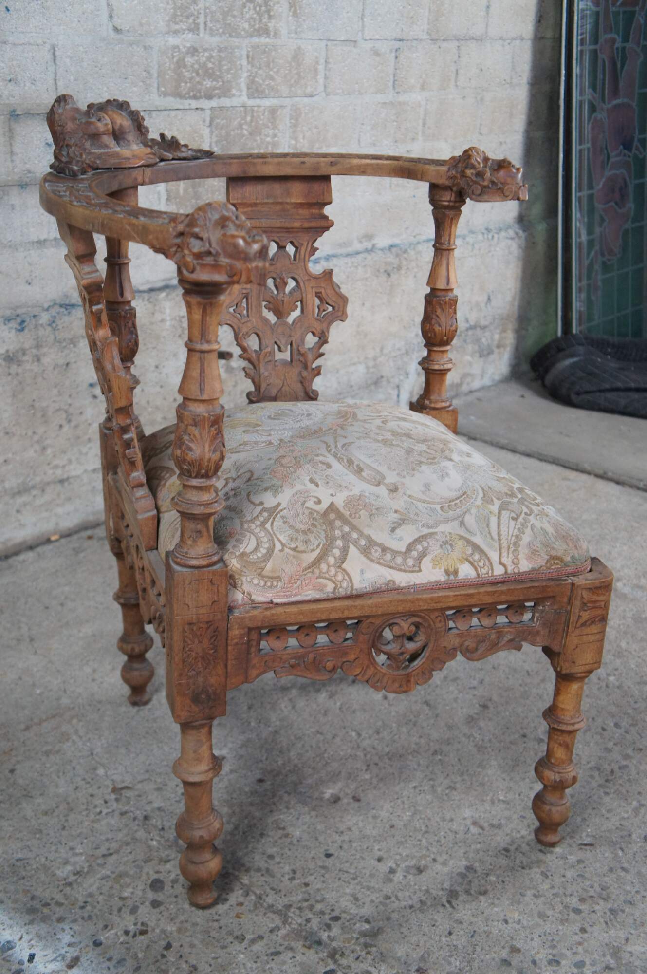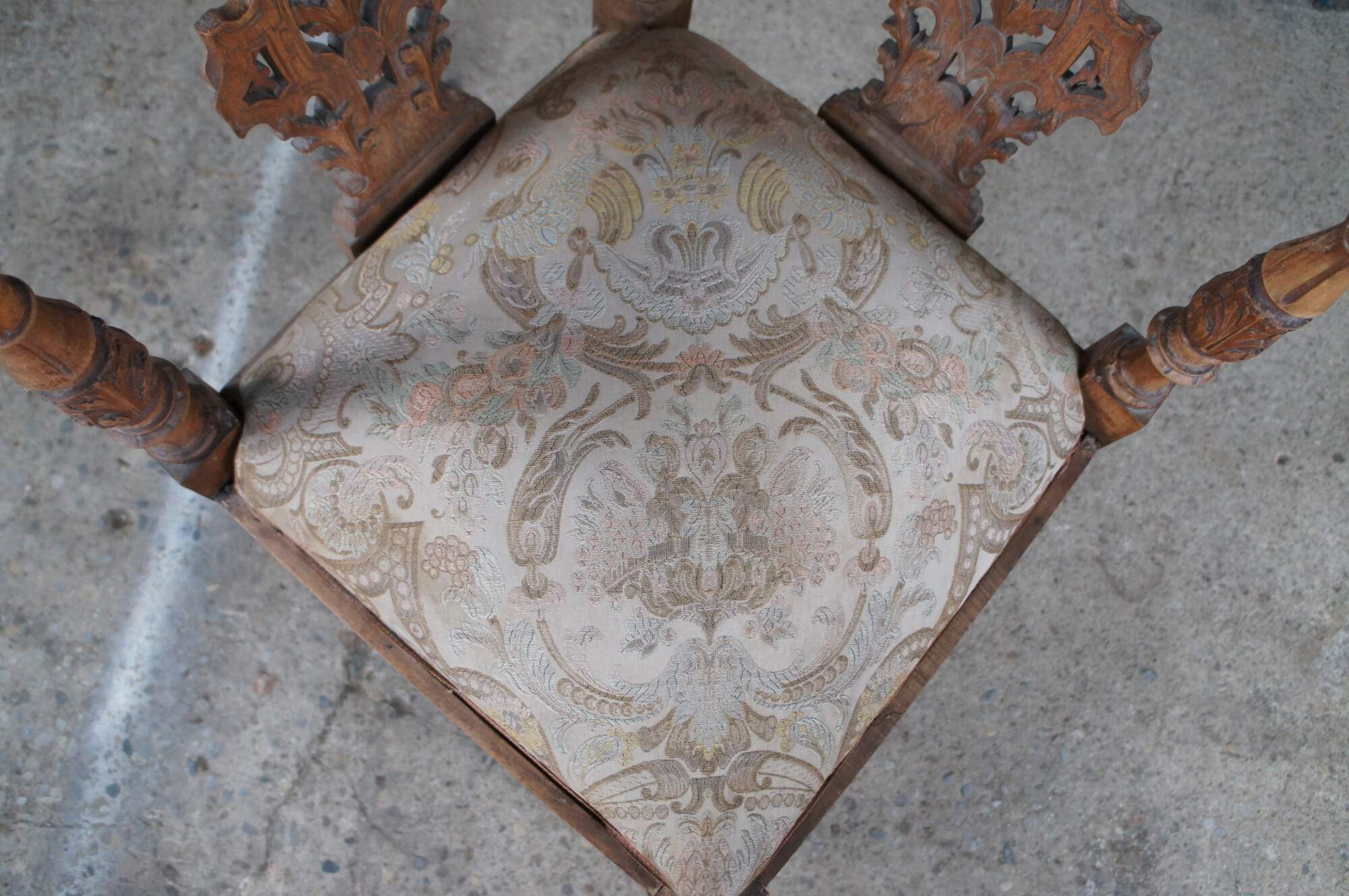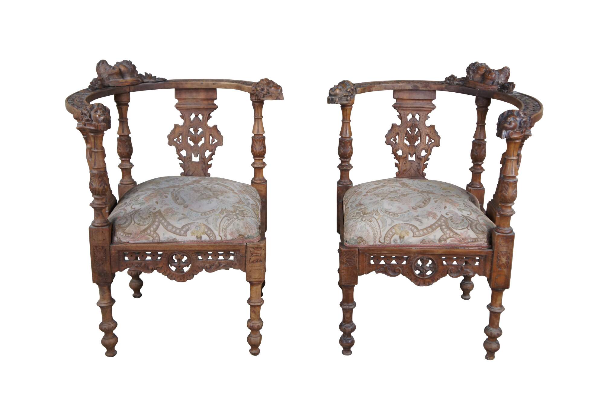 Pair of Antique Italian Neo-Renaissance corner chairs, circa 1870s. Made of walnut featuring Neoclassical styling with high relief figural carvings of cherubs /puttis over pierced foliate back splats and acanthus turned posts. The chairs showcase a nice upholstered brocade seat over contoured and reticulated aprons. Legs are turned with arrow feet.