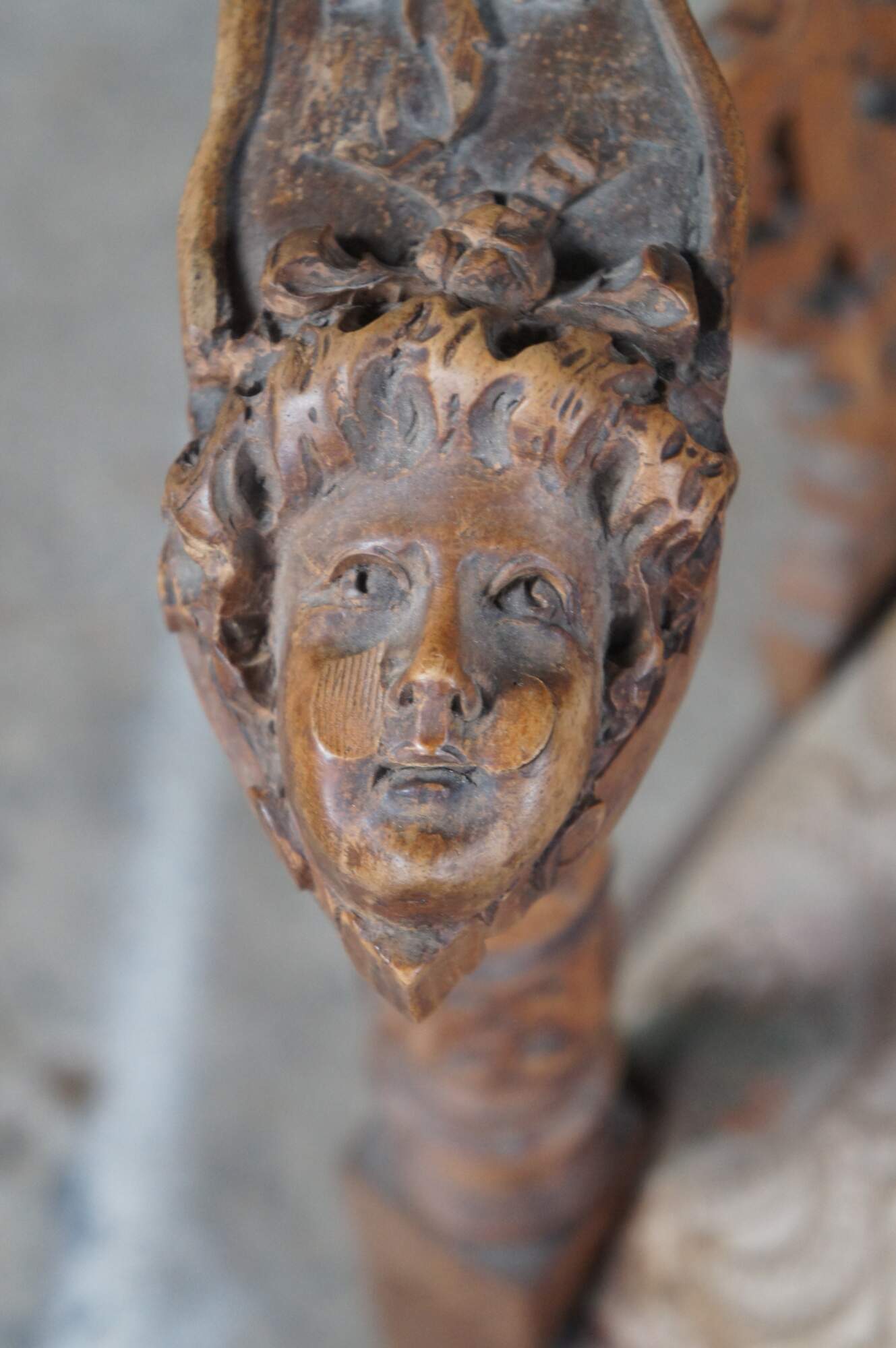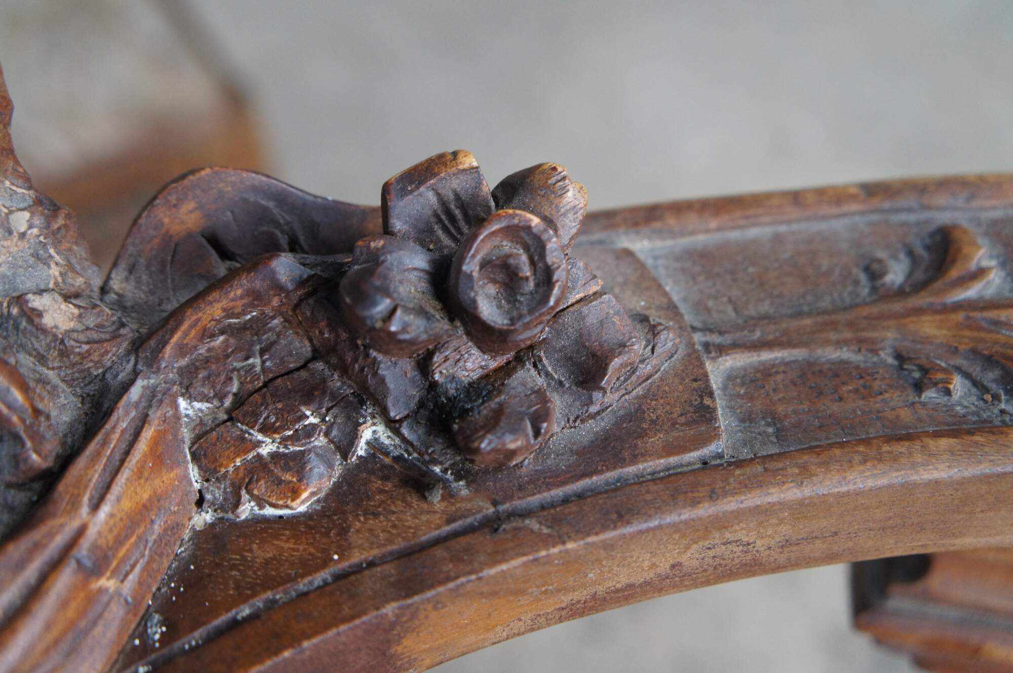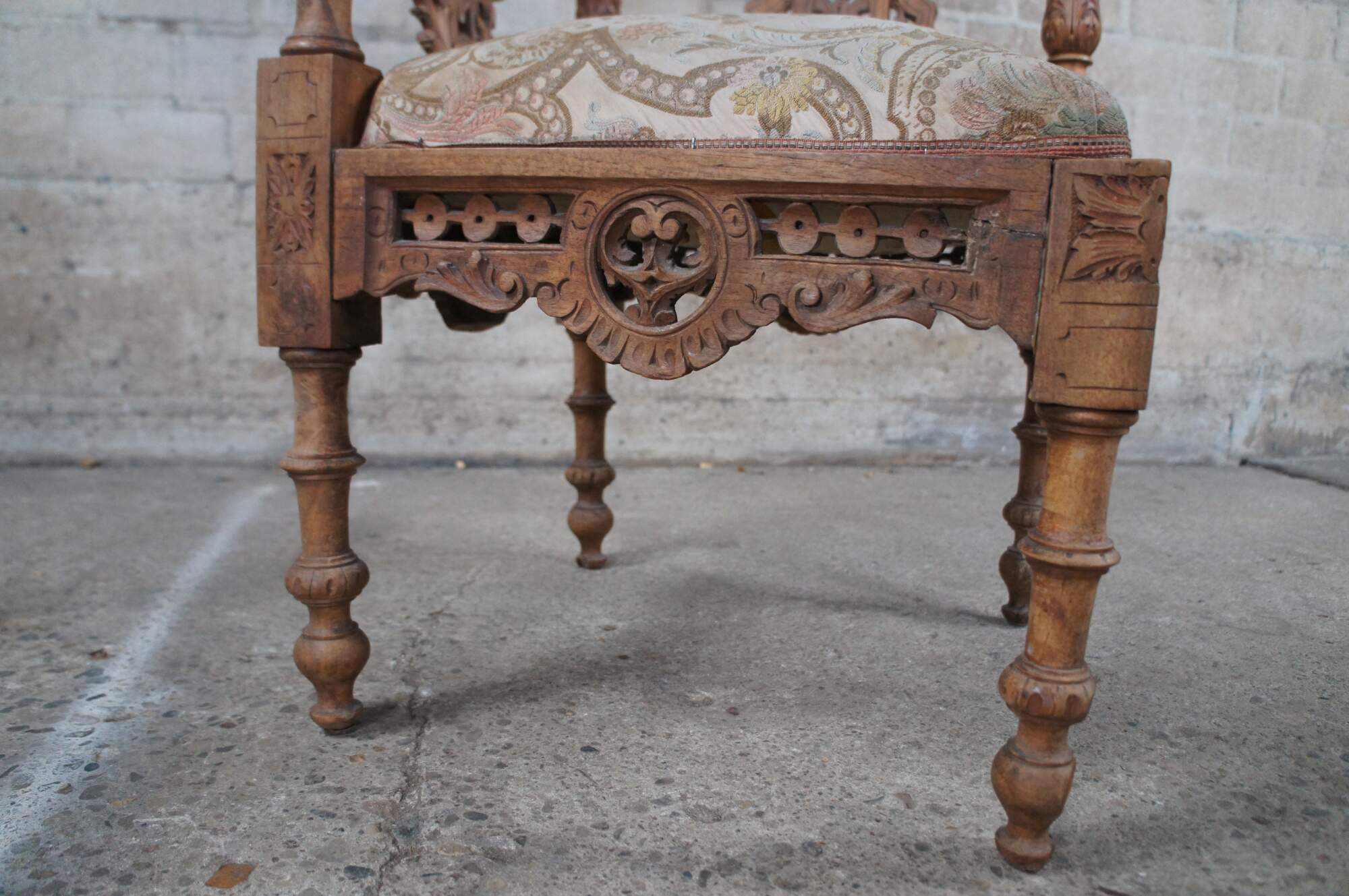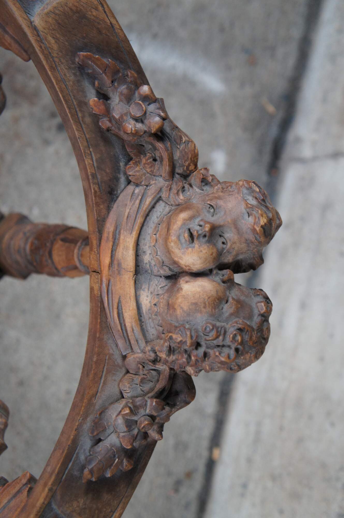 Pair of Antique Italian Neo-Renaissance corner chairs, circa 1870s. Made of walnut featuring Neoclassical styling with high relief figural carvings of cherubs /puttis over pierced foliate back splats and acanthus turned posts. The chairs showcase a nice upholstered brocade seat over contoured and reticulated aprons. Legs are turned with arrow feet.