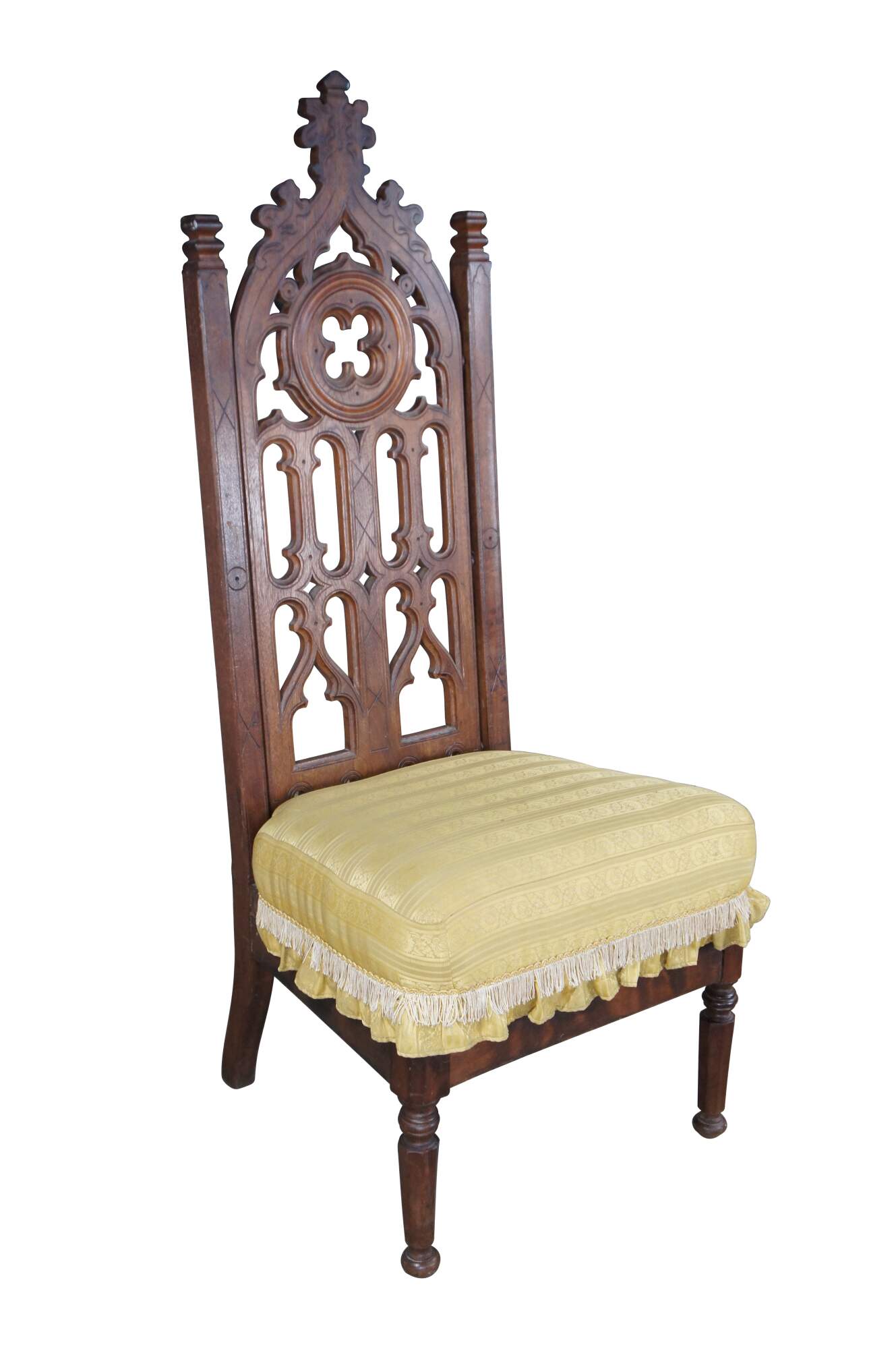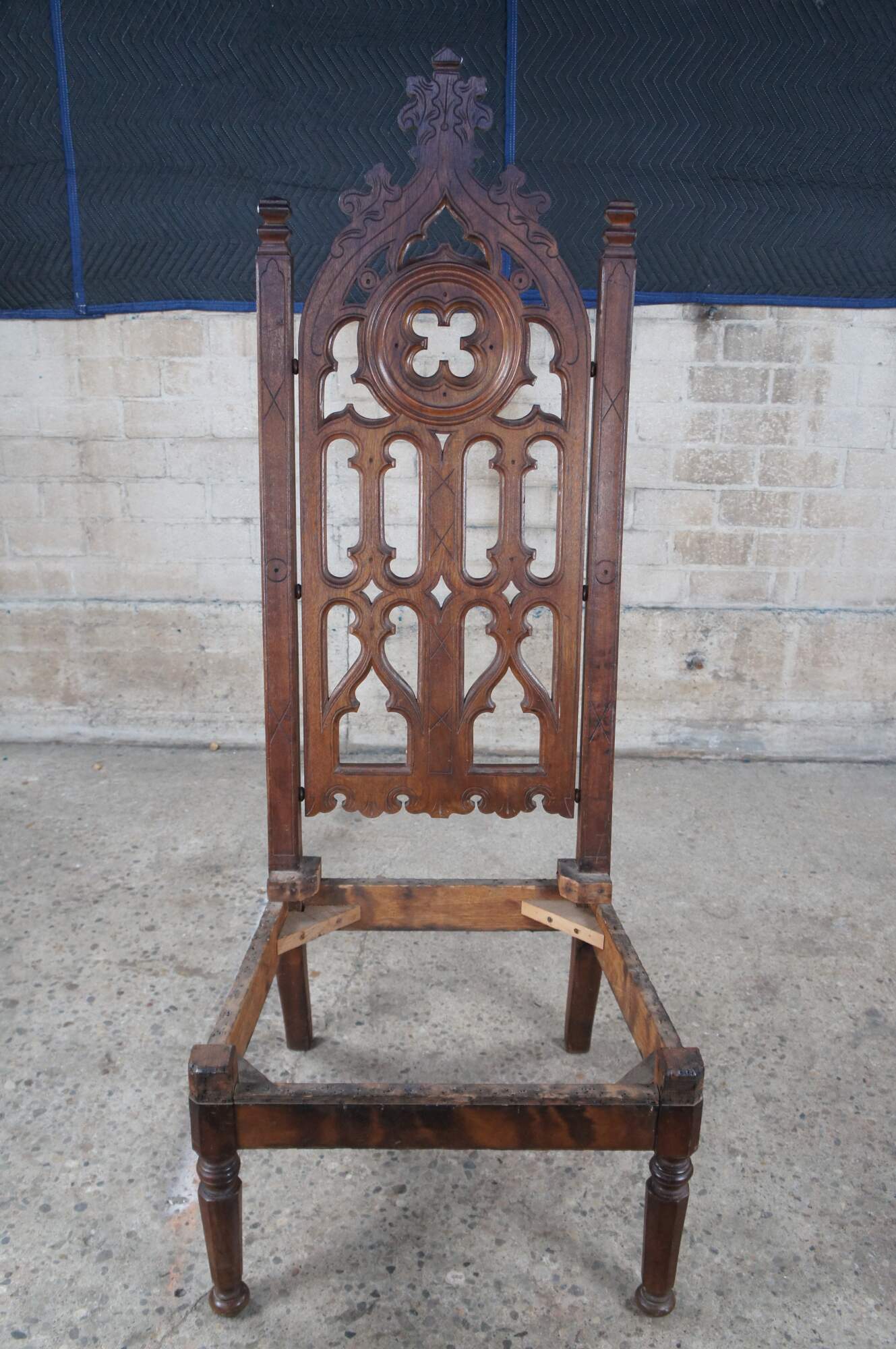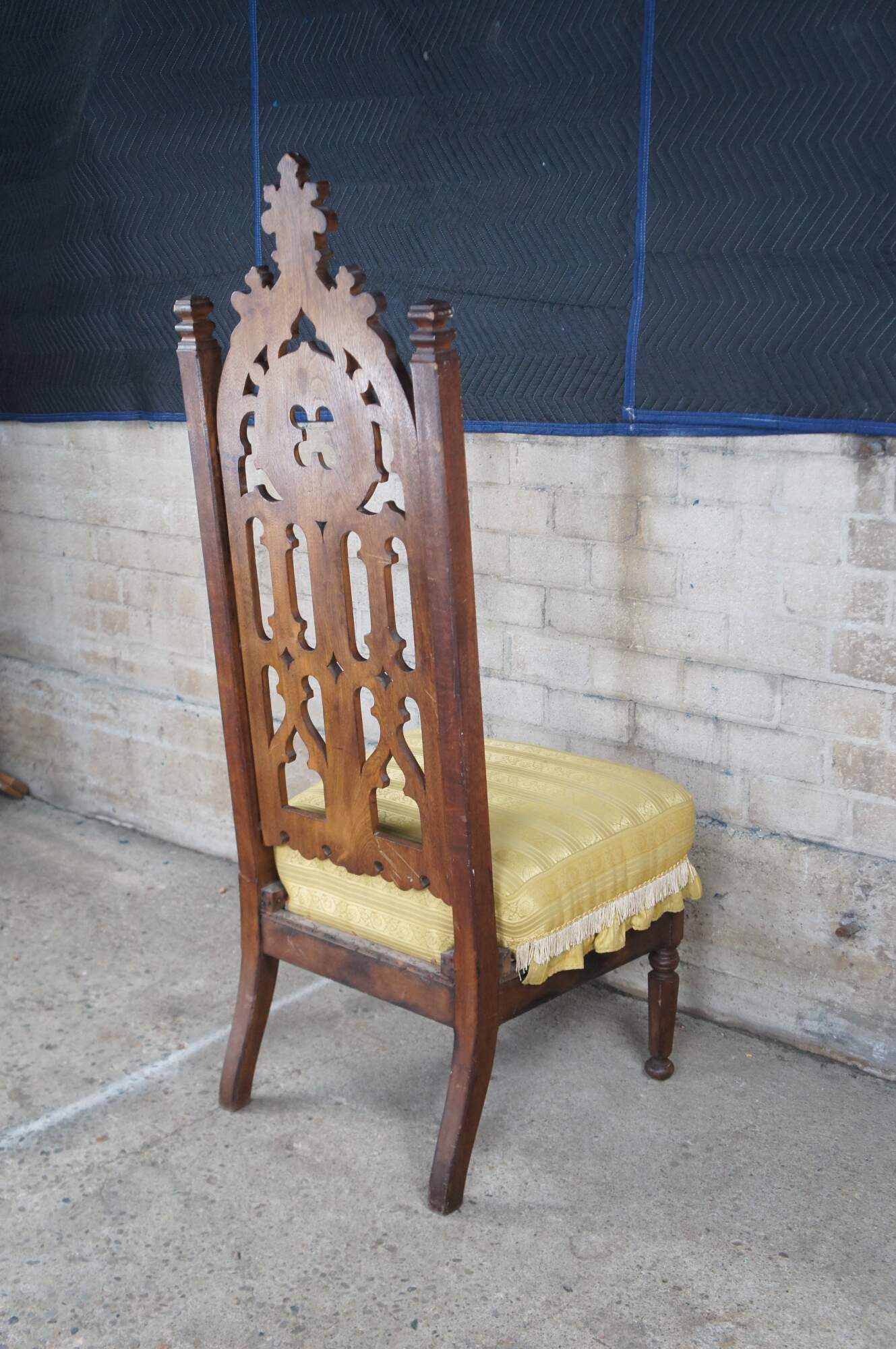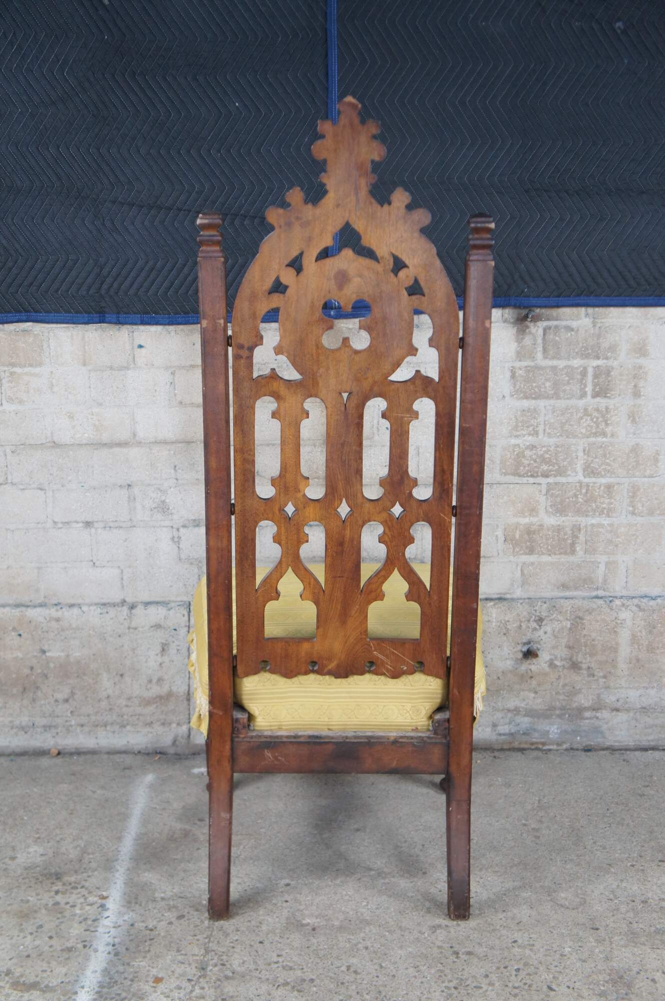 Large antique American Gothic Revival throne chair, circa 1870s. Made from walnut with a pierced cathedral back featuring arches and a central quatrefoil. Seat is upholstered in silk with an alternating striped floral pattern with tasseled skirt. The chair is supported by octagonal turned legs leading to a bun foot.