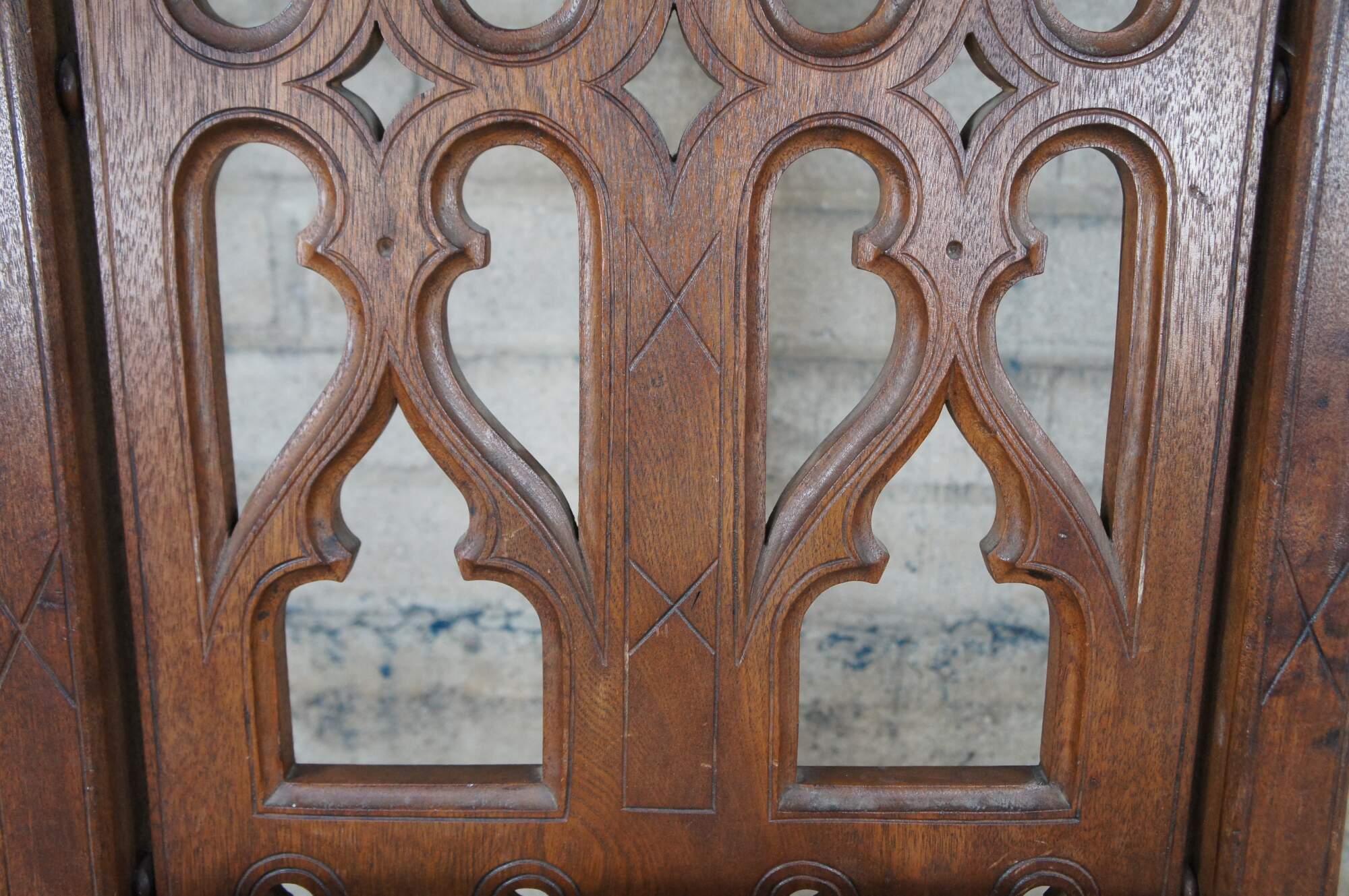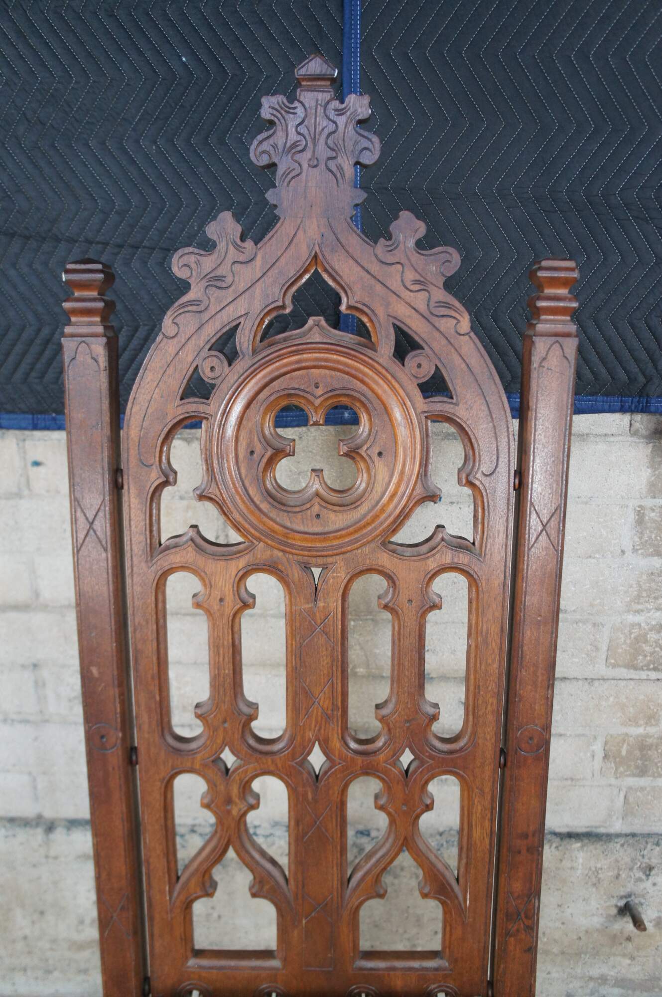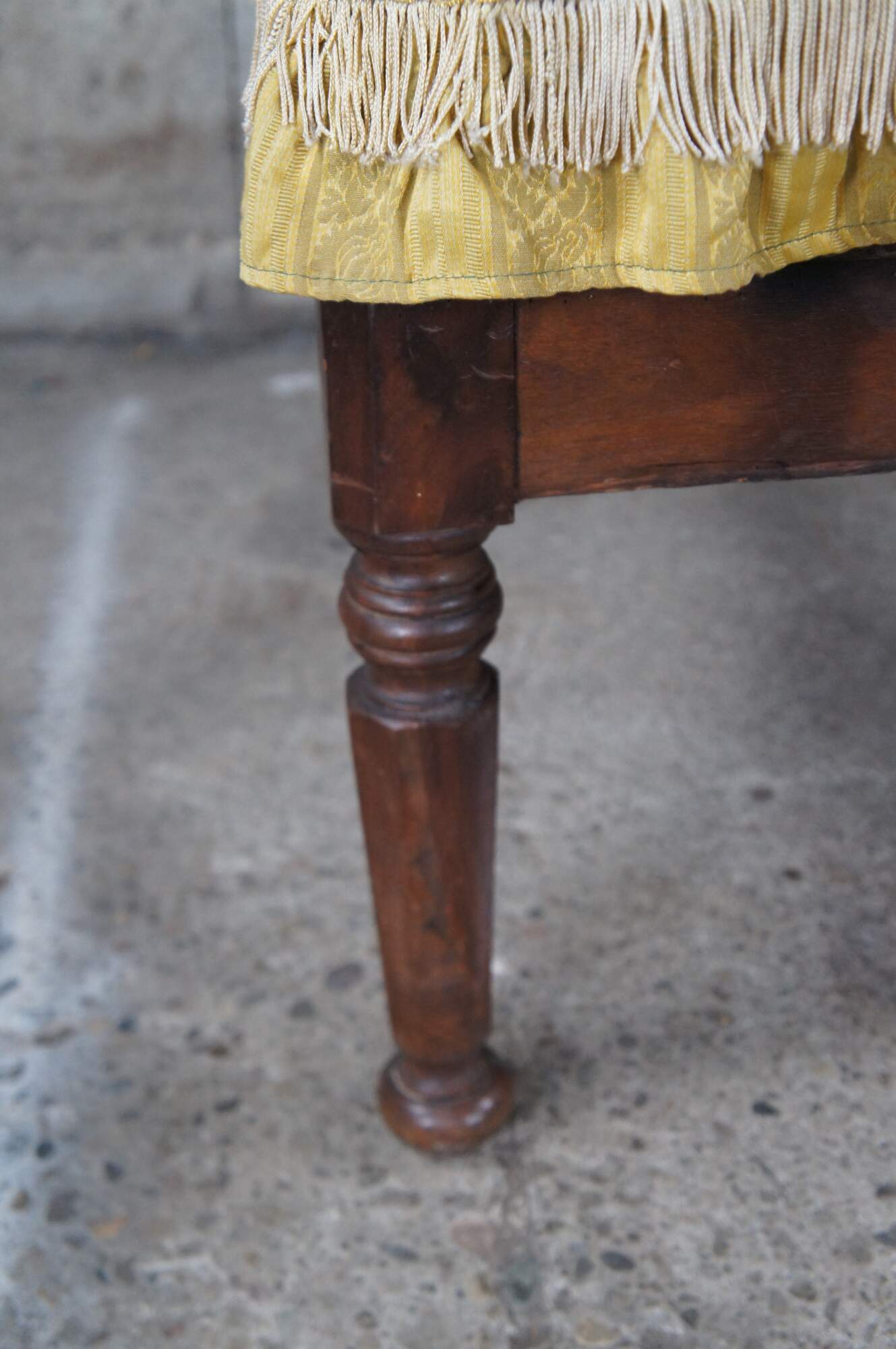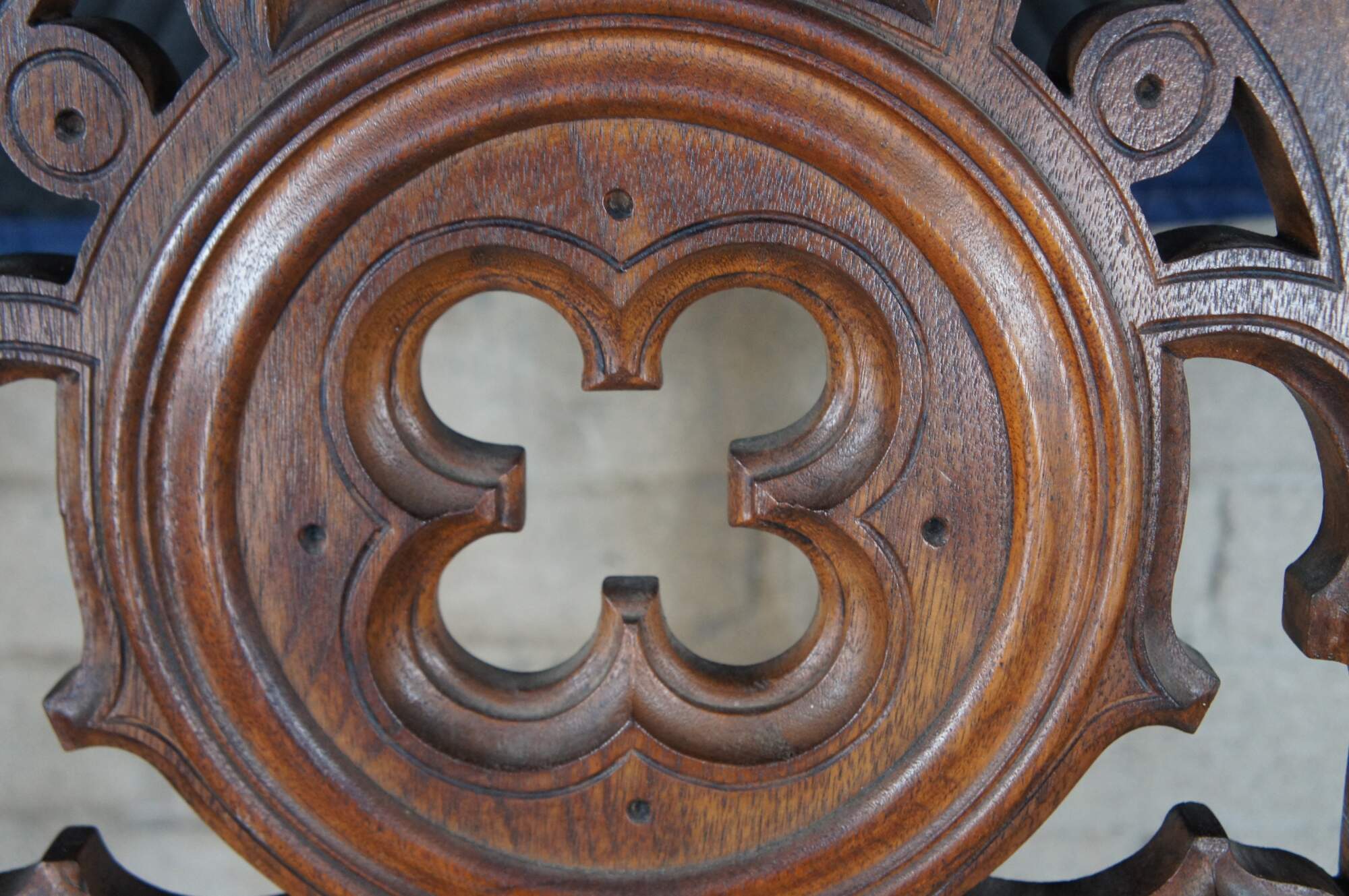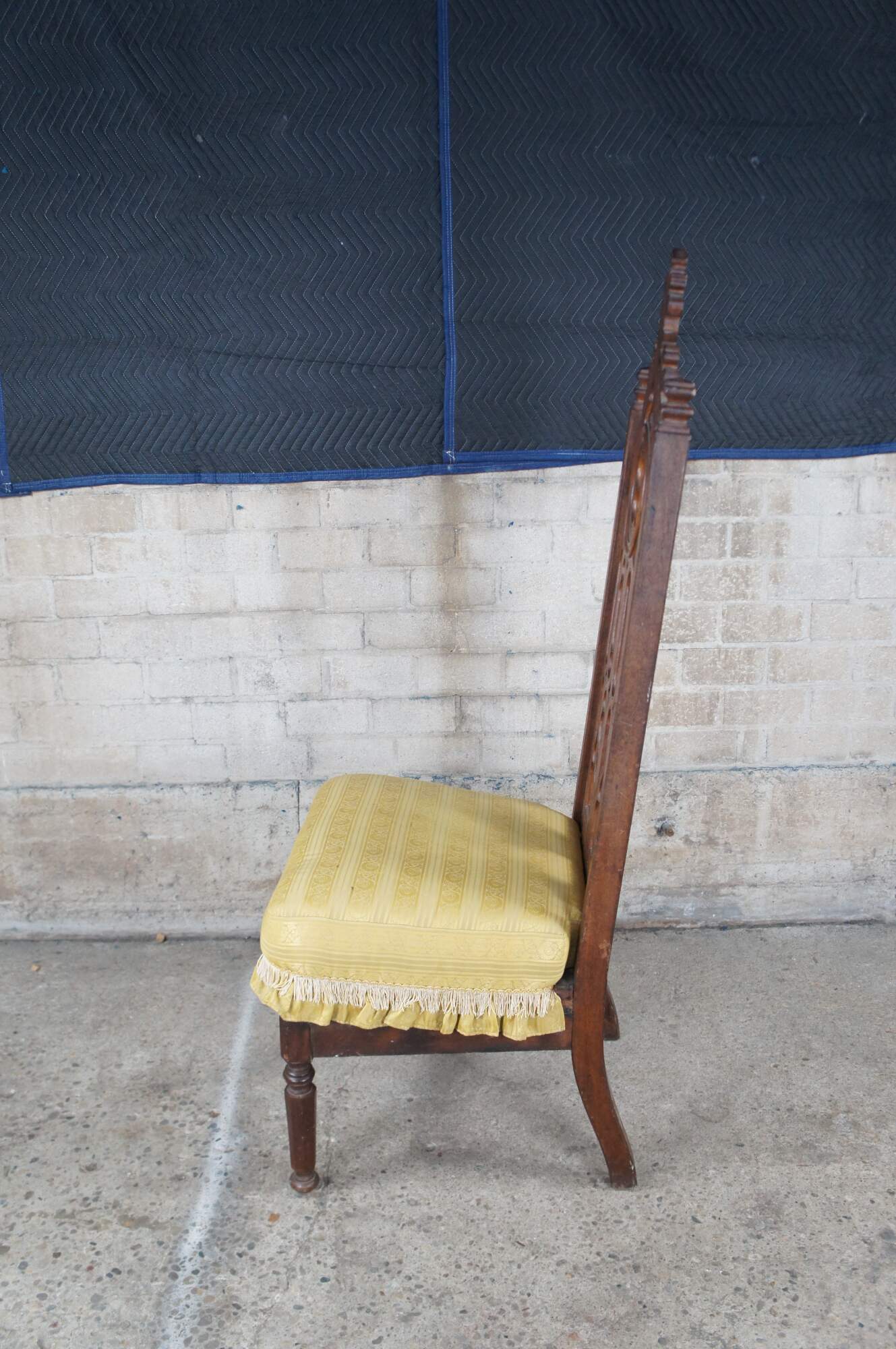 Large antique American Gothic Revival throne chair, circa 1870s. Made from walnut with a pierced cathedral back featuring arches and a central quatrefoil. Seat is upholstered in silk with an alternating striped floral pattern with tasseled skirt. The chair is supported by octagonal turned legs leading to a bun foot.