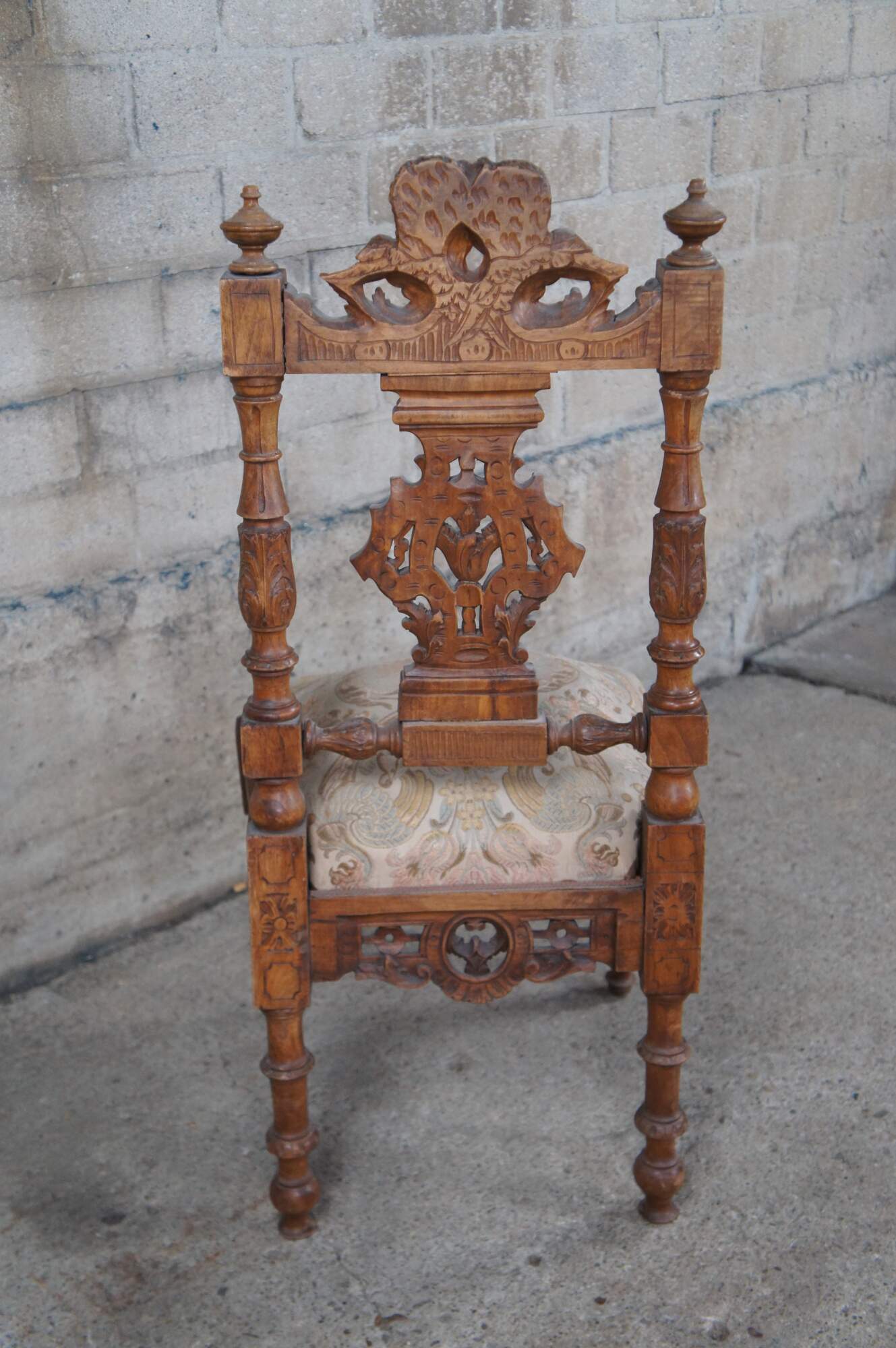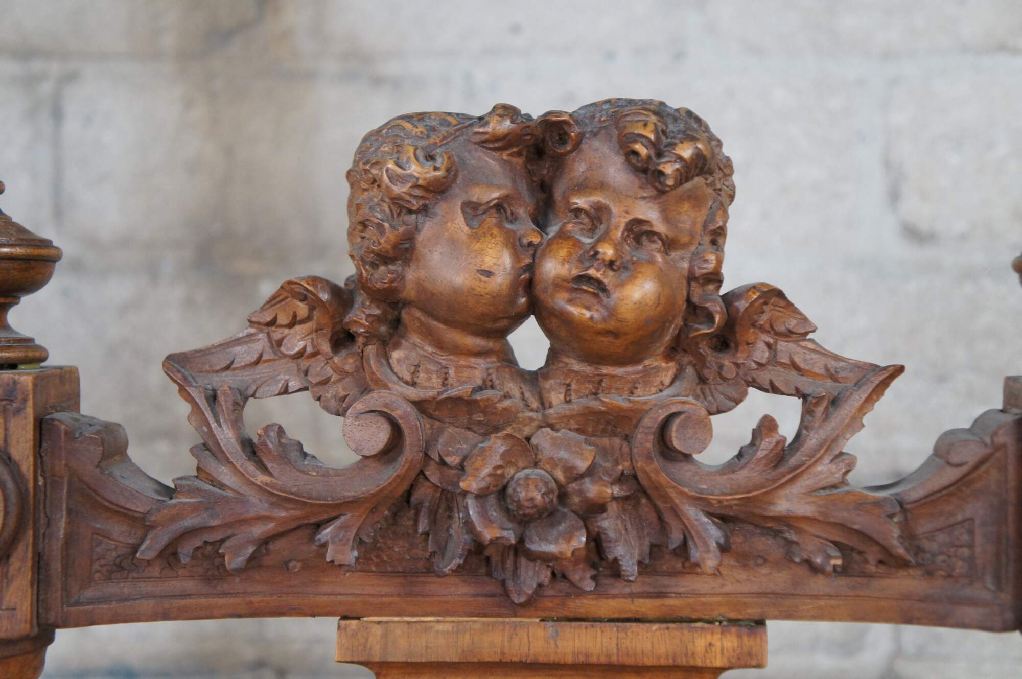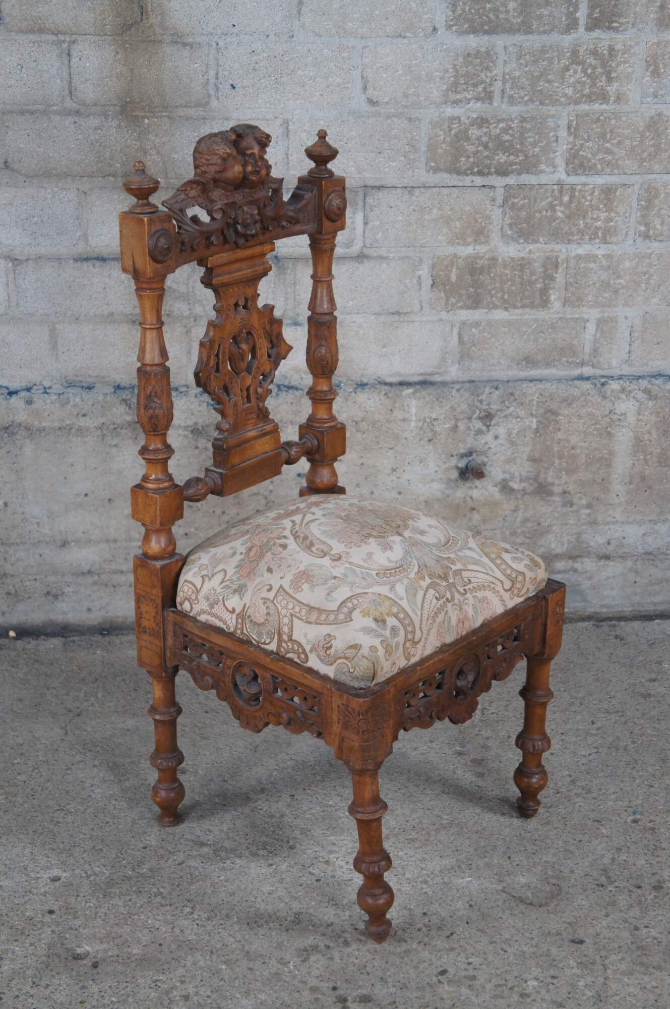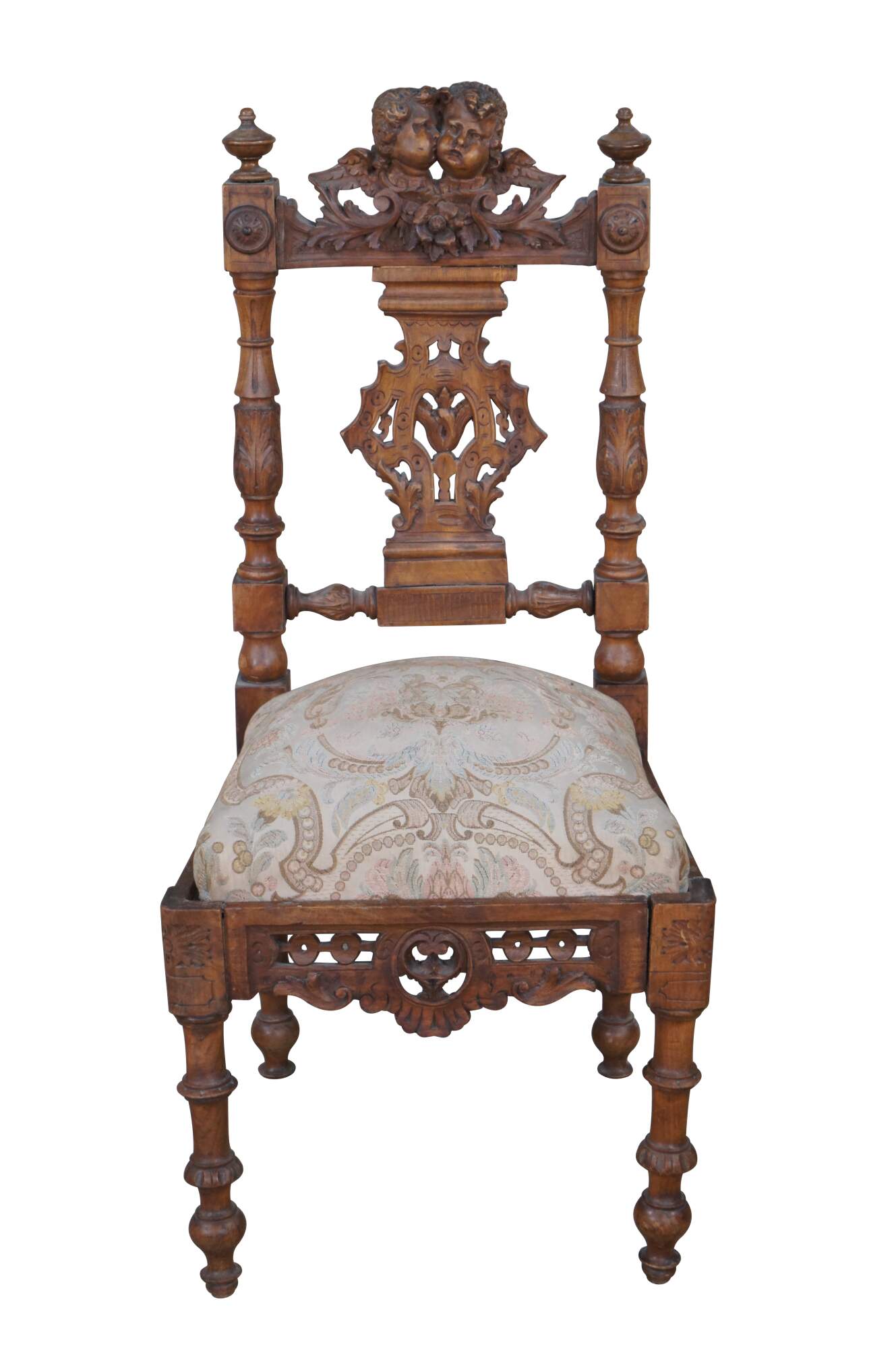 Pair of Antique Italian Neo-Renaissance side chairs, circa 1870s. Made of walnut featuring Neoclassical styling with high relief figural carvings of cherubs /puttis over pierced foliate back splats and acanthus turned posts. The chairs showcase a nice upholstered brocade seat over contoured and reticulated aprons. Legs are turned with arrow feet.