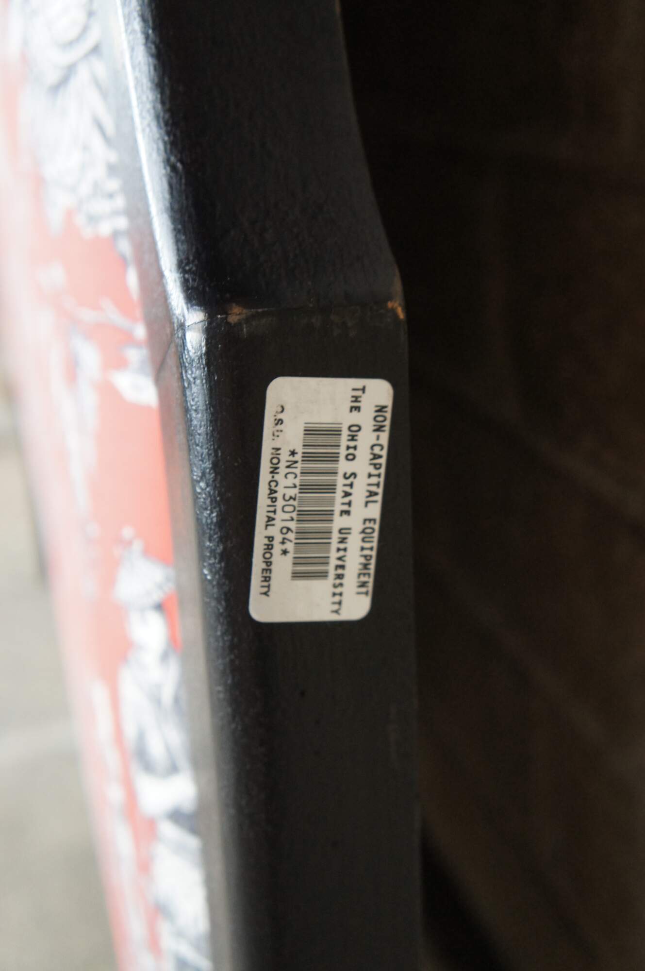 A beautifully ebonized bed frame with upholstered chinoiserie scene from the Amy Howard Collection. Features a nice shape with serpentine formed shoulders. The central scene showcases a red background covered by traditional Chinese / Japanese elements with Geishas, Pagodas, Figures, Pheasants and chrysanthemums. Labeled along the backside.