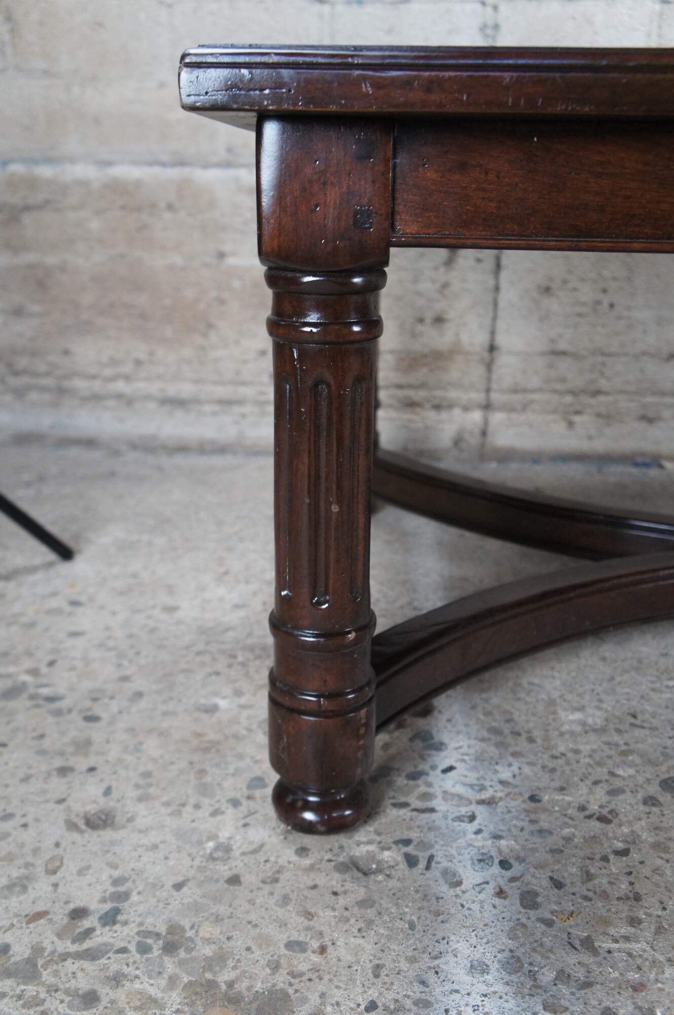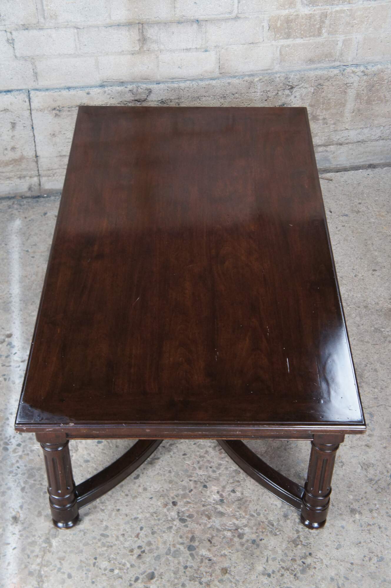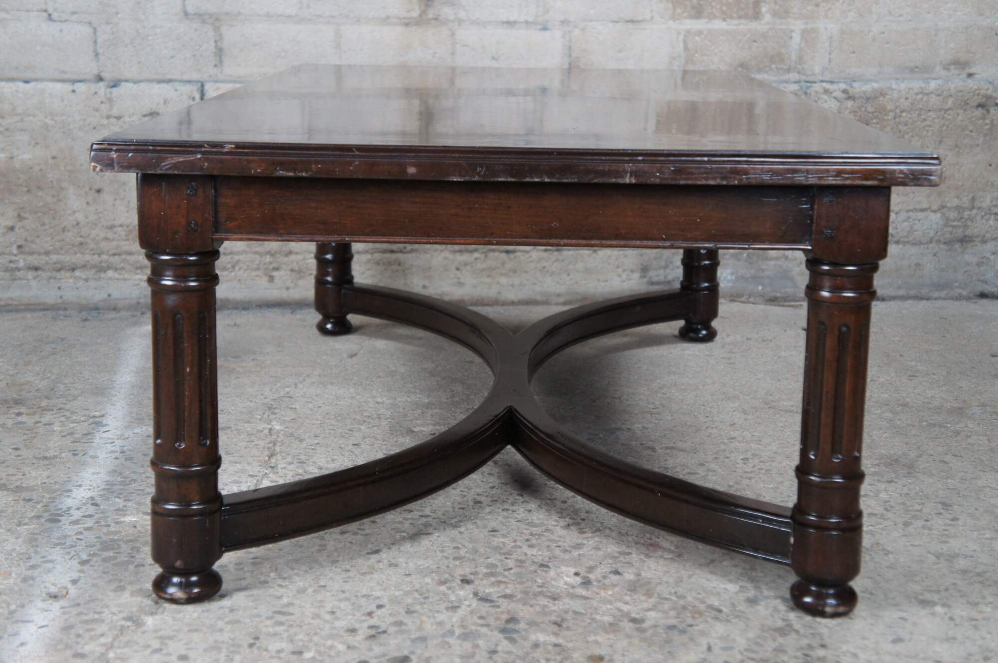 A benchmade coffee table by Bausman & Co. out of Califronia. Features a mitered plank top, curved stretcher and bun feet. Naturally distressed with fluted legs. Finished in walnut