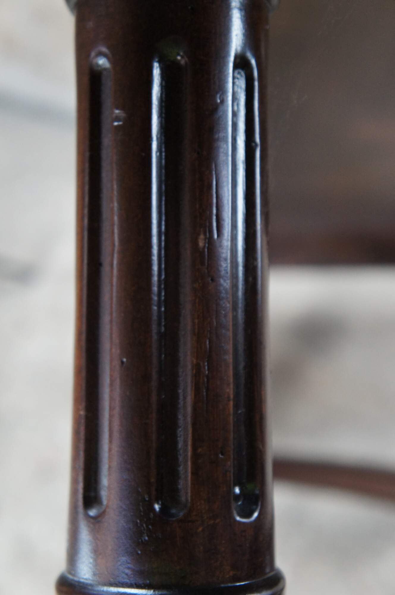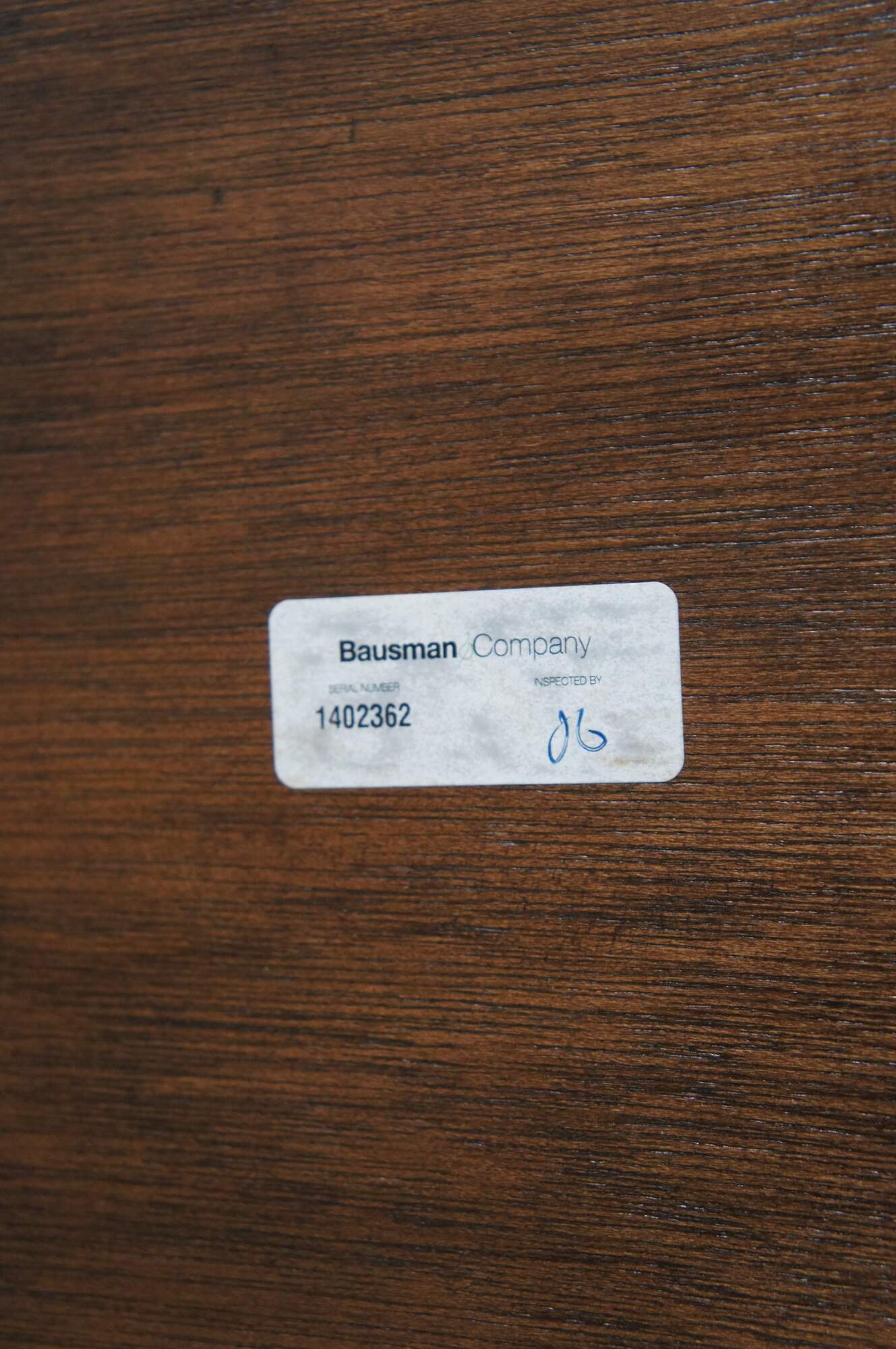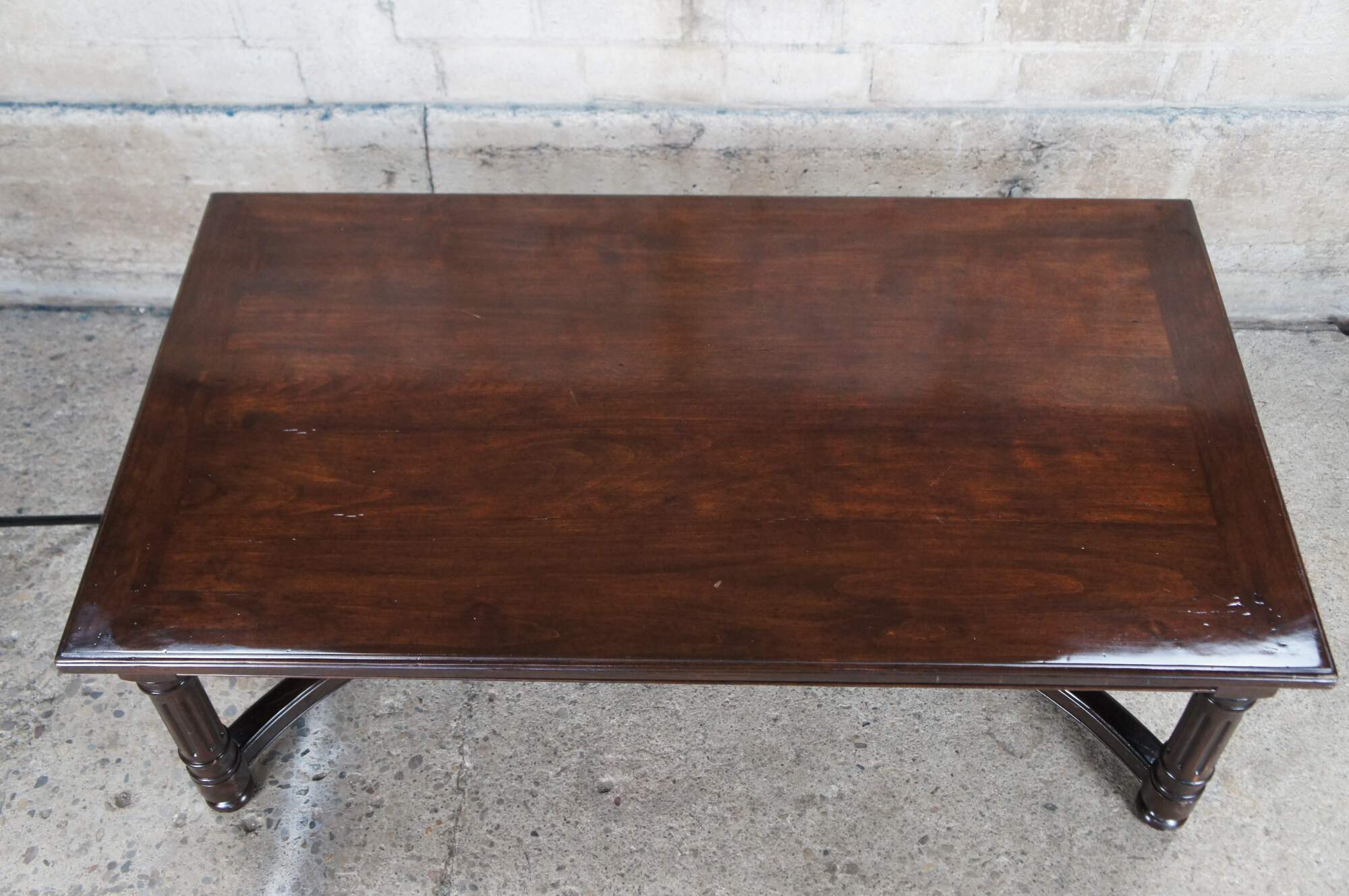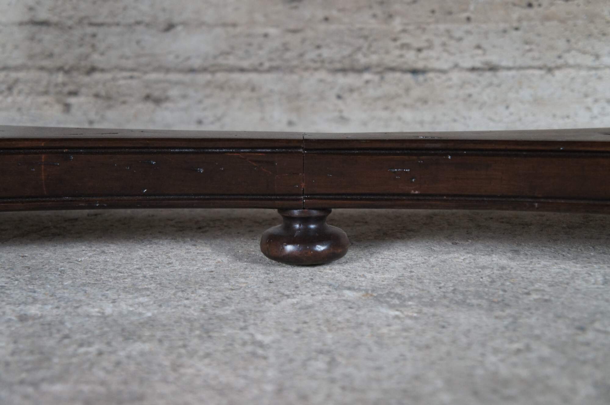 A benchmade coffee table by Bausman & Co. out of Califronia. Features a mitered plank top, curved stretcher and bun feet. Naturally distressed with fluted legs. Finished in walnut