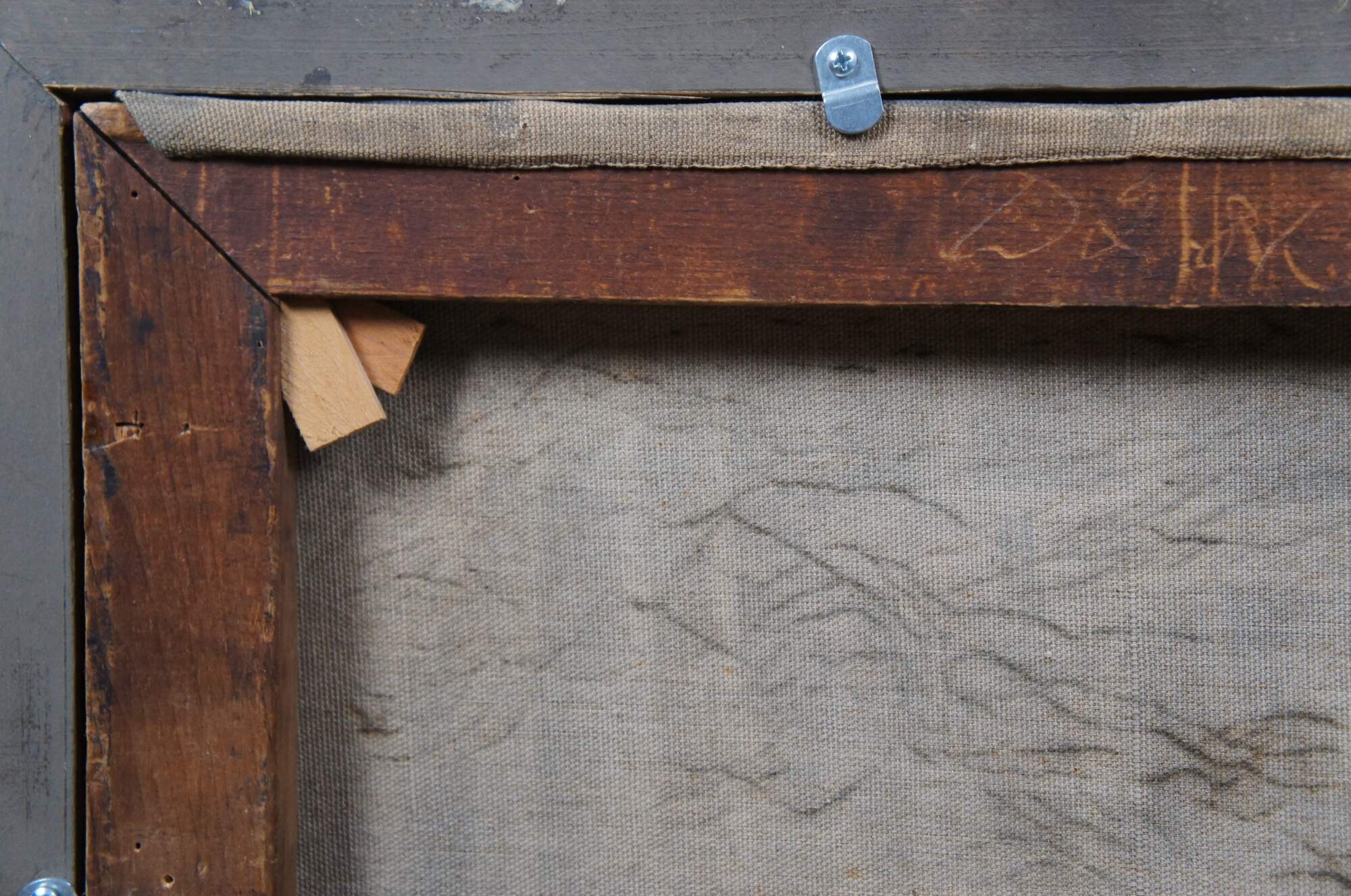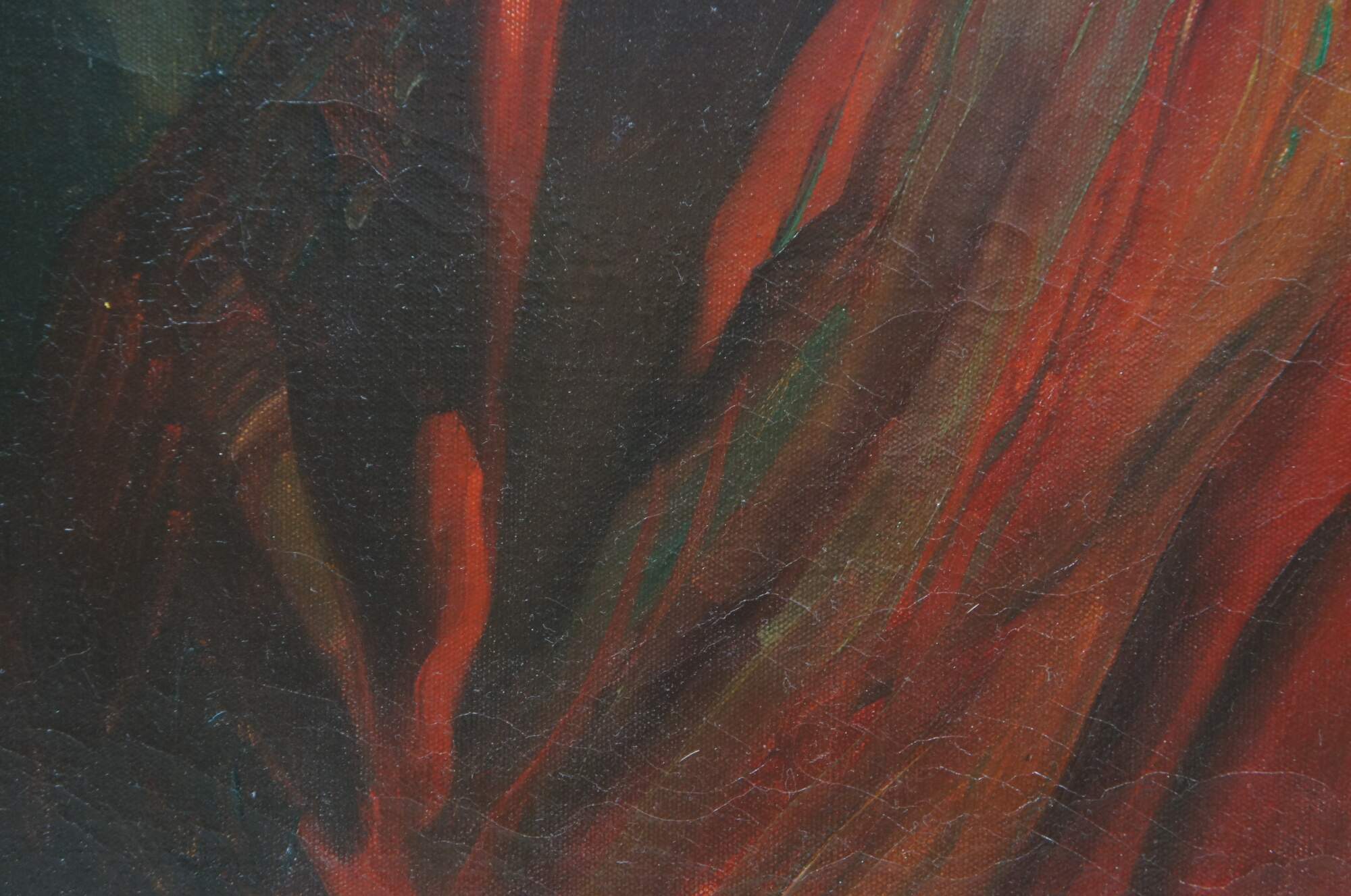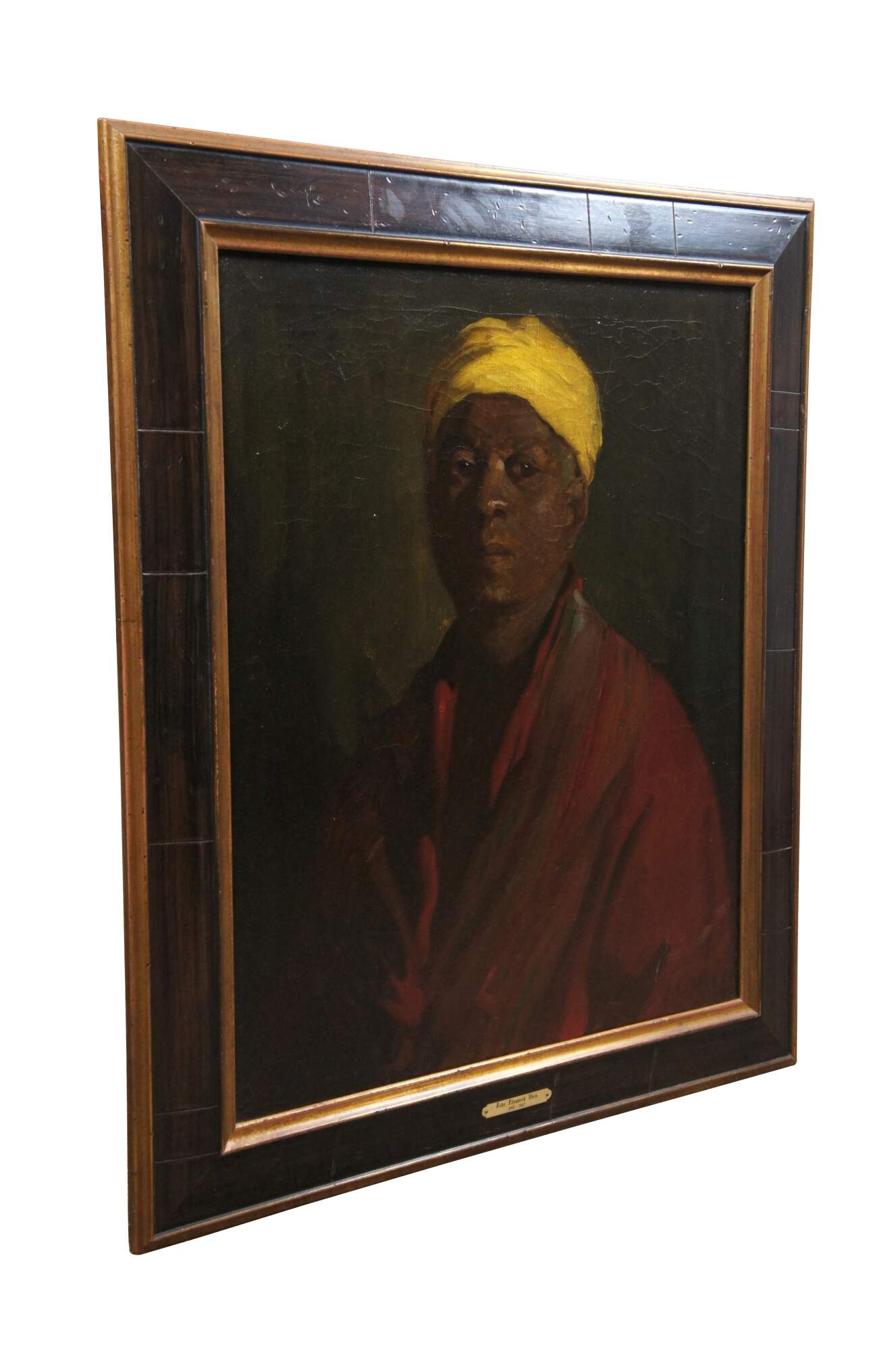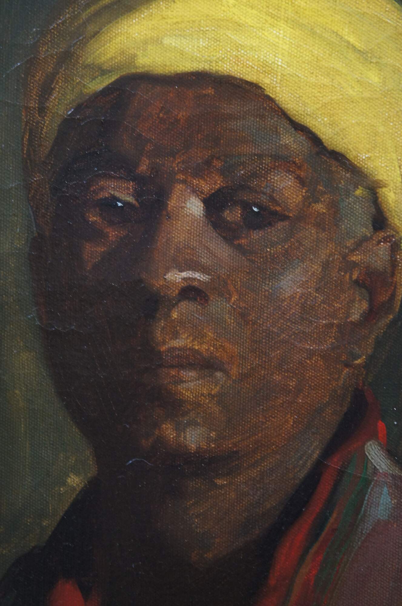 Mid 20th century oil on canvas portrait painting by John Ellsworth Weis, depicting a man of Turk / Turkish / .African descent dressed in a red robe and yellow cap / turban. Signed in lower right corner. Wooden frame with beveled, golden inner and outer edges. Brass plaque with artist's name at lower edge of frame.
