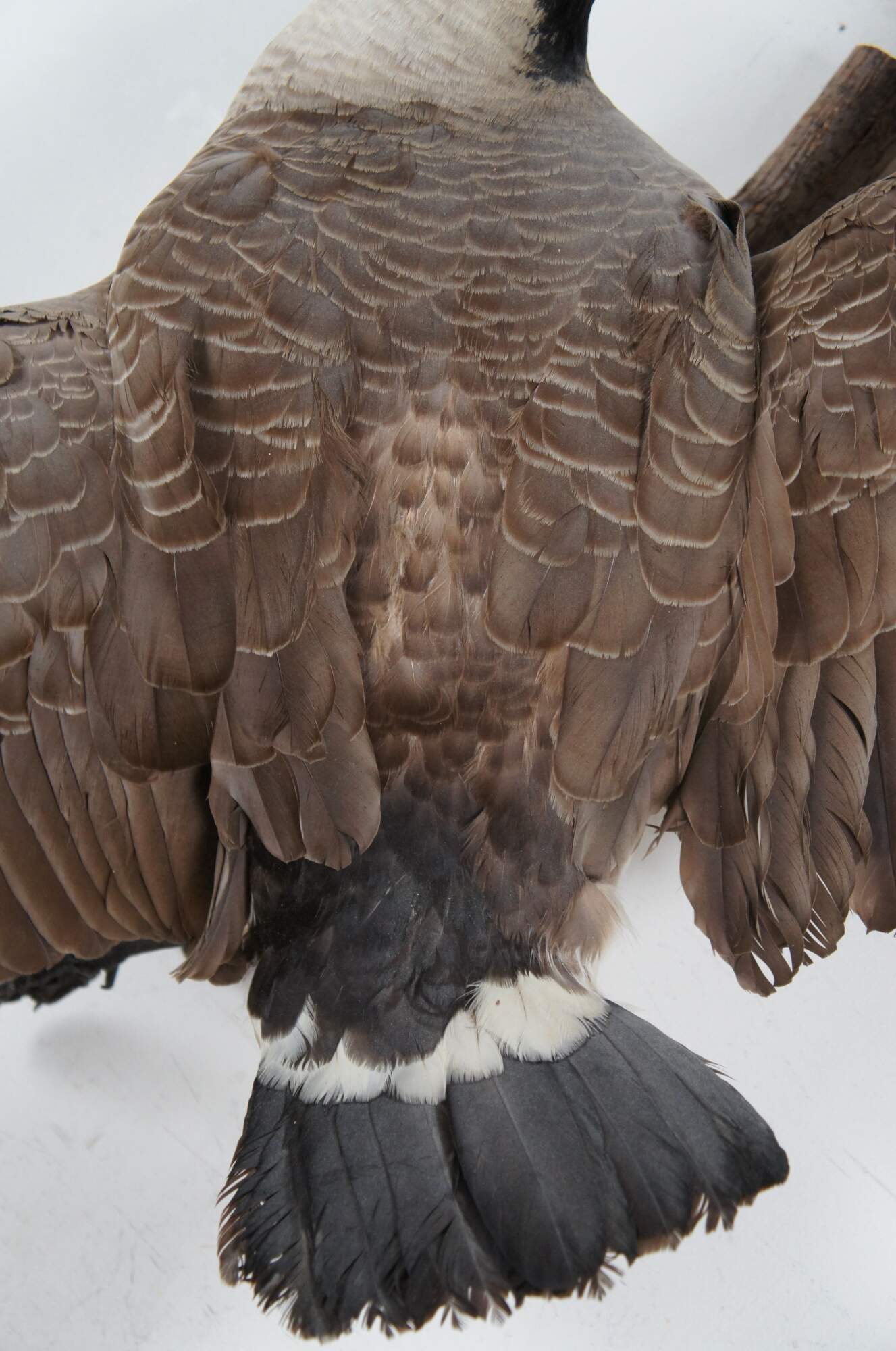Vintage taxidermied Canada Goose trophy, mounted with wings outstretched in flight on a natural wood branch for wall hanging.