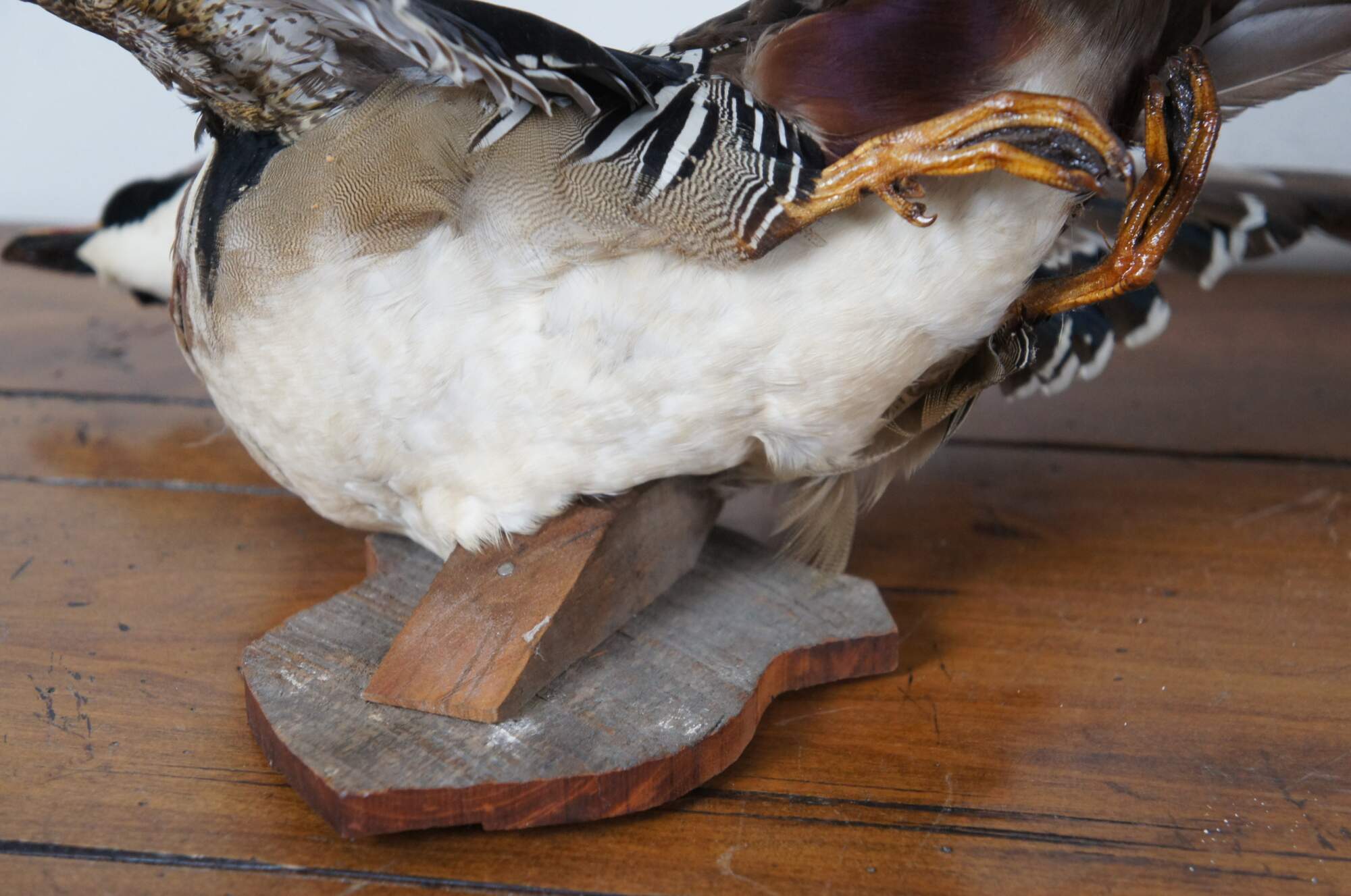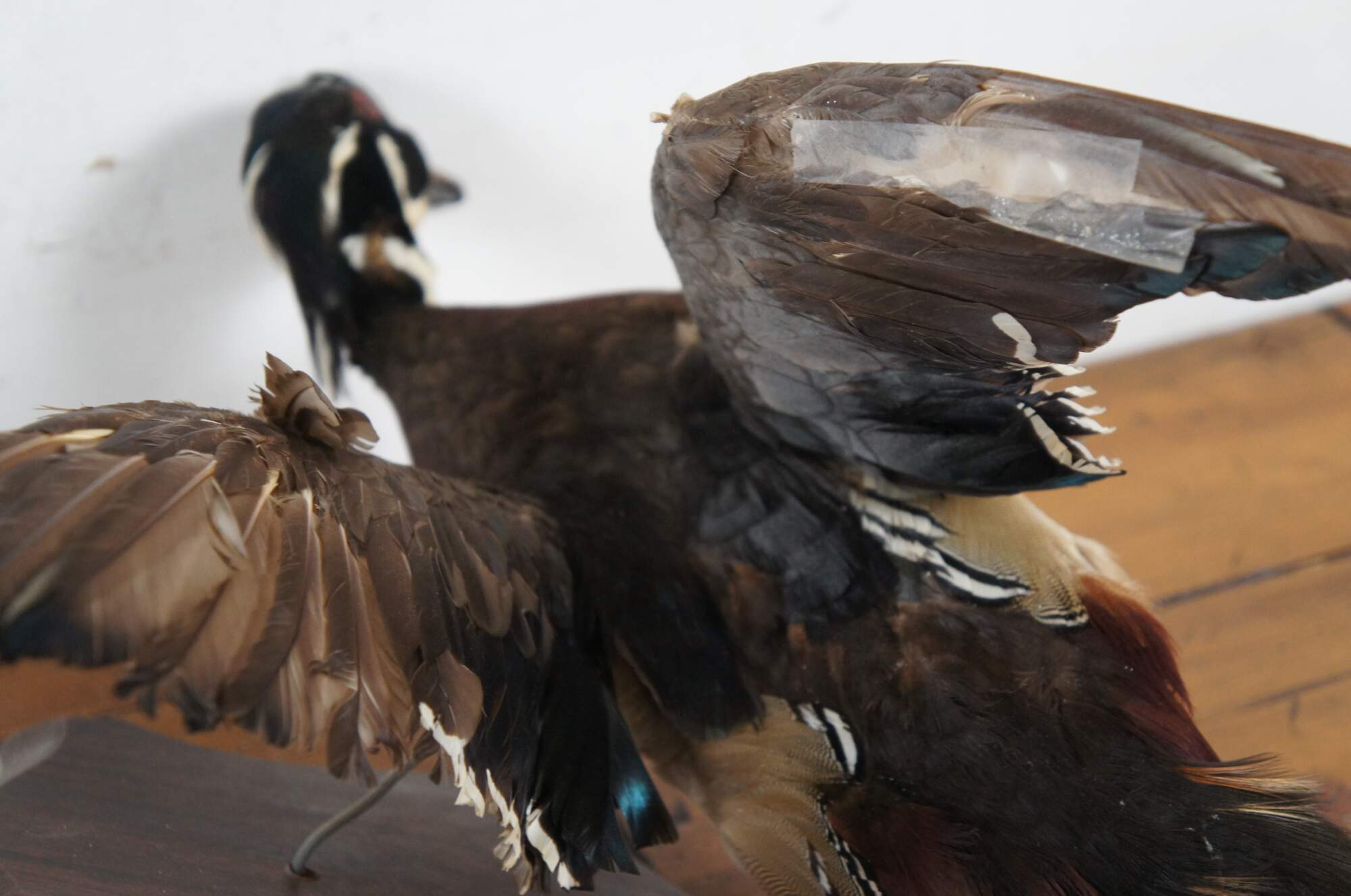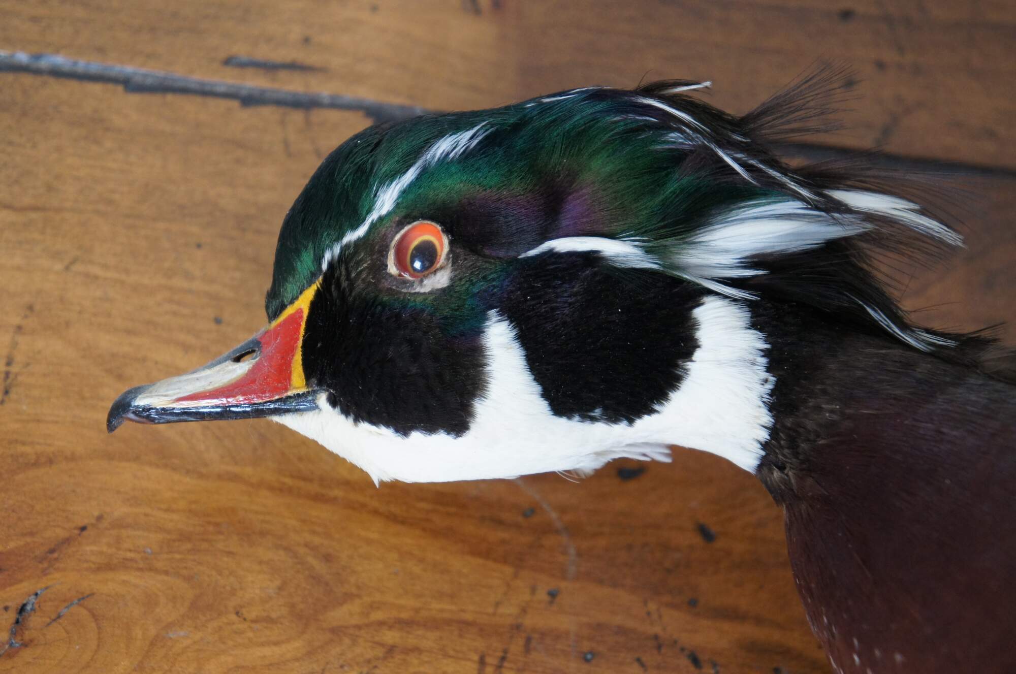 Pair of vintage taxidermied wood ducks (aka Carolina Duck / Aix sponsa) mounted with wings extended in flight on shield shaped wall hanging plaques. Back of one plaque marked with card from Hunter's Haven Taxidermy Studio.