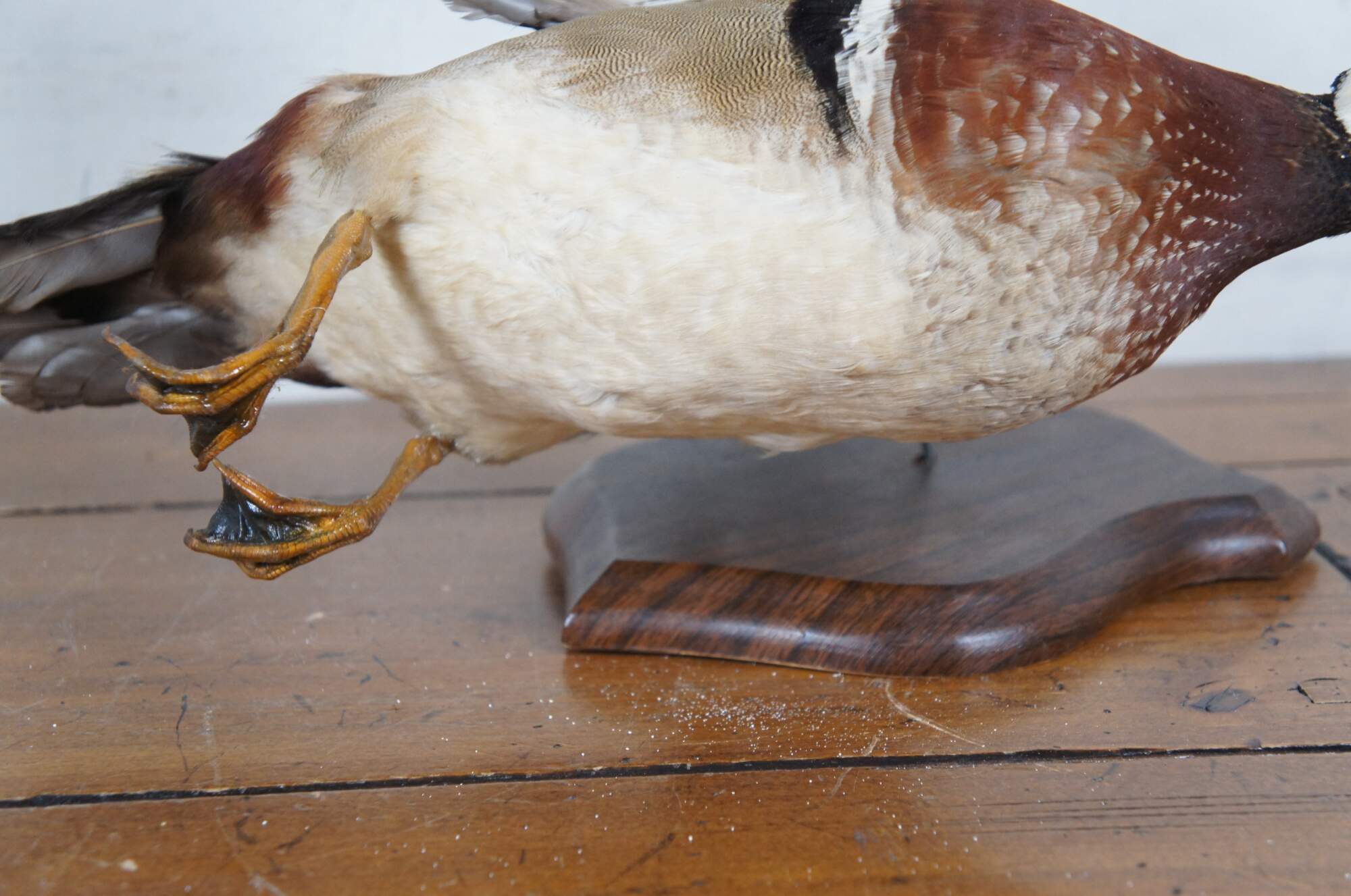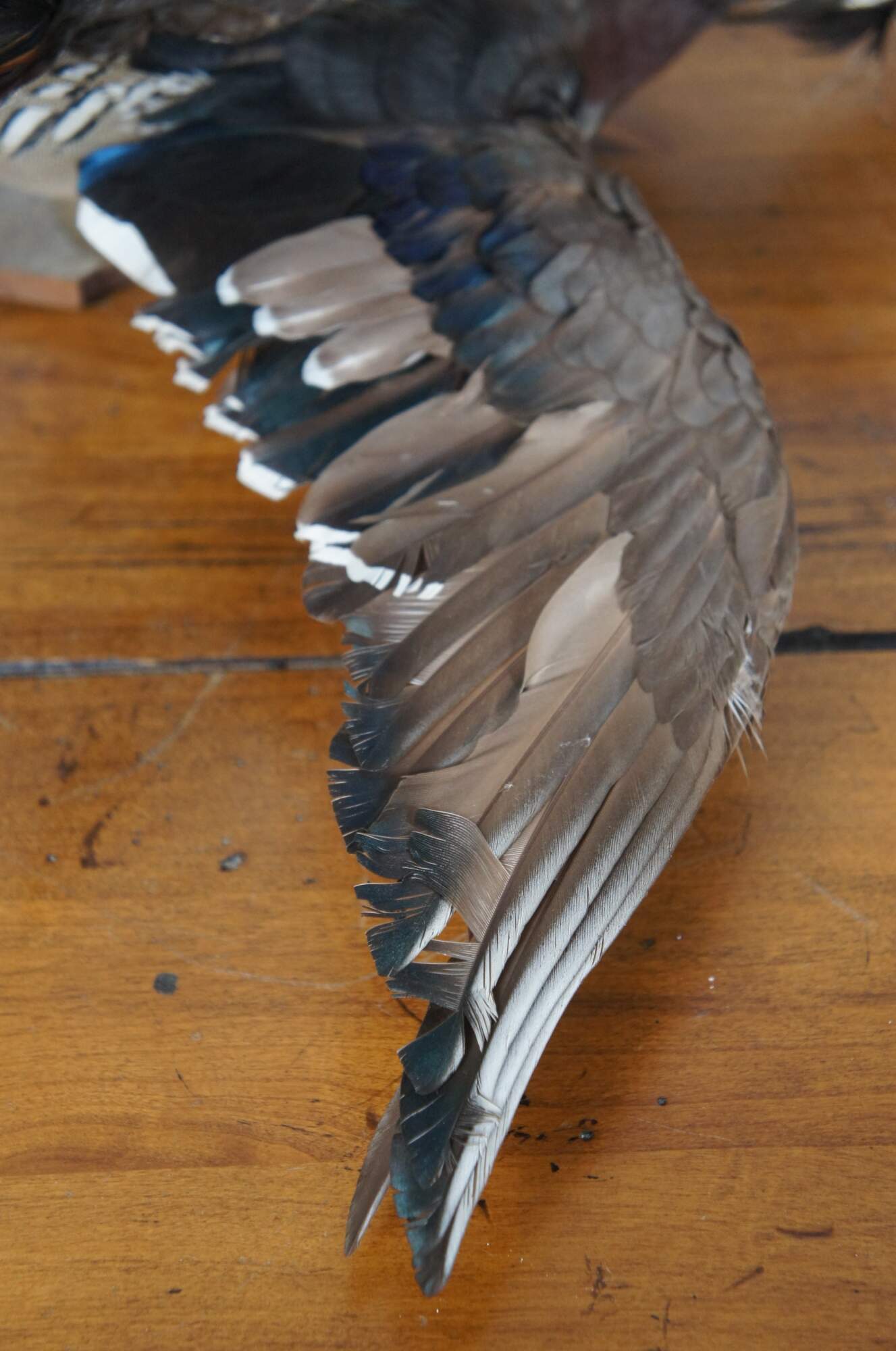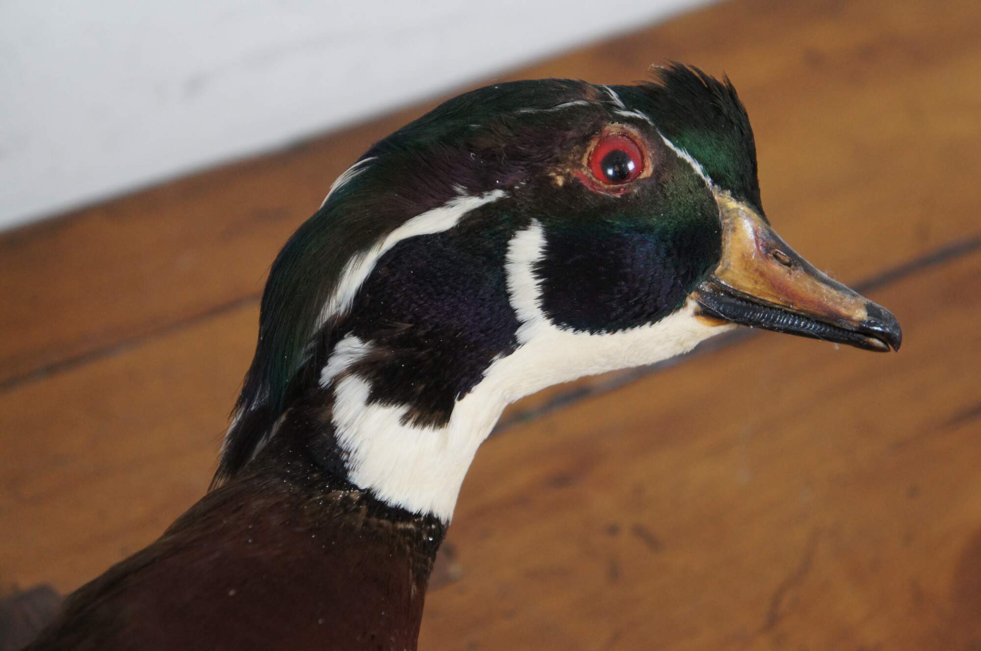 Pair of vintage taxidermied wood ducks (aka Carolina Duck / Aix sponsa) mounted with wings extended in flight on shield shaped wall hanging plaques. Back of one plaque marked with card from Hunter's Haven Taxidermy Studio.