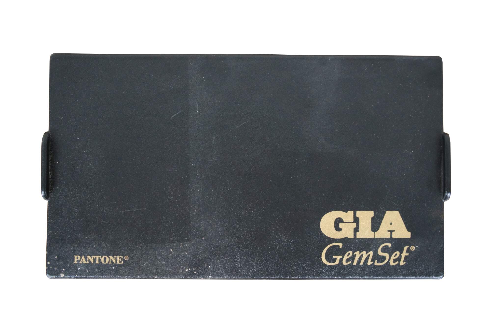 Rare discontinued, late 20th century, Pantone / GIA Hue Wheel GemSet. Set of 50 gem shaped paddles for use in color grading of natural gemstones by jewelers and gemologists. White fabric covered plastic base with black hard plastic cover.