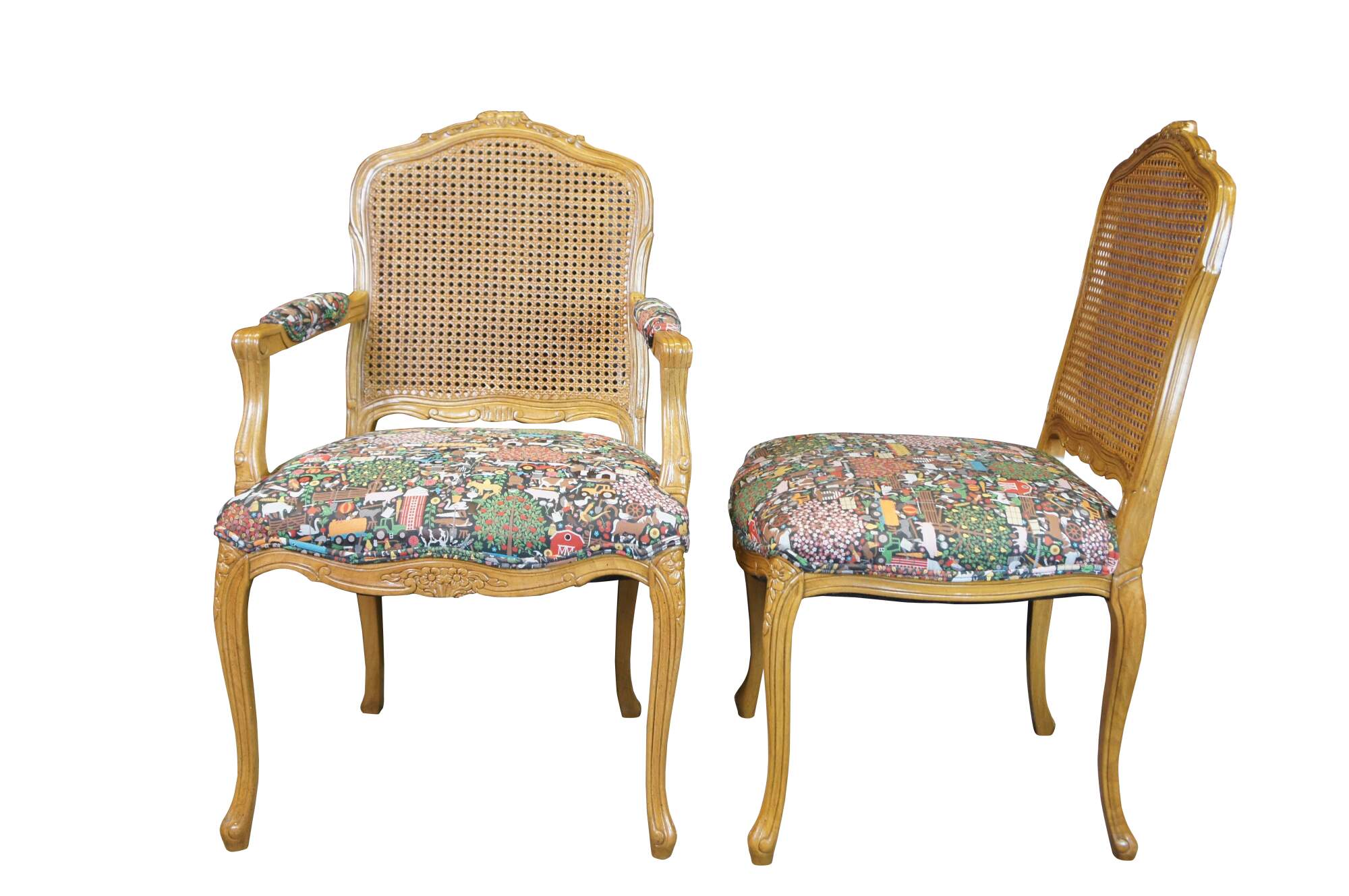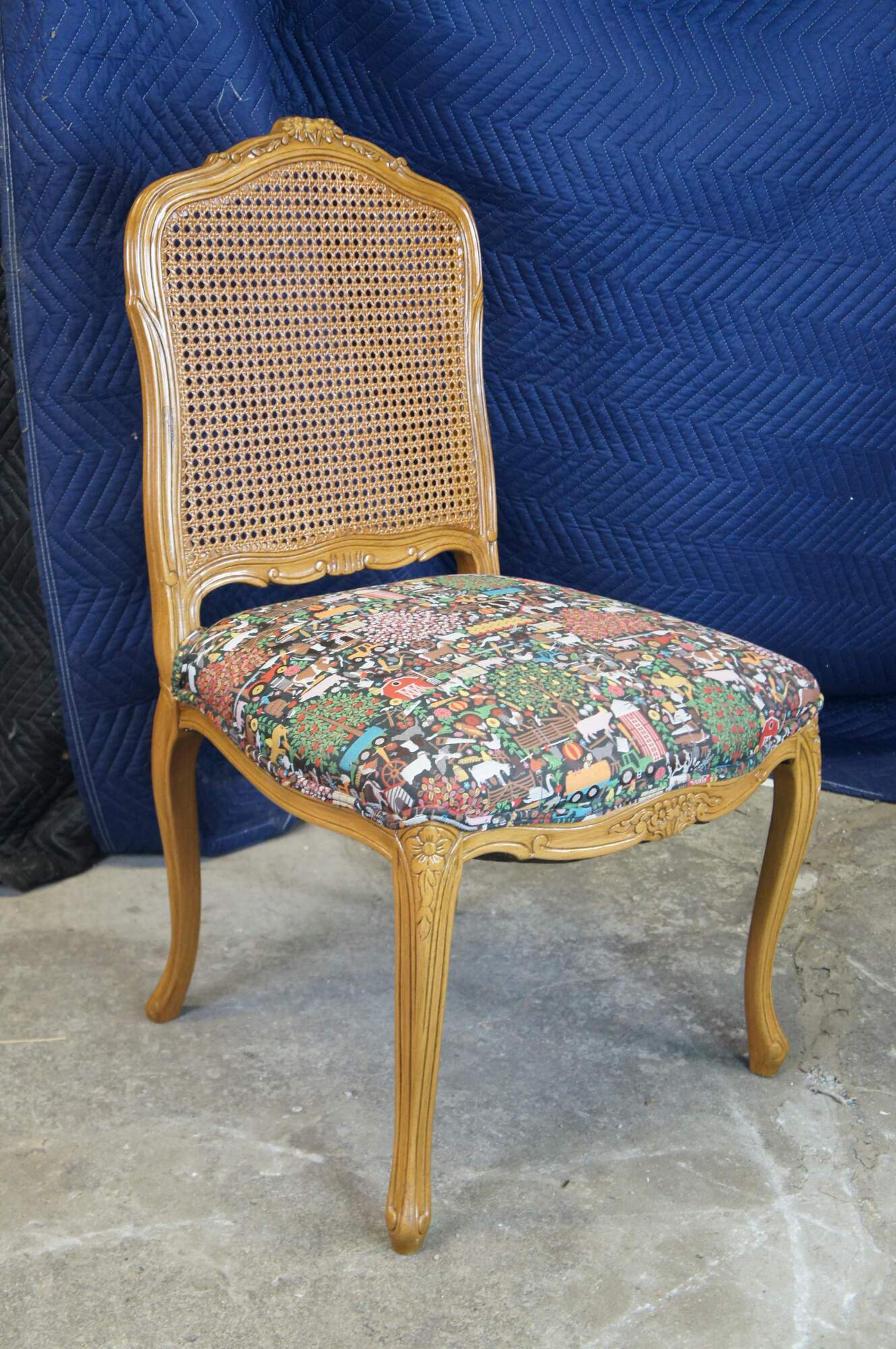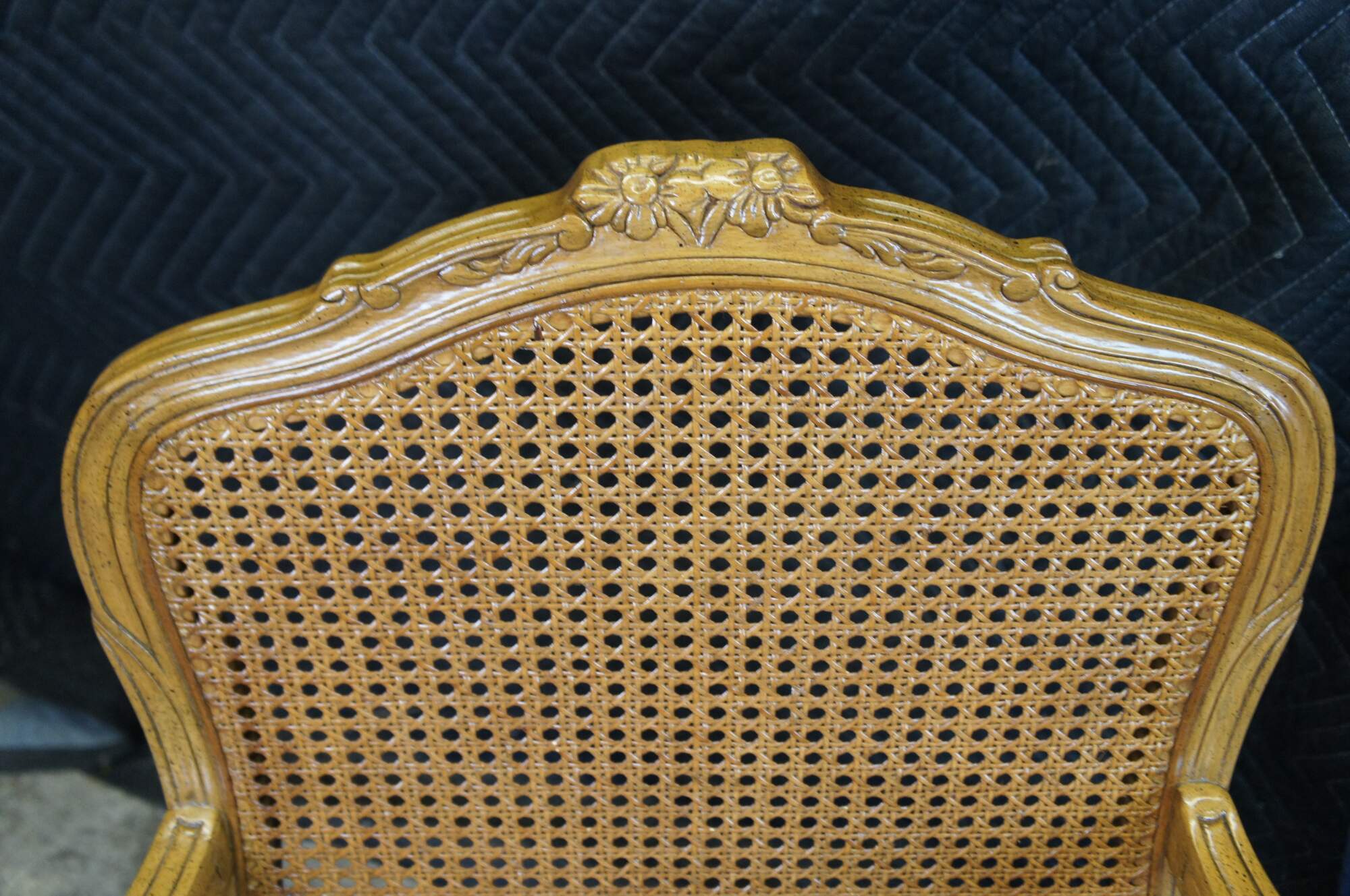 Eight vintage French Louis XV style dining chairs. Made of walnut featuring caned backs with carved floral accents, fauteuil arms and whimsical country farmhouse scenes.