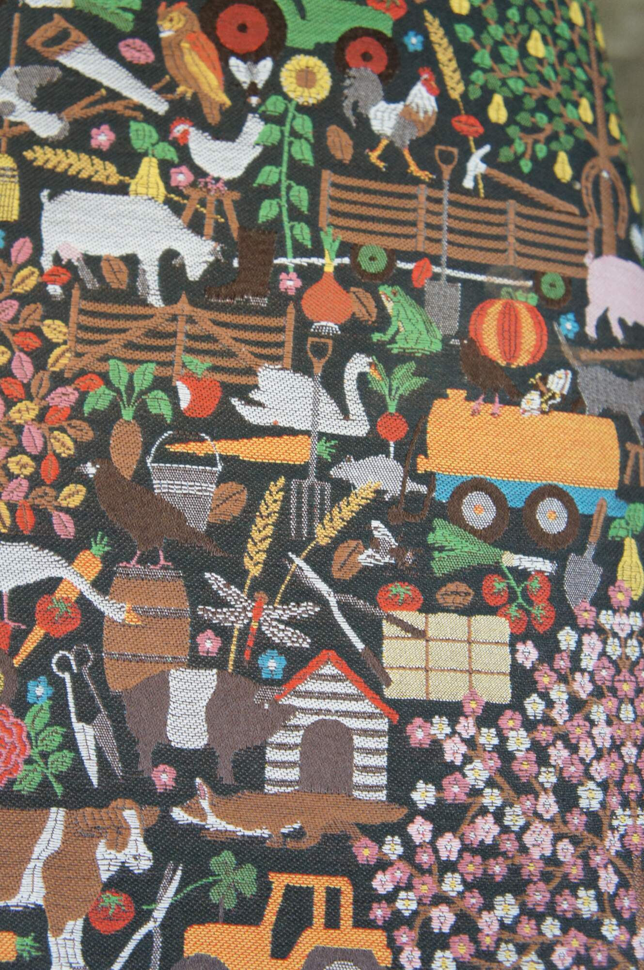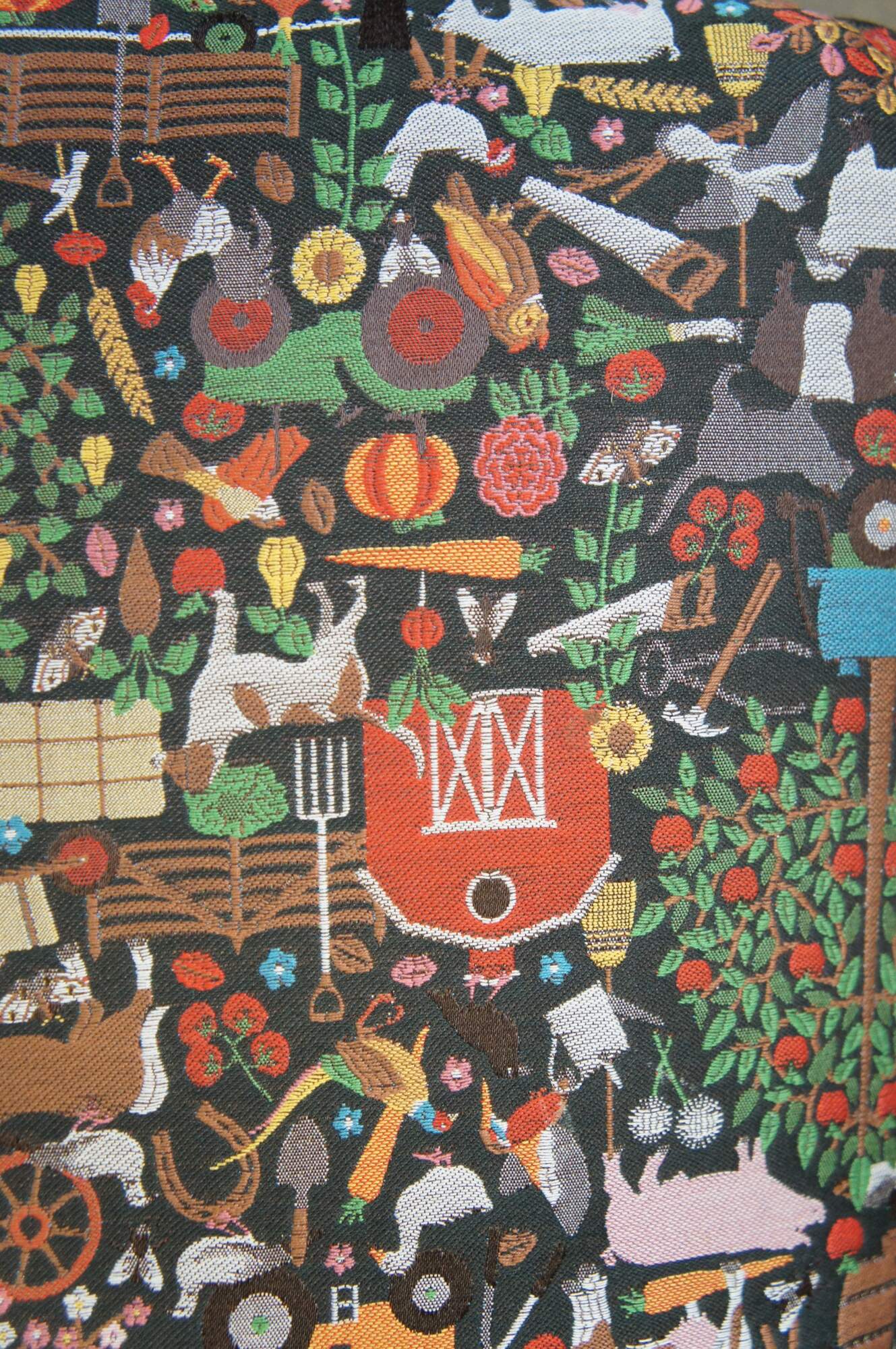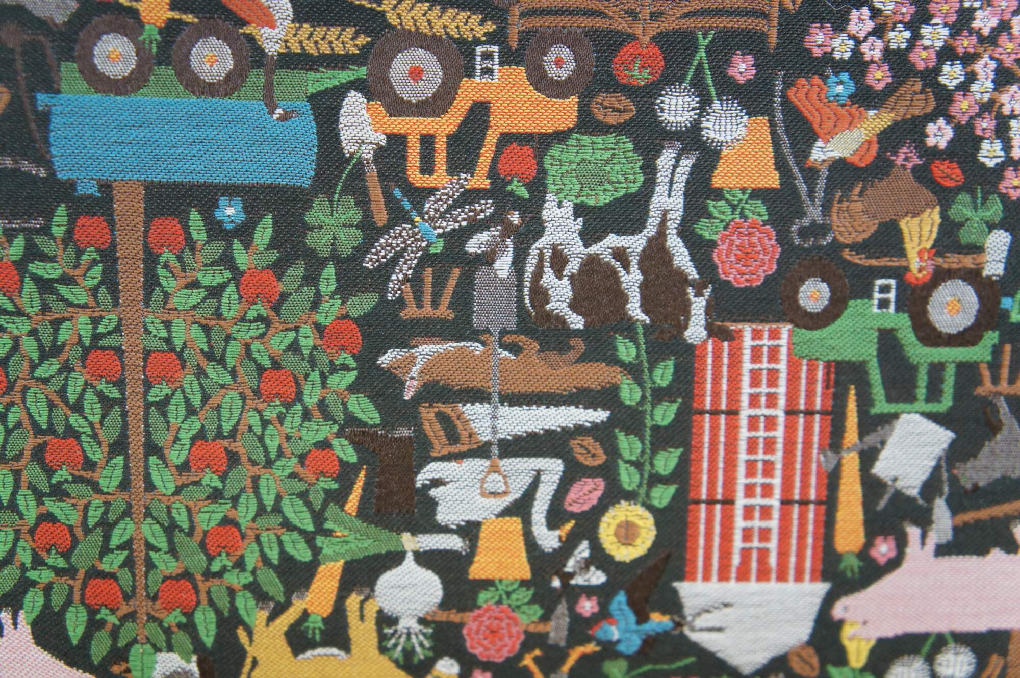 Jacquard upholstery pattern called Bavaria #466162 by Studio Job (sold exclusively by Maharam) features a landscape of farmland scenery with a dense assemblage of livestock animals, crops / trees, transport equipment and other farm implements.