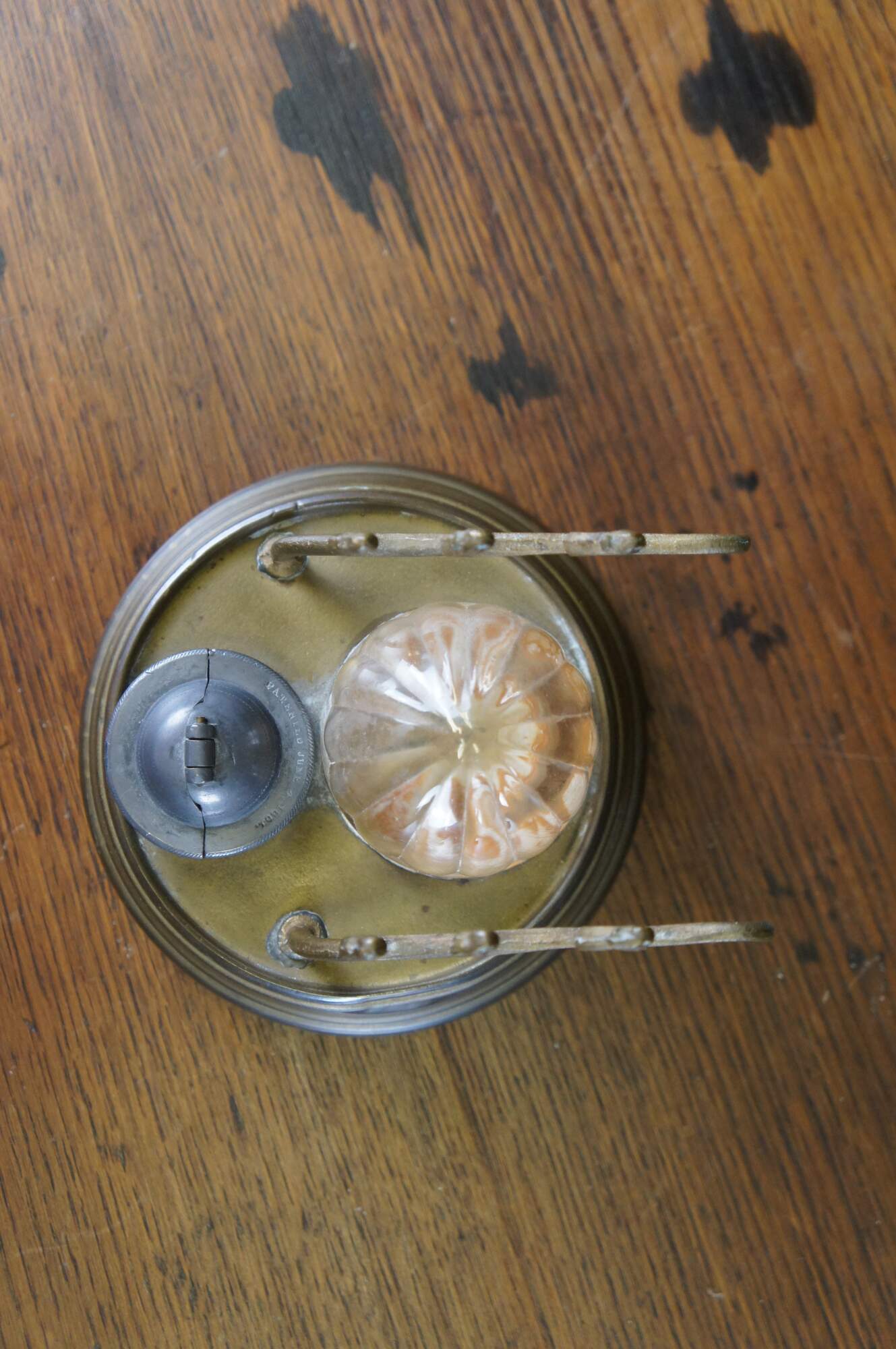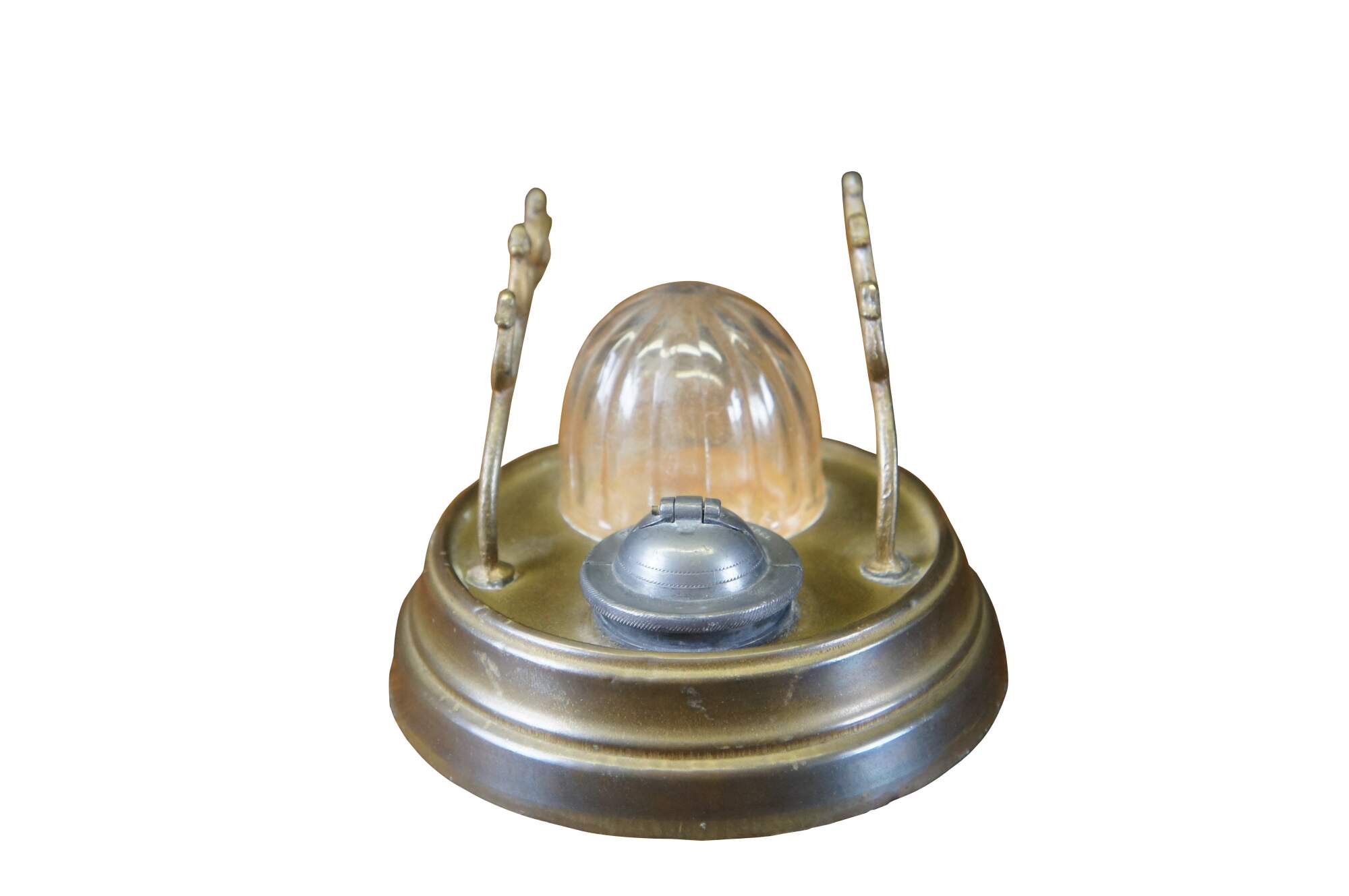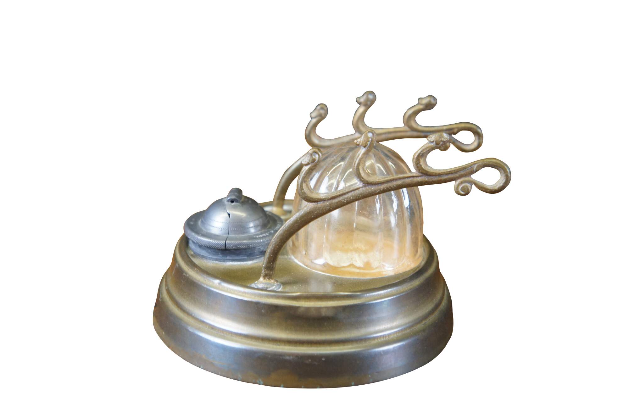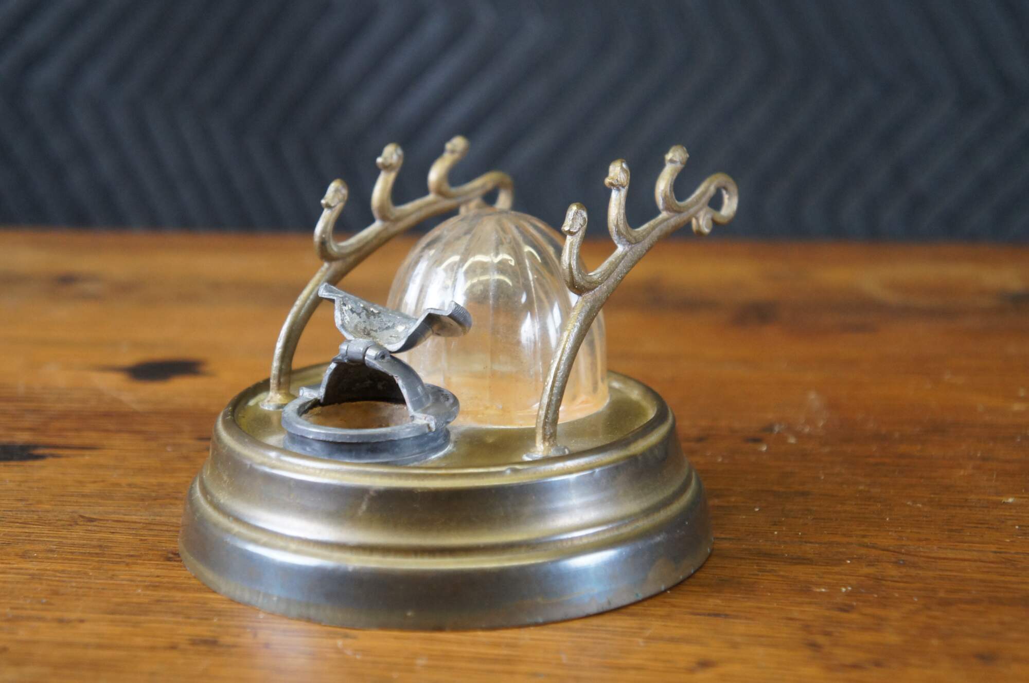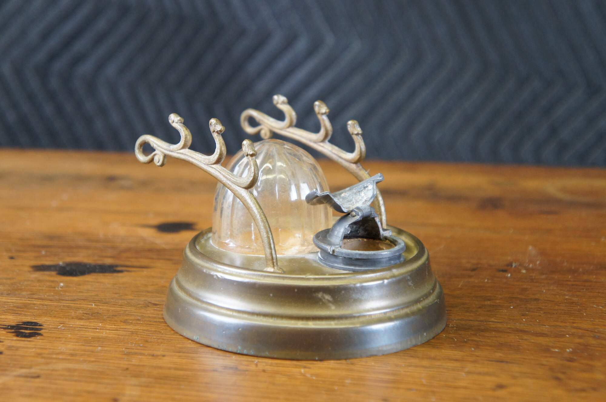 Antique 19th century library writing barometric / barometer pen holder and ink stand, Circa 1860s-1880s. Made of brass featuring pewter inkwell with glass dome reservoir and slots for three quill pens. Originally patented in 1861-67 by Thomas Hudson and manufactured by Cutter Tower Co., Boston, MA.