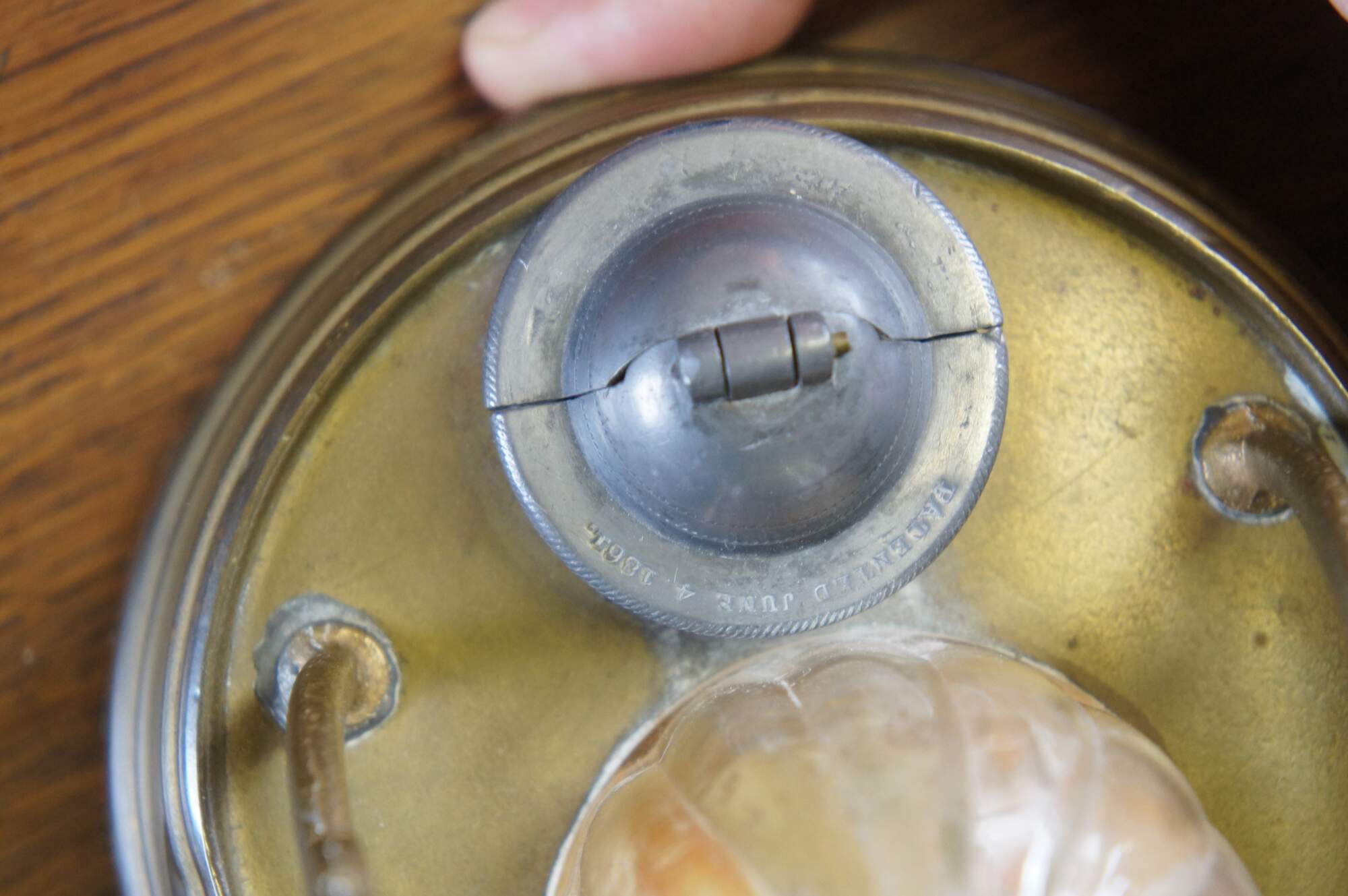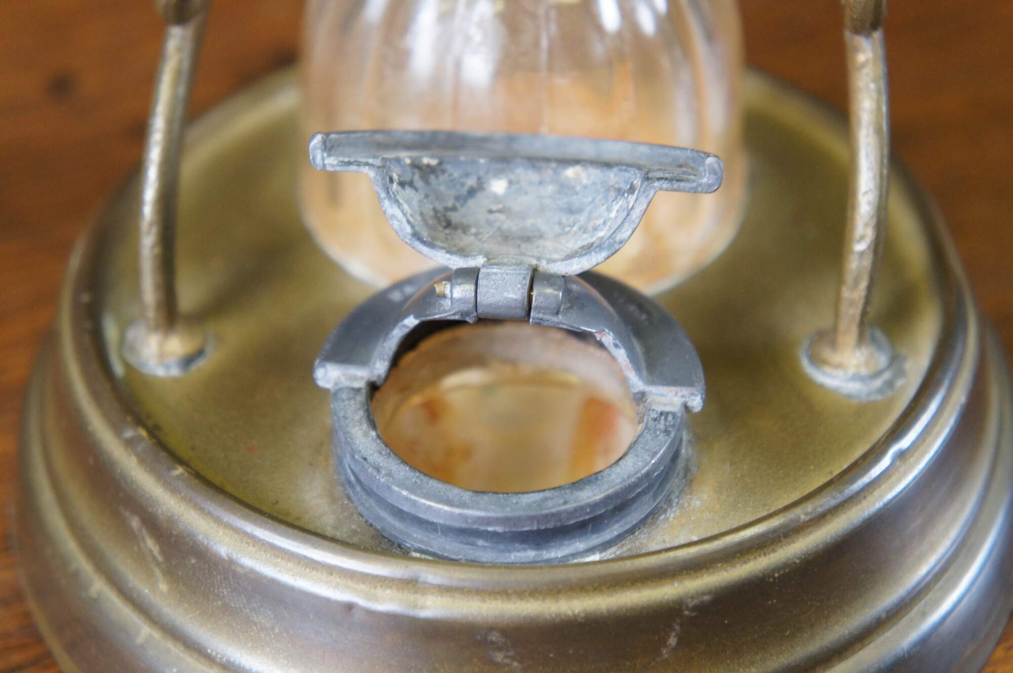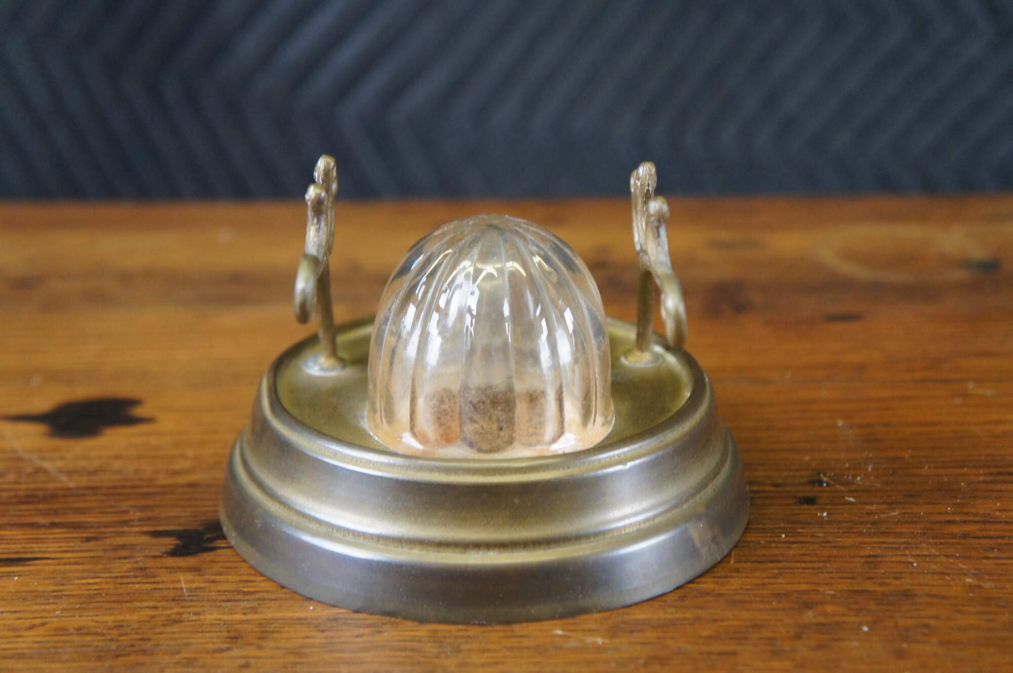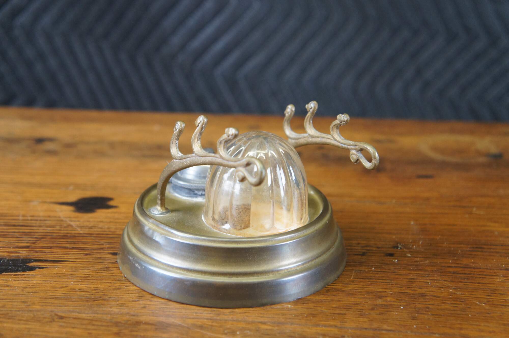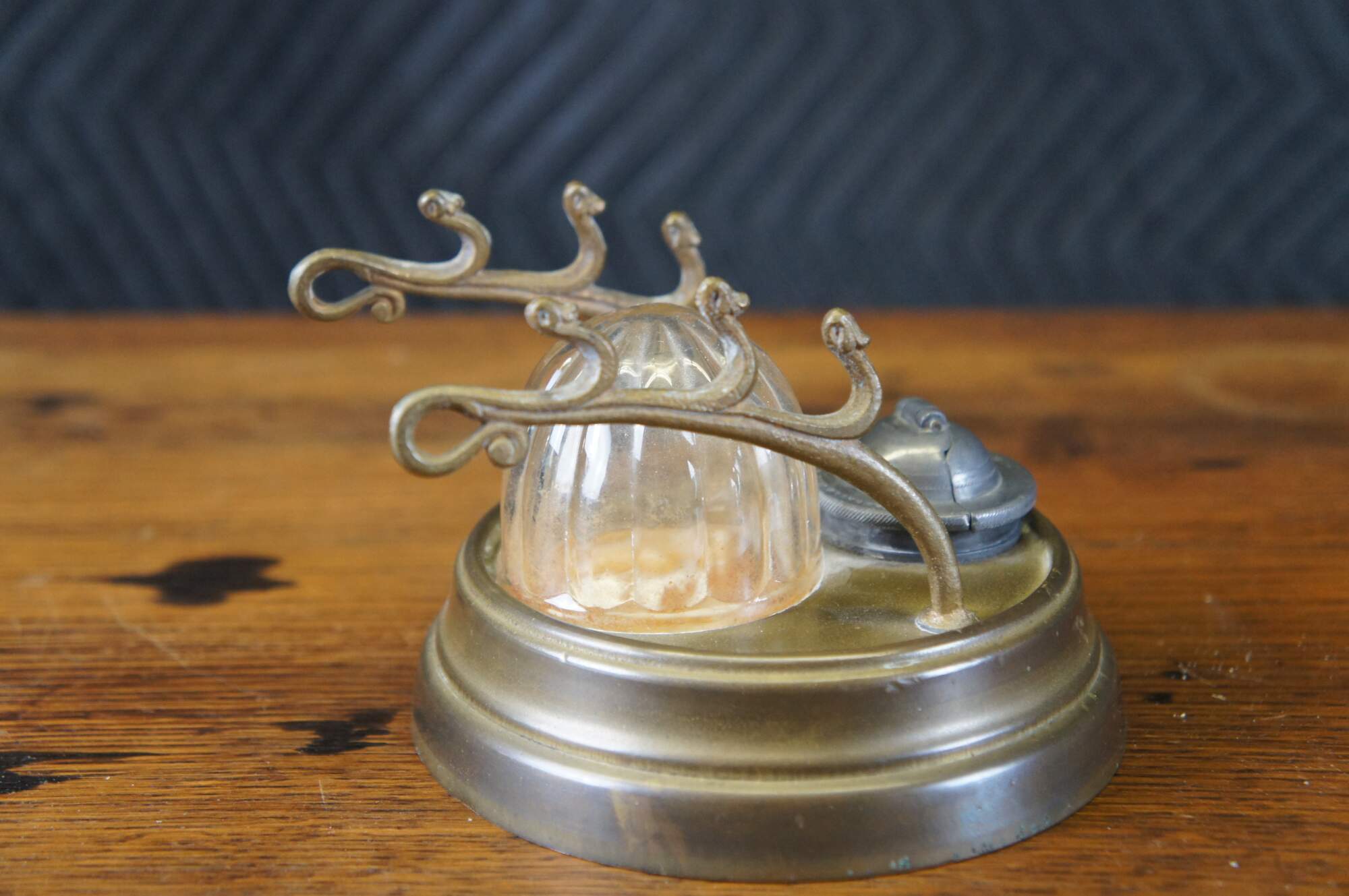 Antique 19th century library writing barometric / barometer pen holder and ink stand, Circa 1860s-1880s. Made of brass featuring pewter inkwell with glass dome reservoir and slots for three quill pens. Originally patented in 1861-67 by Thomas Hudson and manufactured by Cutter Tower Co., Boston, MA.