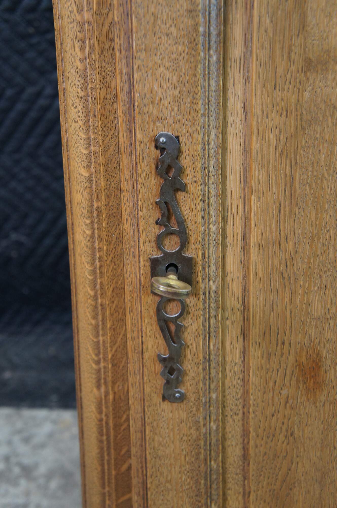 Antique French Provincial country or farmhouse Confiturier / jam console / cabinet / cupboard / buffet. Made of oak featuring Louis XIII styling with scalloped top and floral carved door with long hinged hardware. The cabinets interior was modified by to includes a drawer with multiple shelves and files / cubbies.