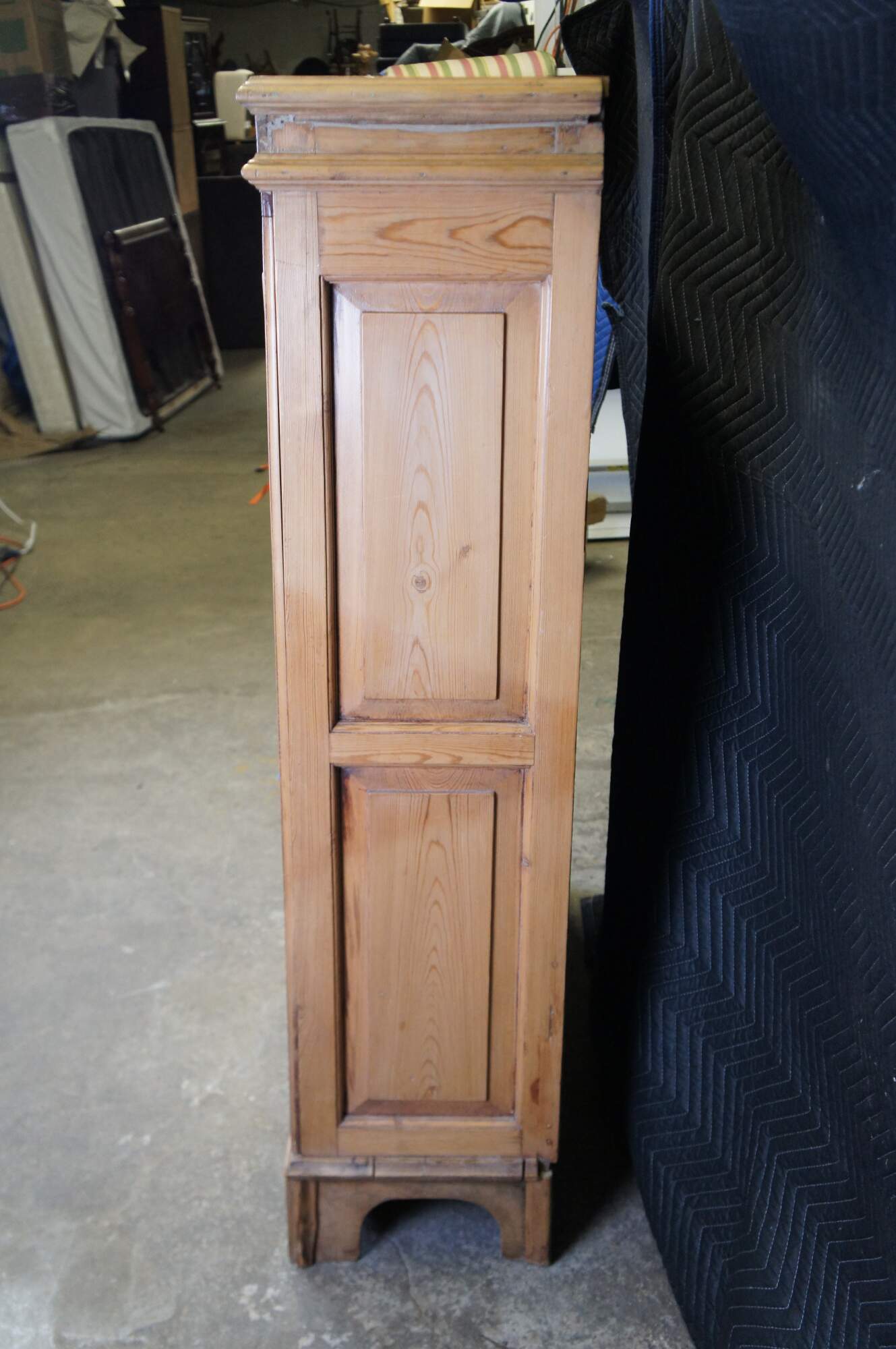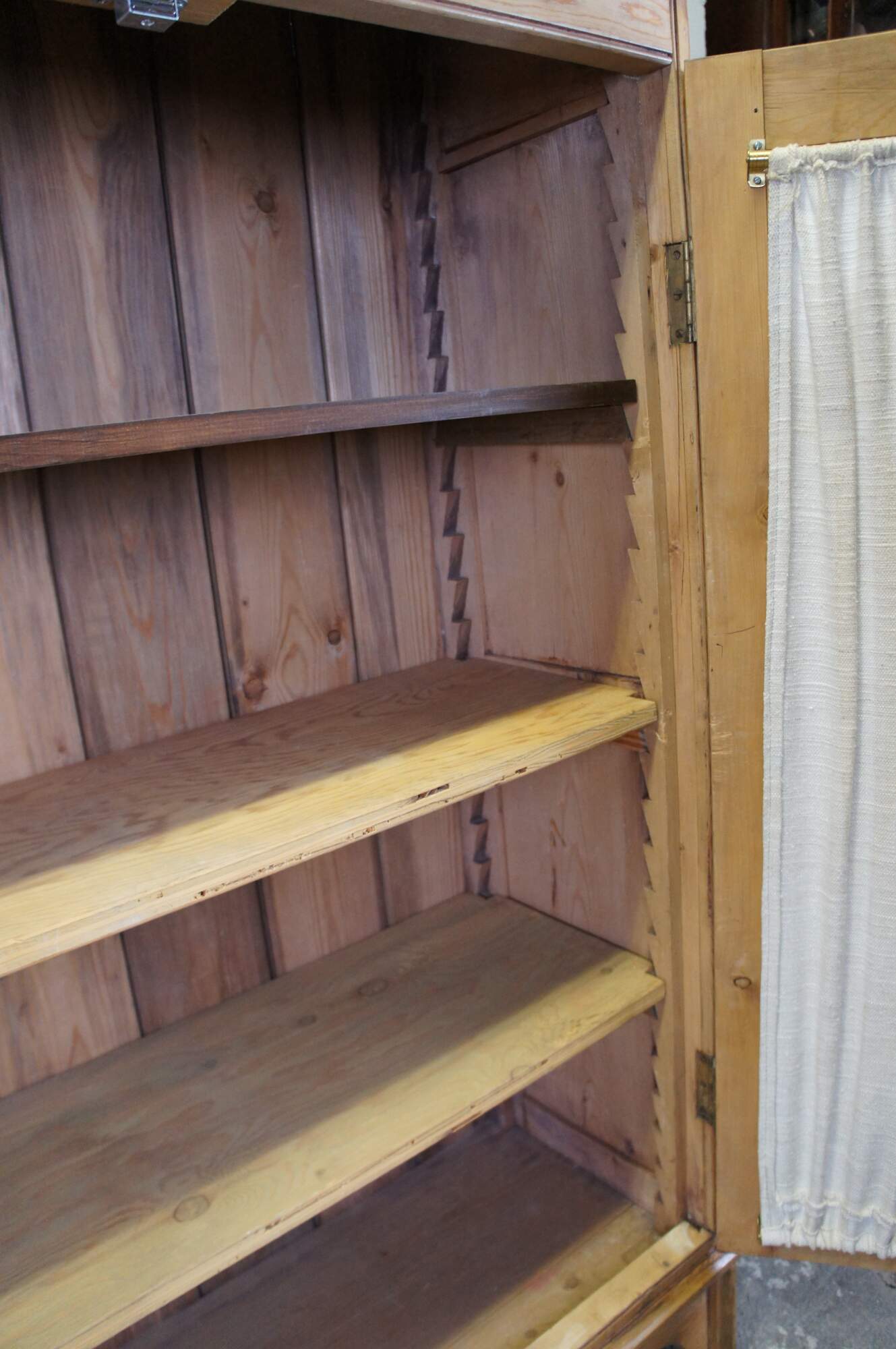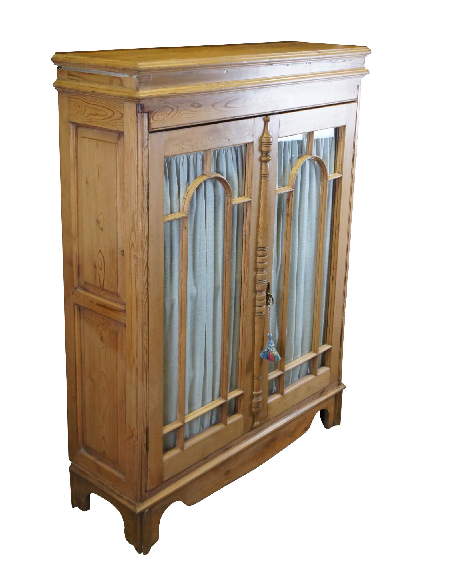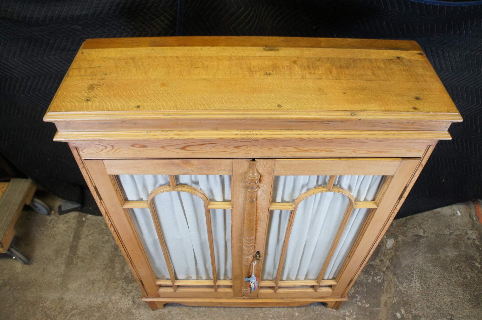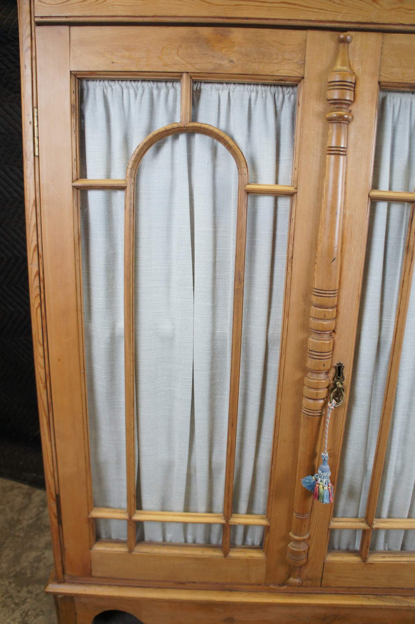 Antique French country / farmhouse cupboard / bookcase / armoire / curio / china cabinet. Made of pine featuring Louis Philippe styling with paneled sides and fretwork linen covered doors that open to multiple storage shelves.