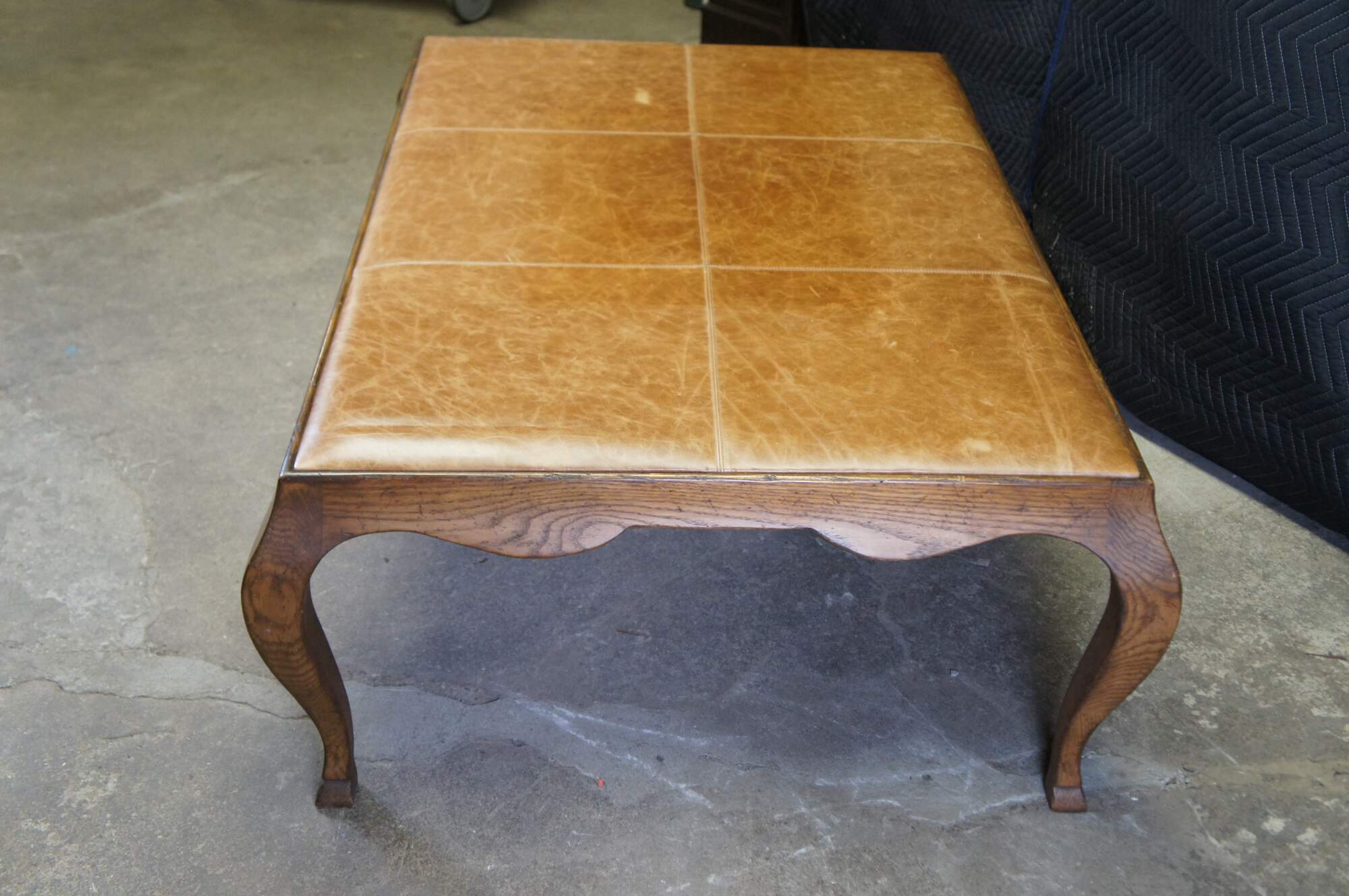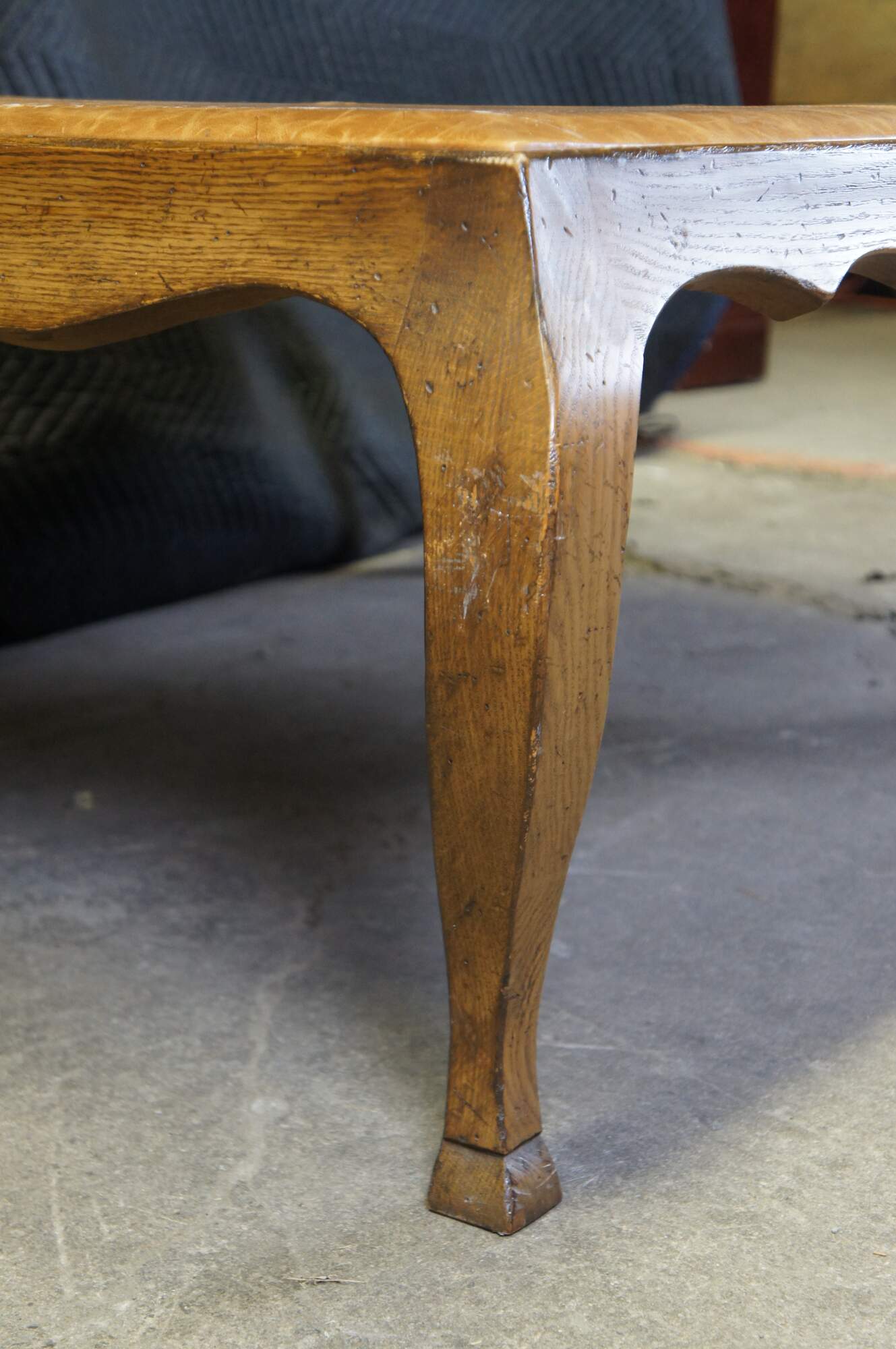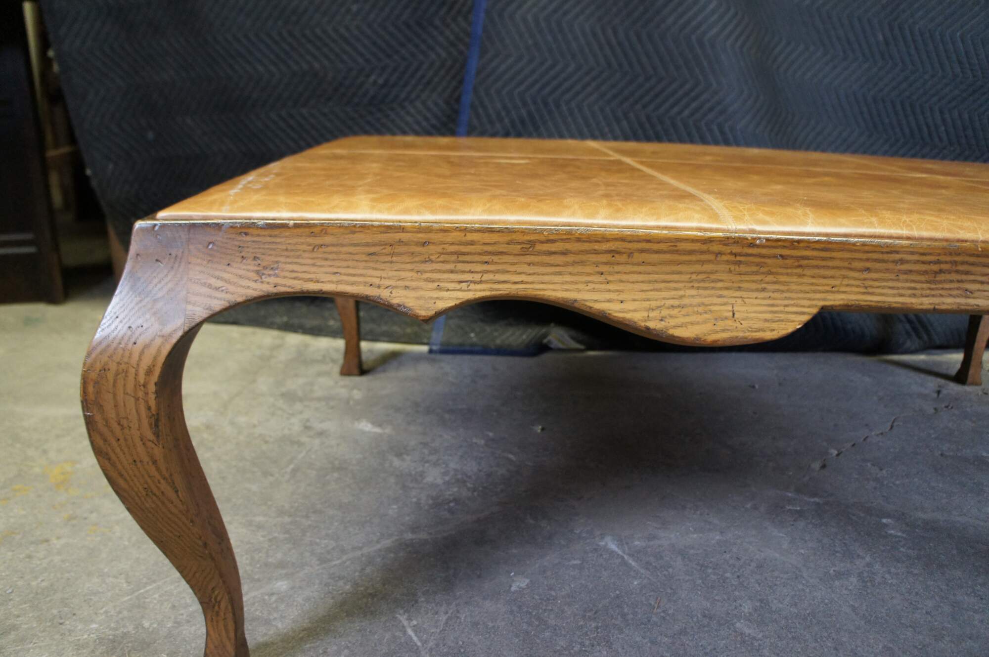 A very large and impressive antique French country / farmhouse coffee / cocktail table or footstool / ottoman. Made of oak featuring rectangular form with leather top, serpentine skirt and cabriole legs.