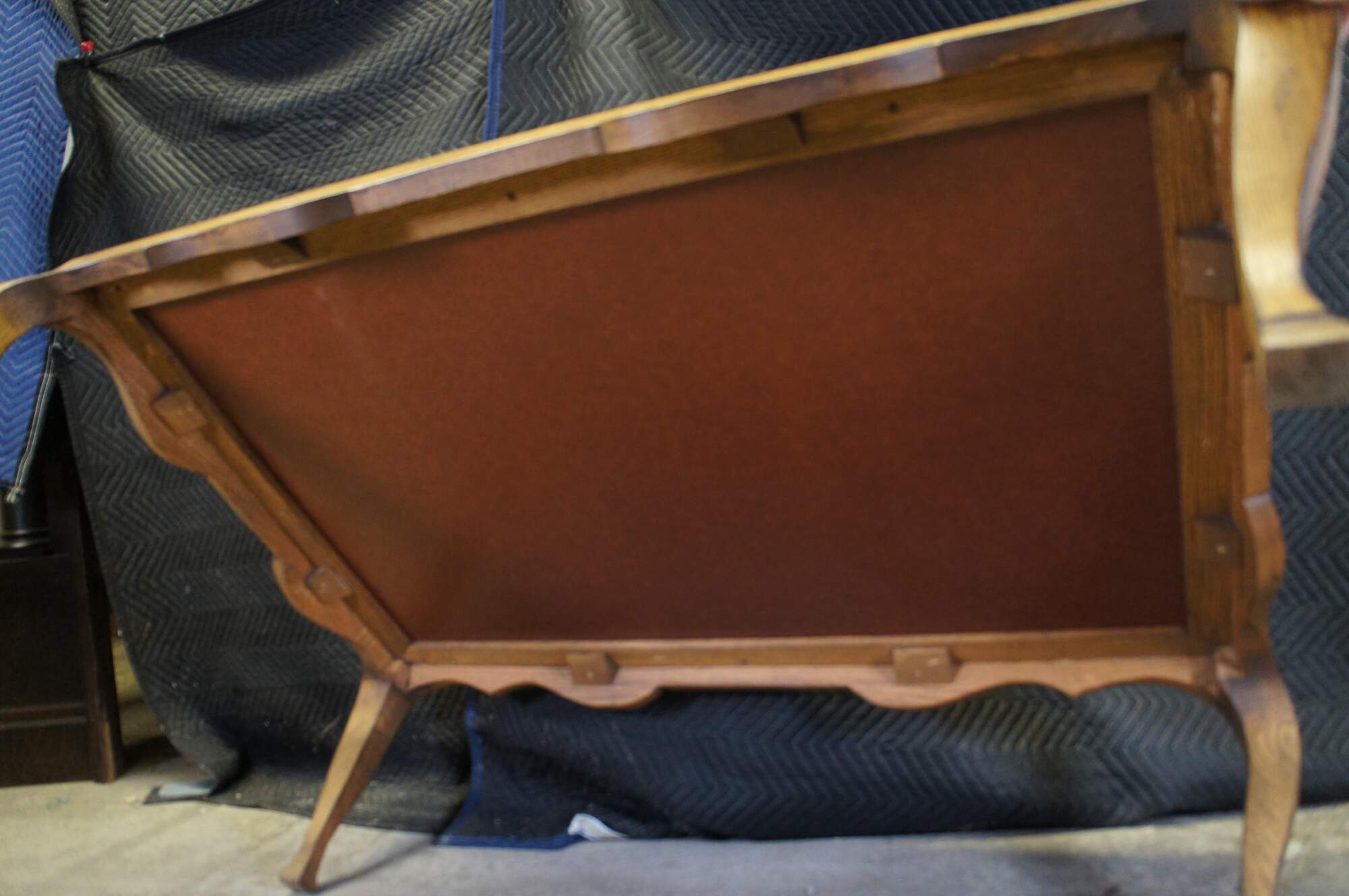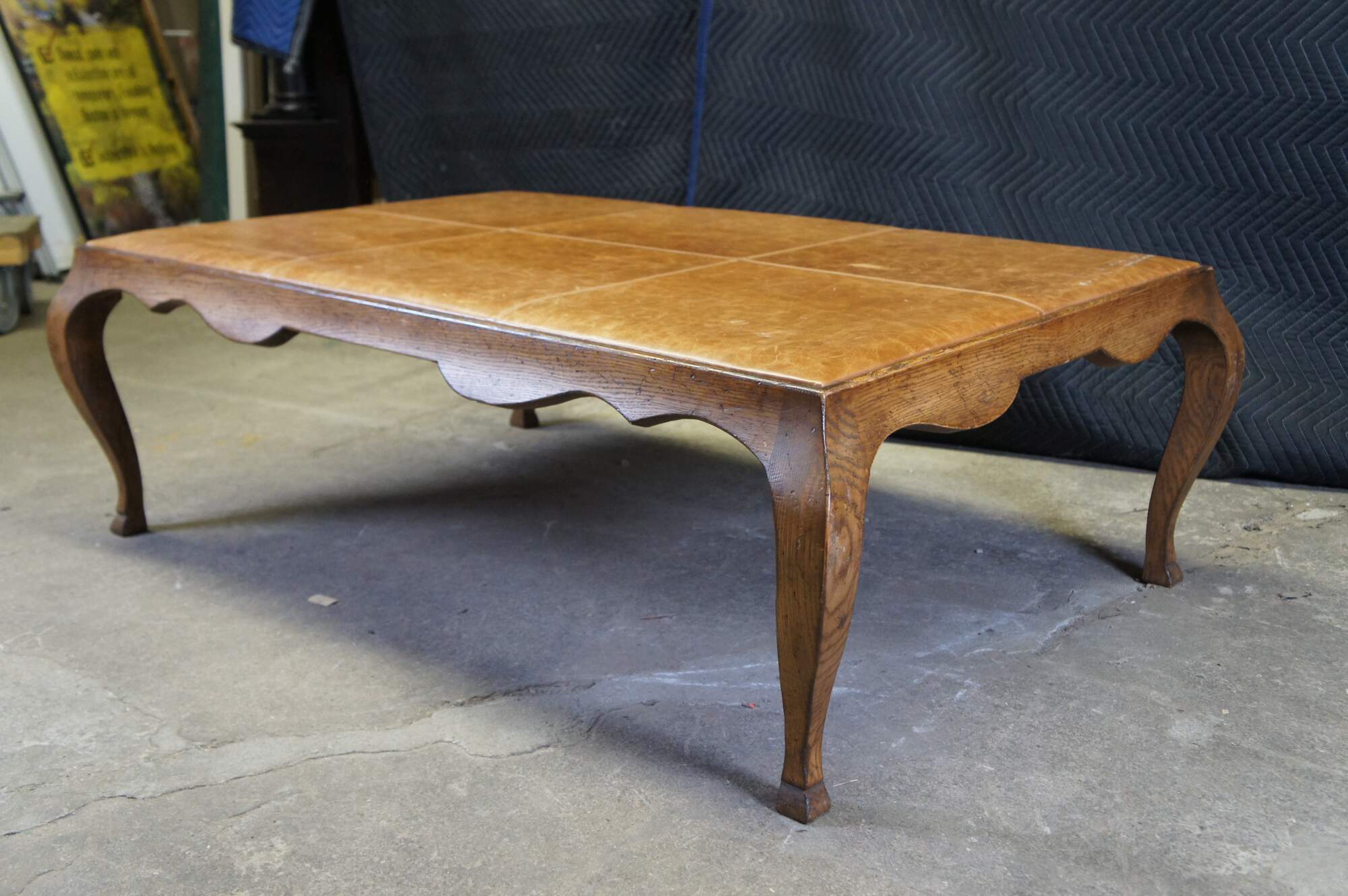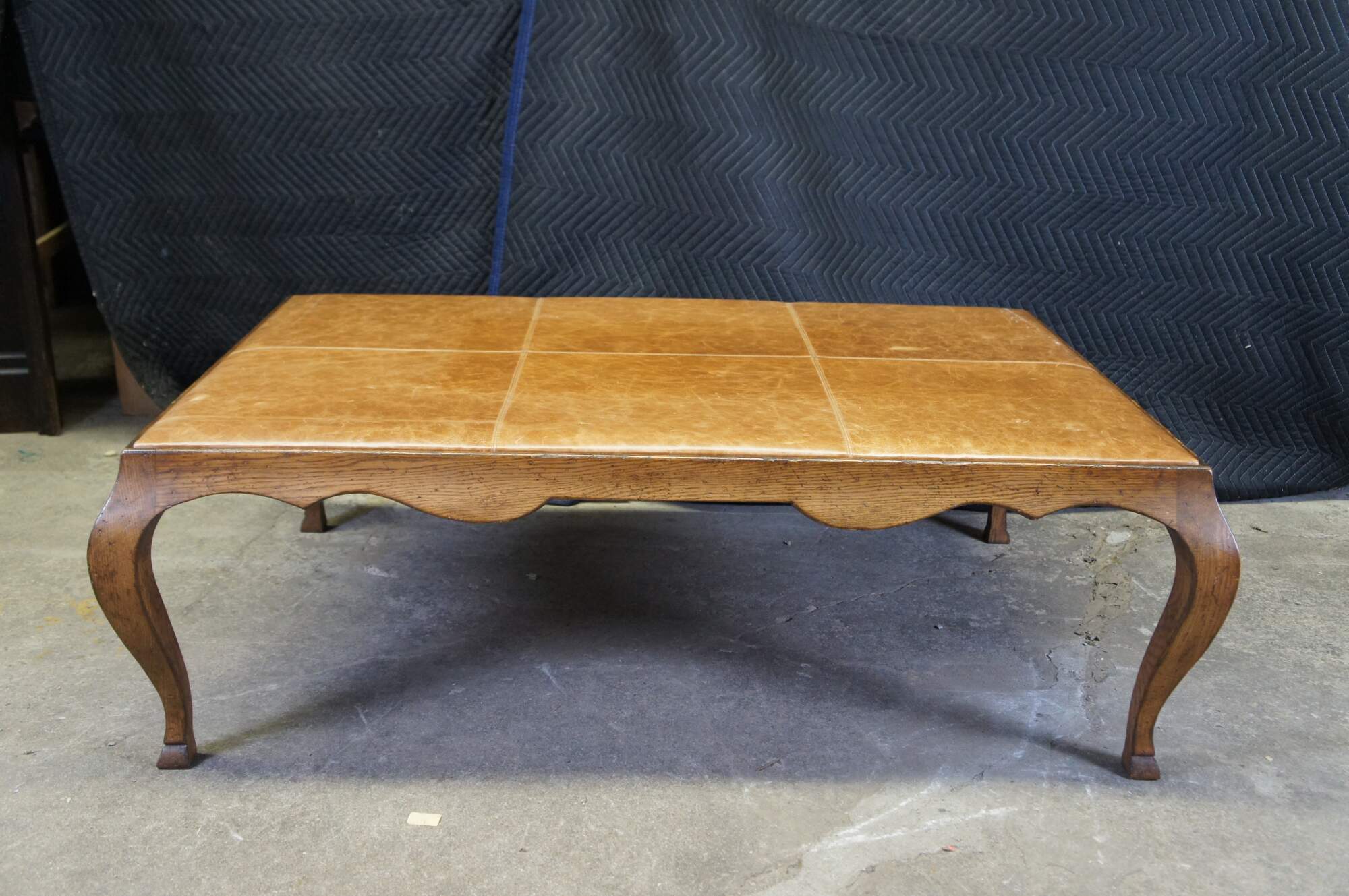 A very large and impressive antique French country / farmhouse coffee / cocktail table or footstool / ottoman. Made of oak featuring rectangular form with leather top, serpentine skirt and cabriole legs.