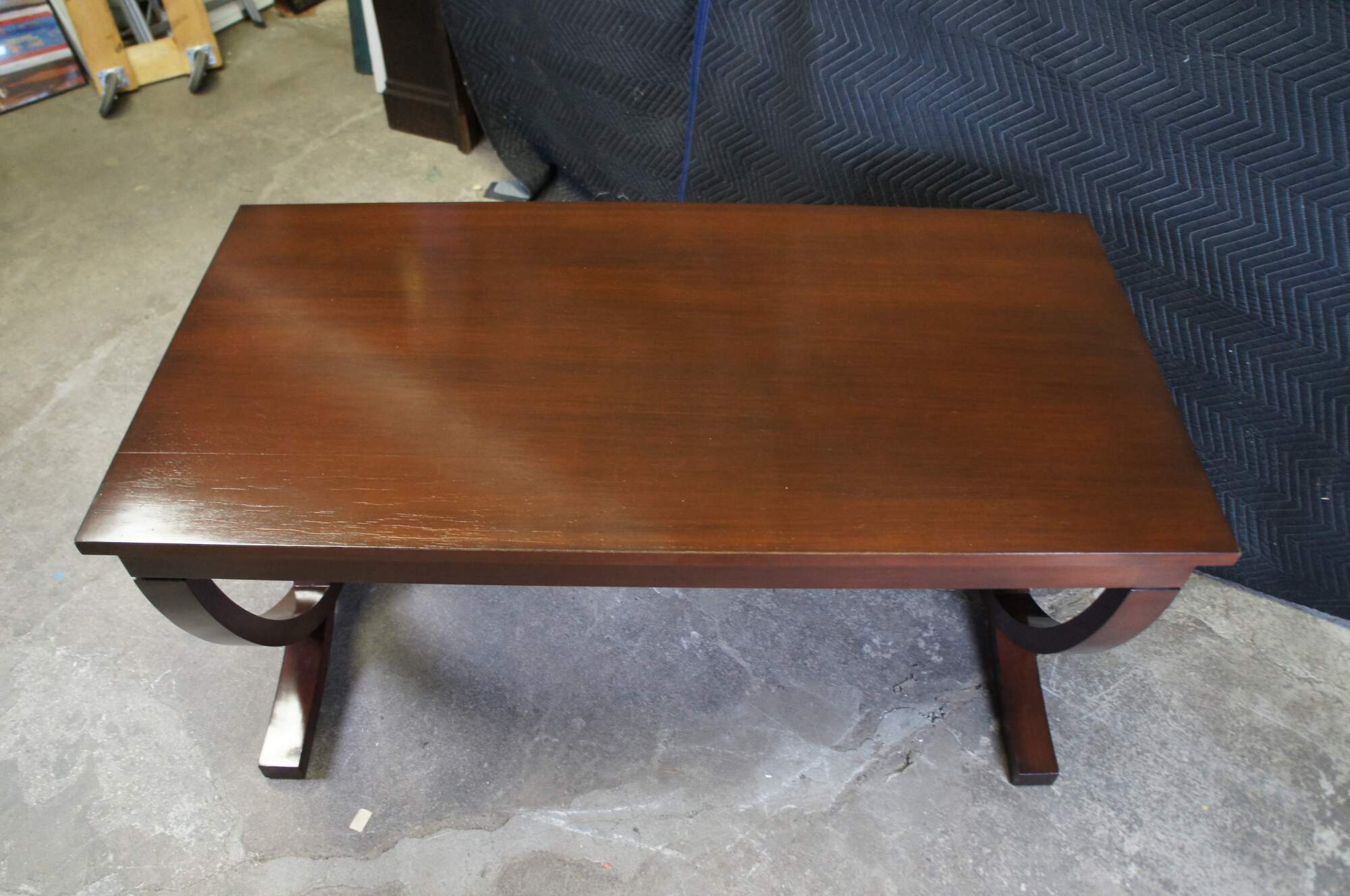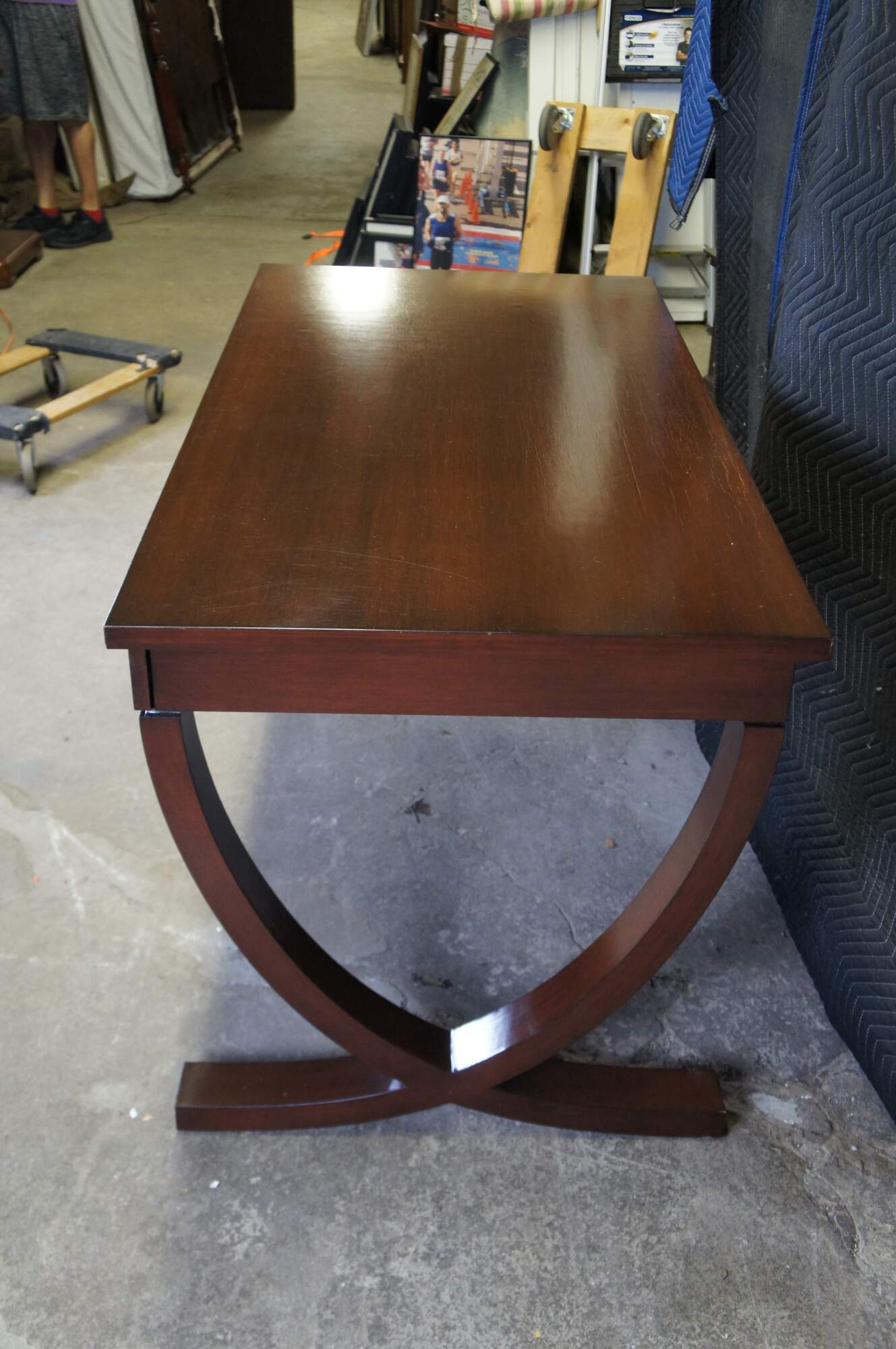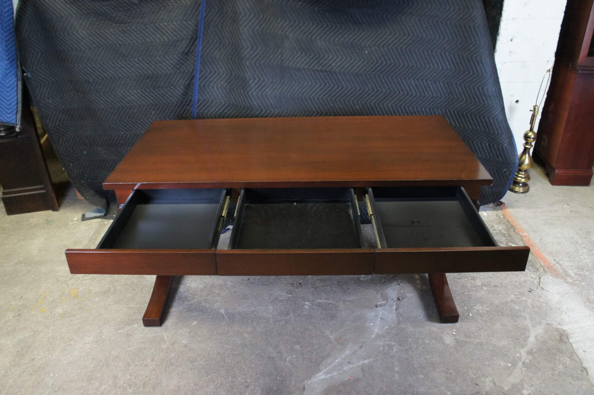 Vintage writing desk in the style of Michael Vanderbyl for Decca / Bolier & Co. Made from rich mahogany veneers, having a rectangular form with three fitted drawers and raised on modern curule x form legs.