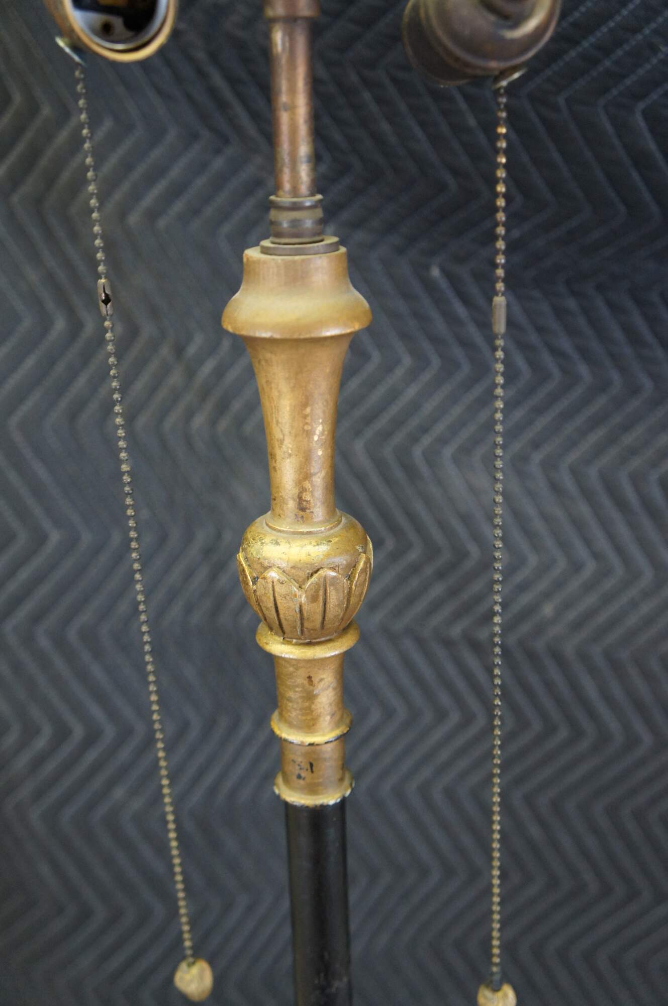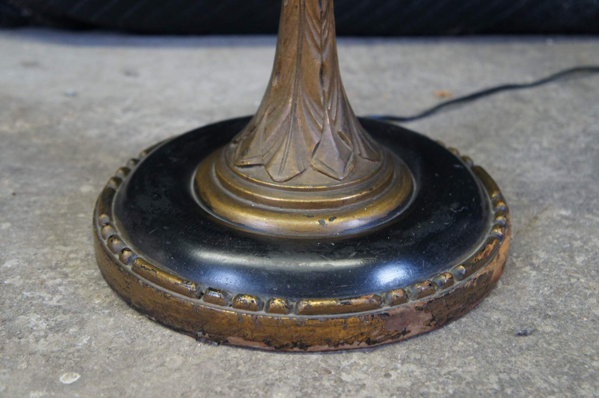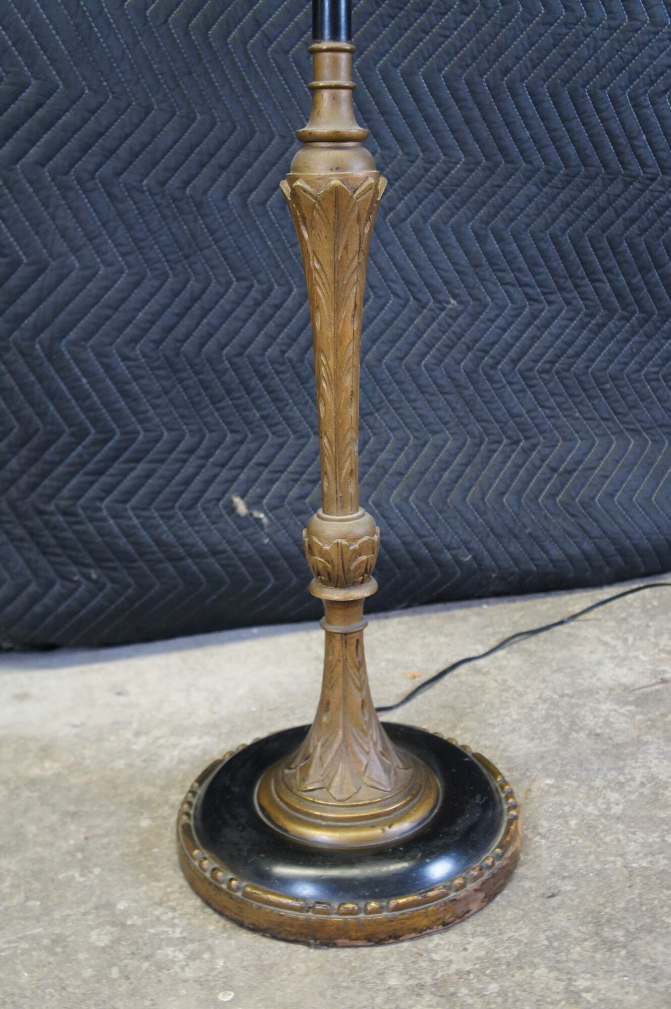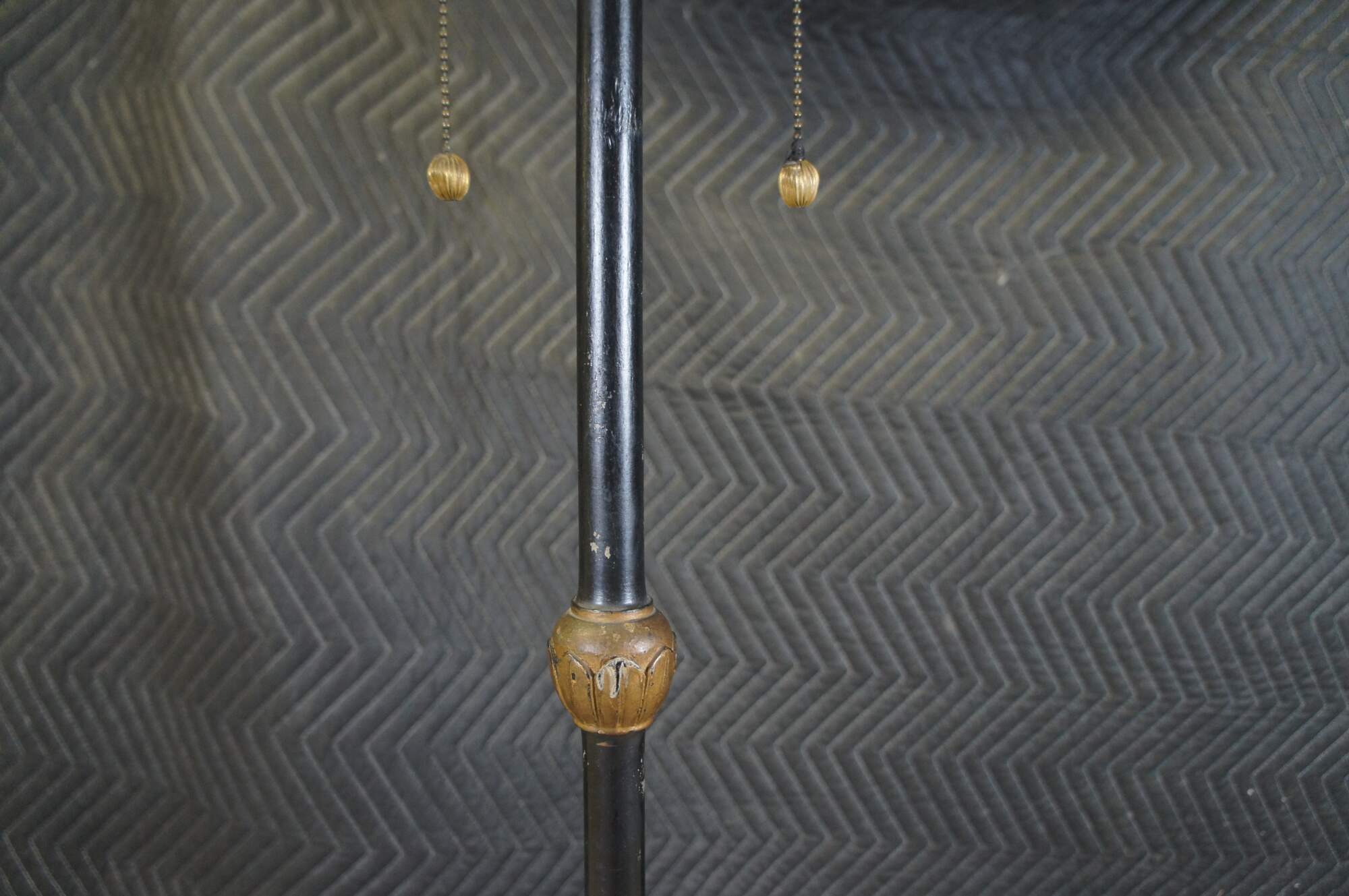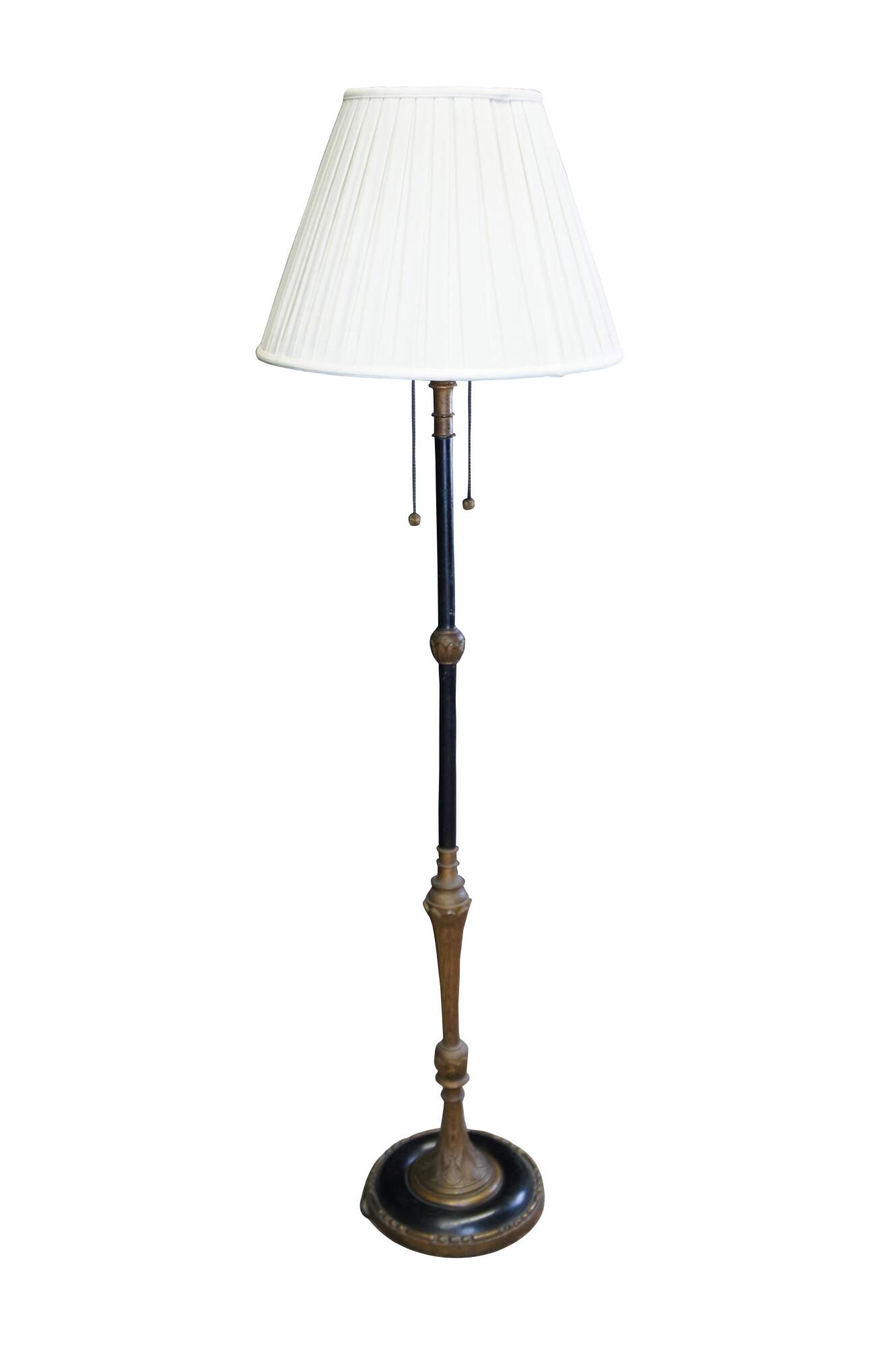 Mid century French Empire style library / reading floor lamp. Made of ebonized and gilt wood featuring acanthus design with two lights, long pull chains and tapered shade.
