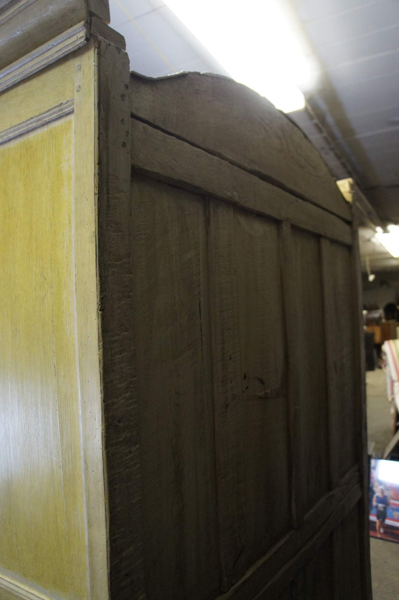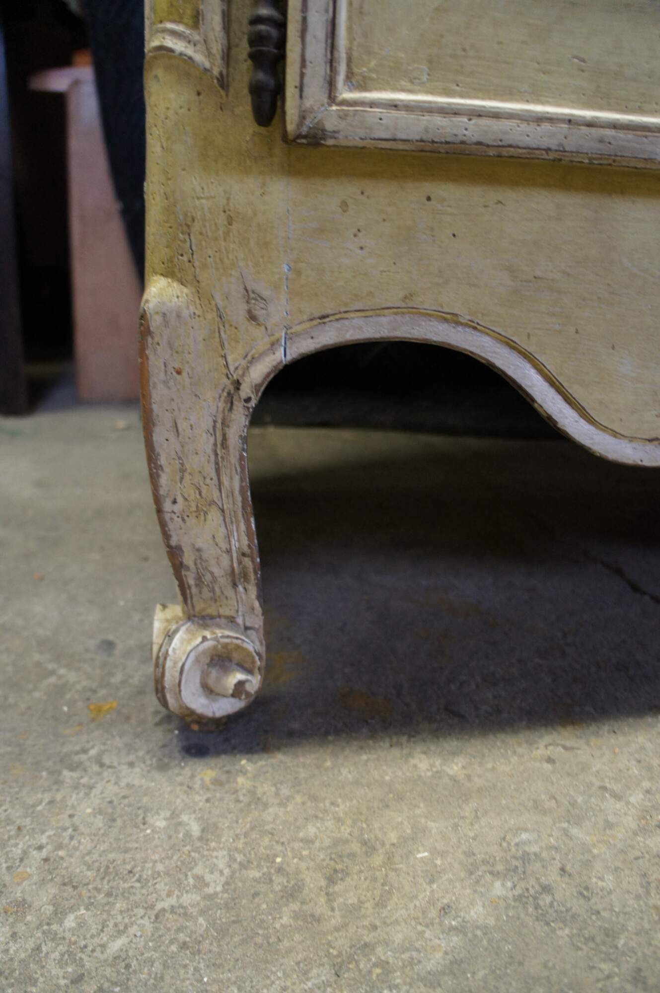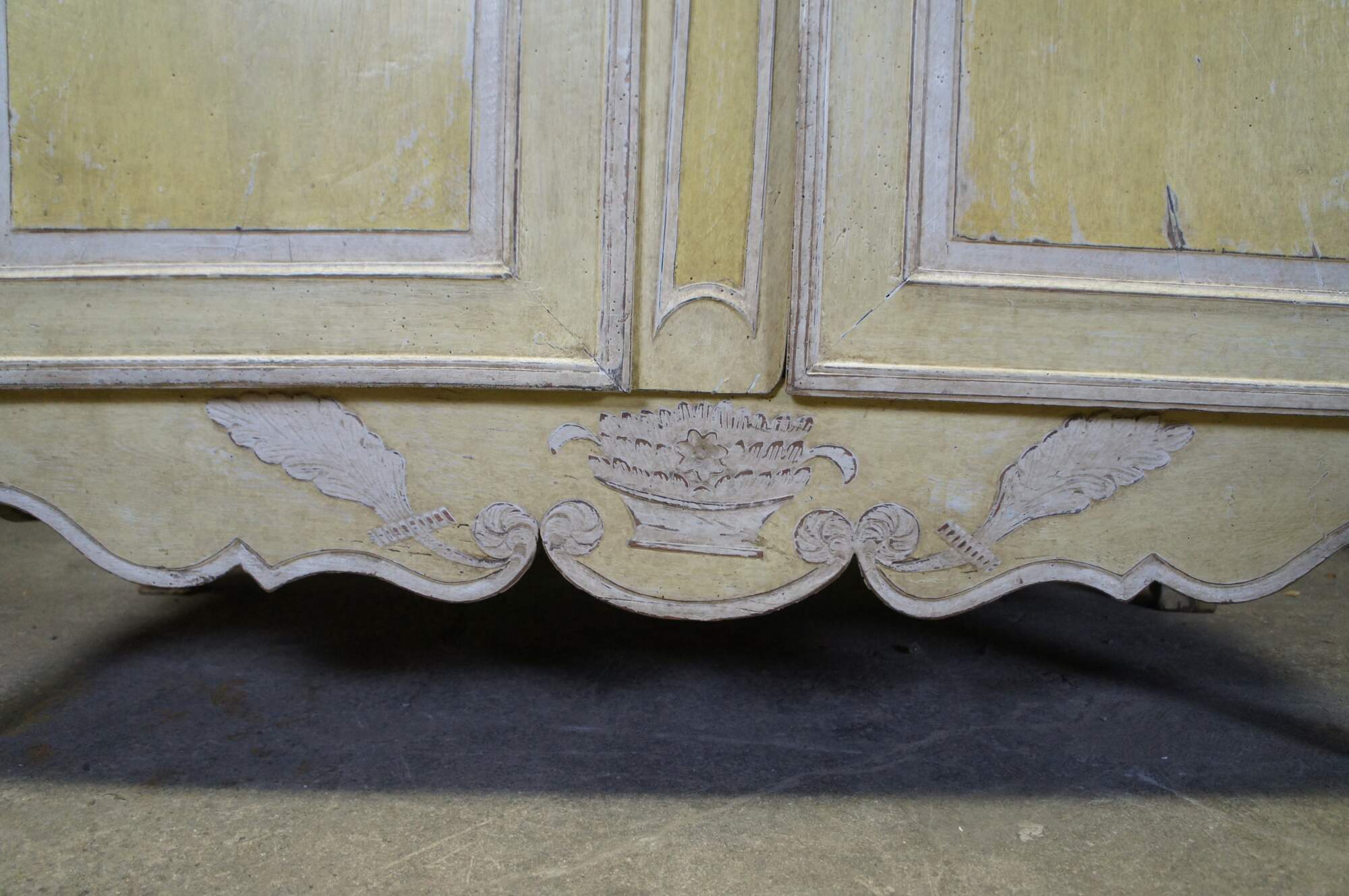 Antique late 18th Century French armoire. Featuring a blend of Country French and Provincial styling with floral and acanthus accents, chicken wire drape doors with long iron hinge, and cabriole legs. Opens to blue painted interior with four shelves and optional linen drapes to cover doors.