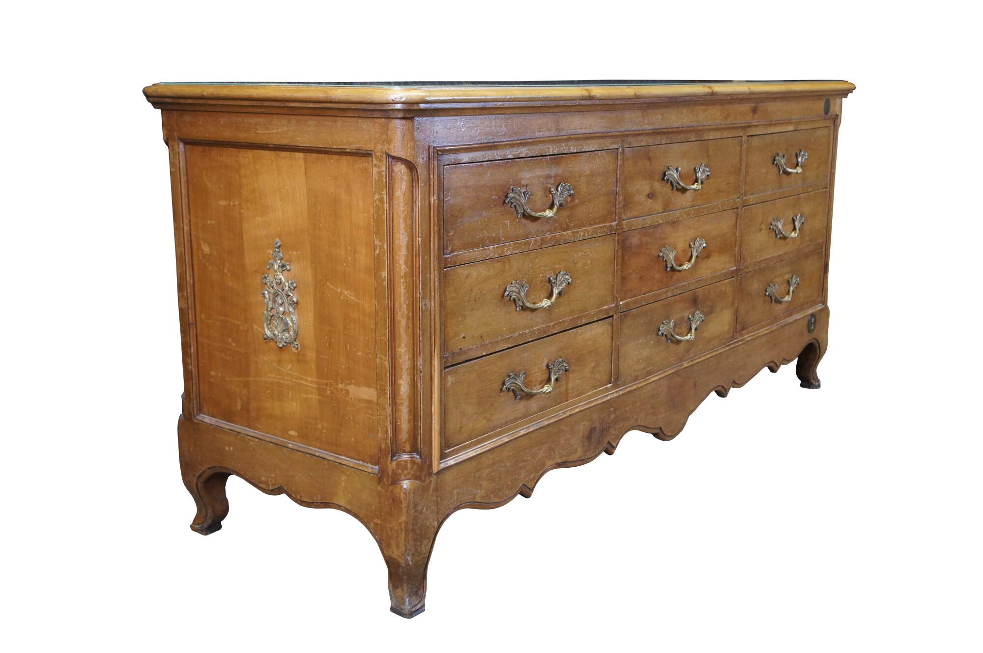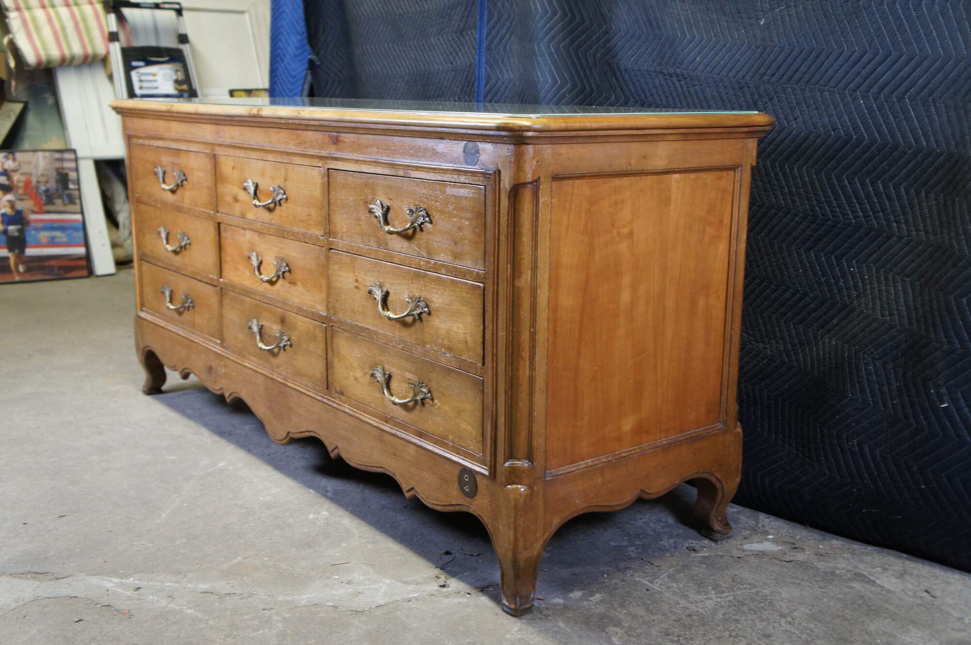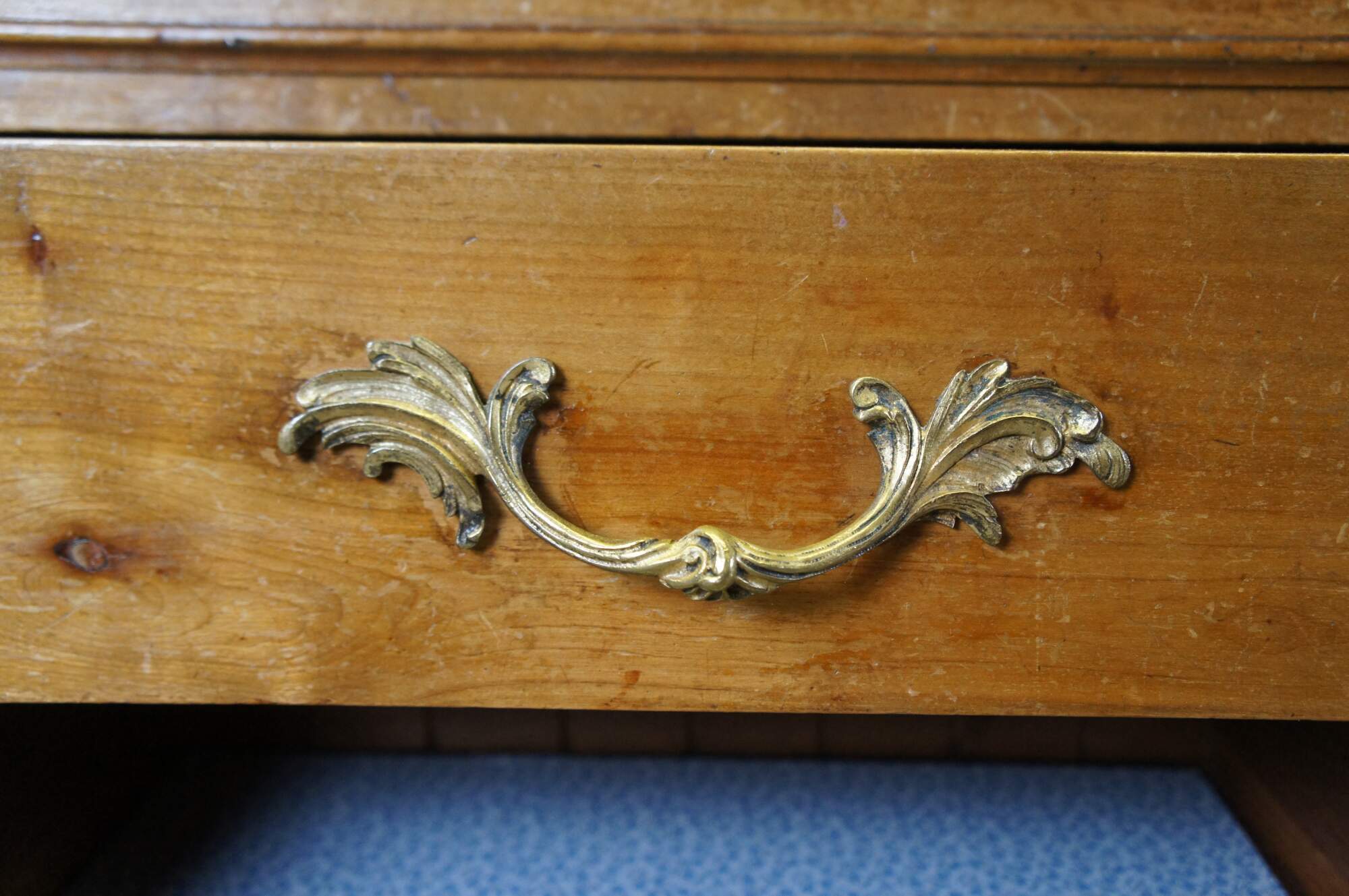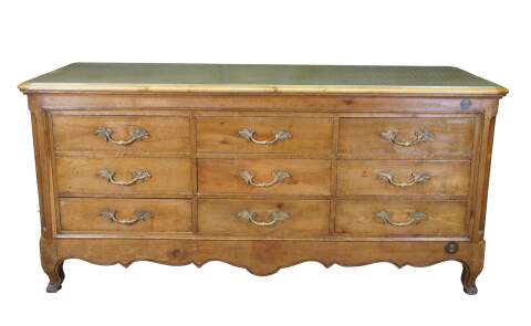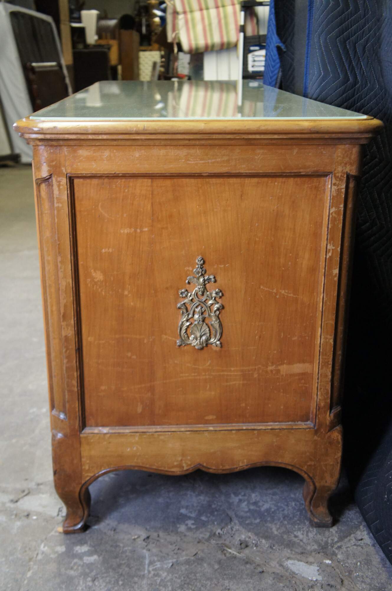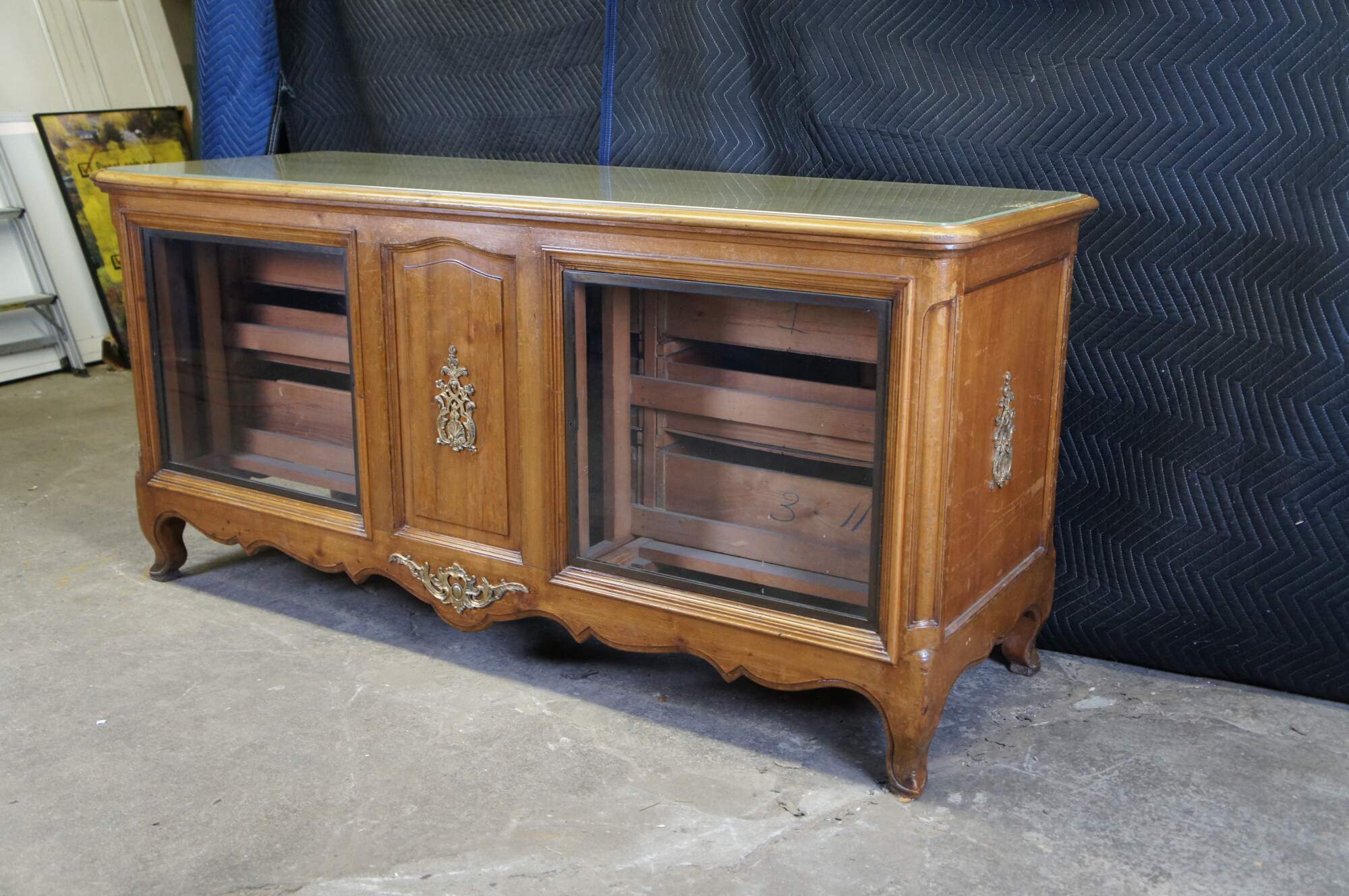 Antique French Country converted / double sided general store / mercantile curio showcase / display counter / dresser. Made of walnut featuring rectangular form with a nine drawer dresser or chest of drawers opposite two cabinet doors lined in brass. The cabinet also features a heavy glass inset top, panels accented with brass floral acanthus medallions, and serpentine skirt over French legs.